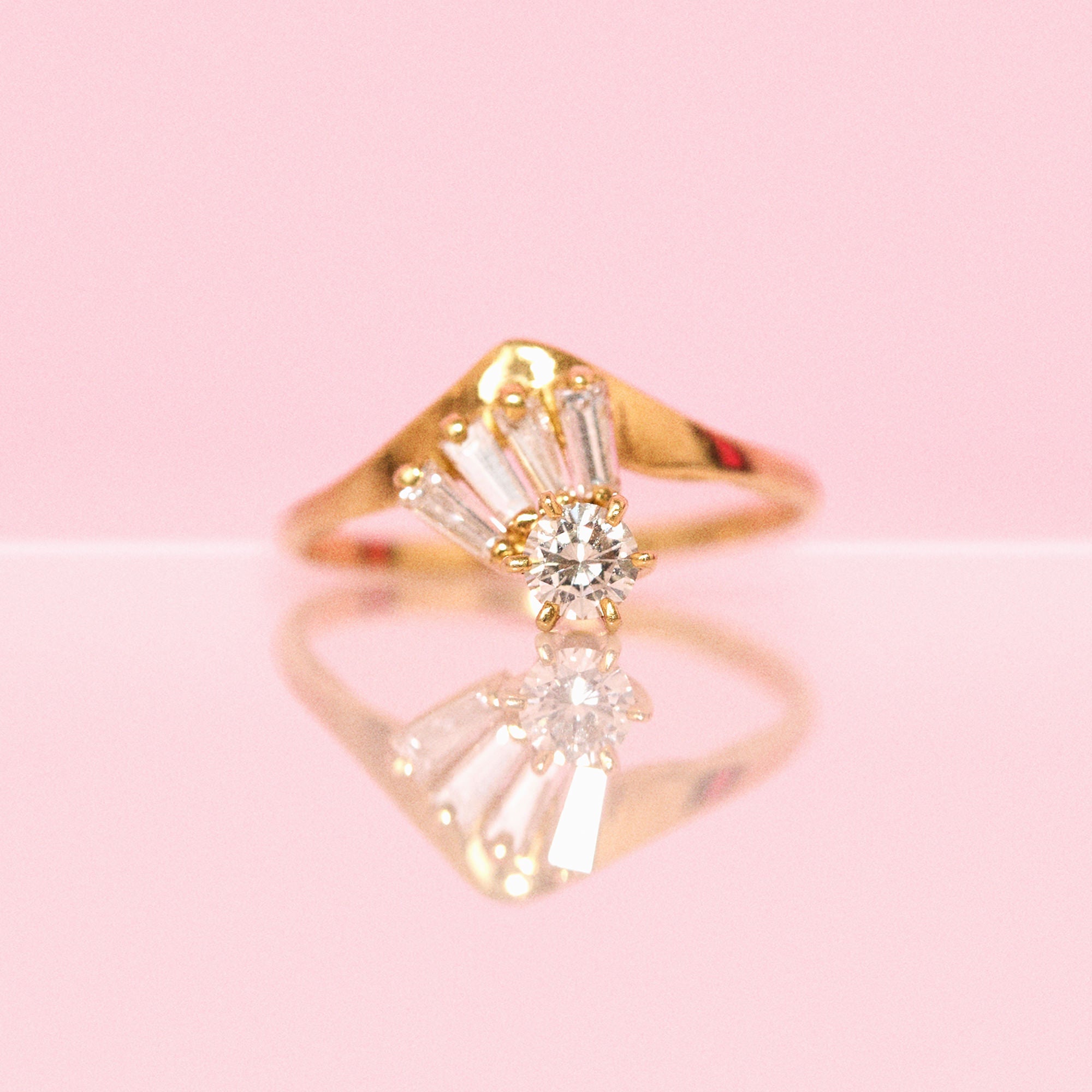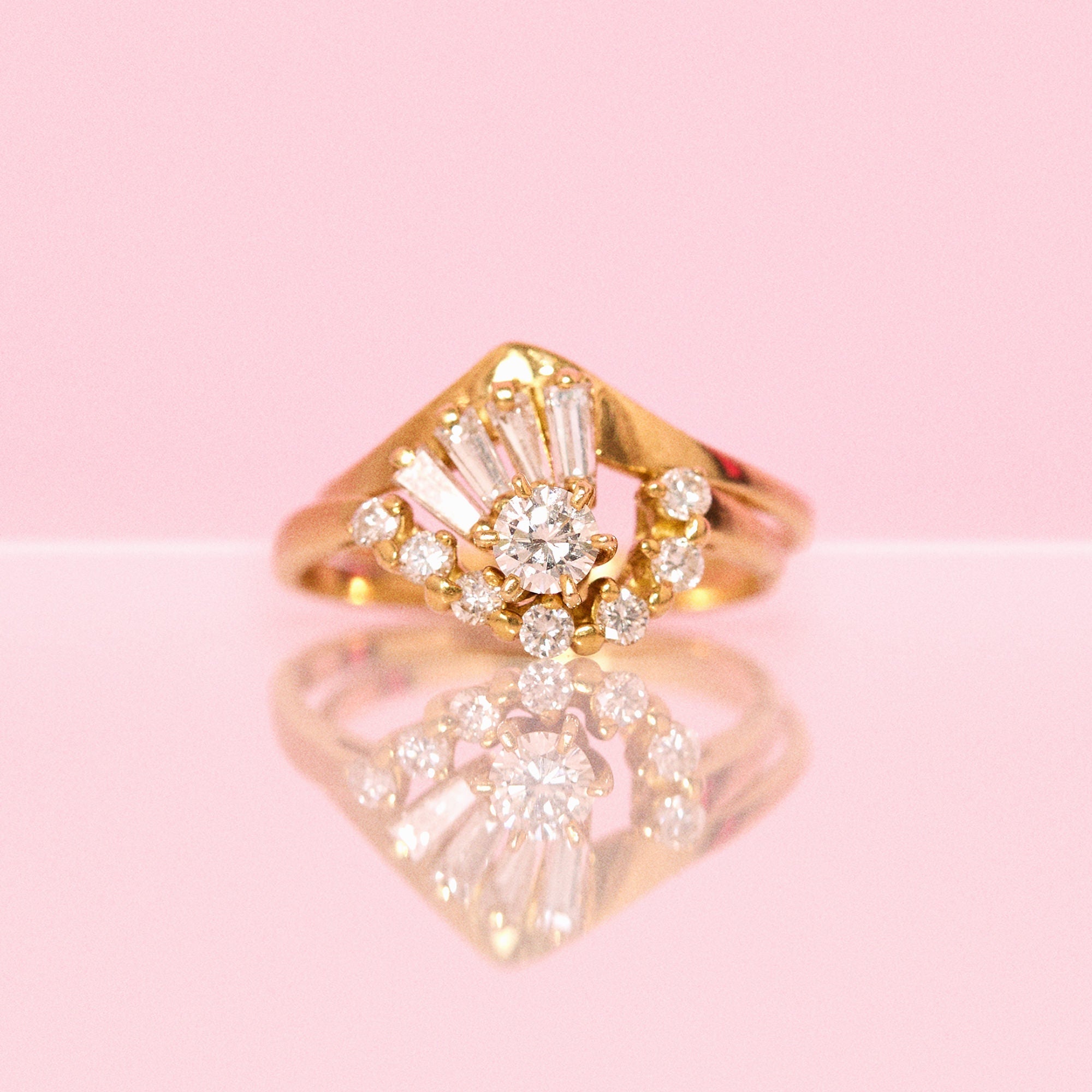 This exquisite ring set features a brilliant combination of baguette and round diamonds, totaling approximately 0.75 carats. The diamonds are beautifully arranged in a design that radiates elegance and sophistication, making this piece a timeless addition to any jewelry collection. Crafted from solid 18ct yellow gold, the ring is both luxurious and durable, ensuring it will be cherished for years to come. The ring is a size Q and is stamped, confirming its authenticity and quality.