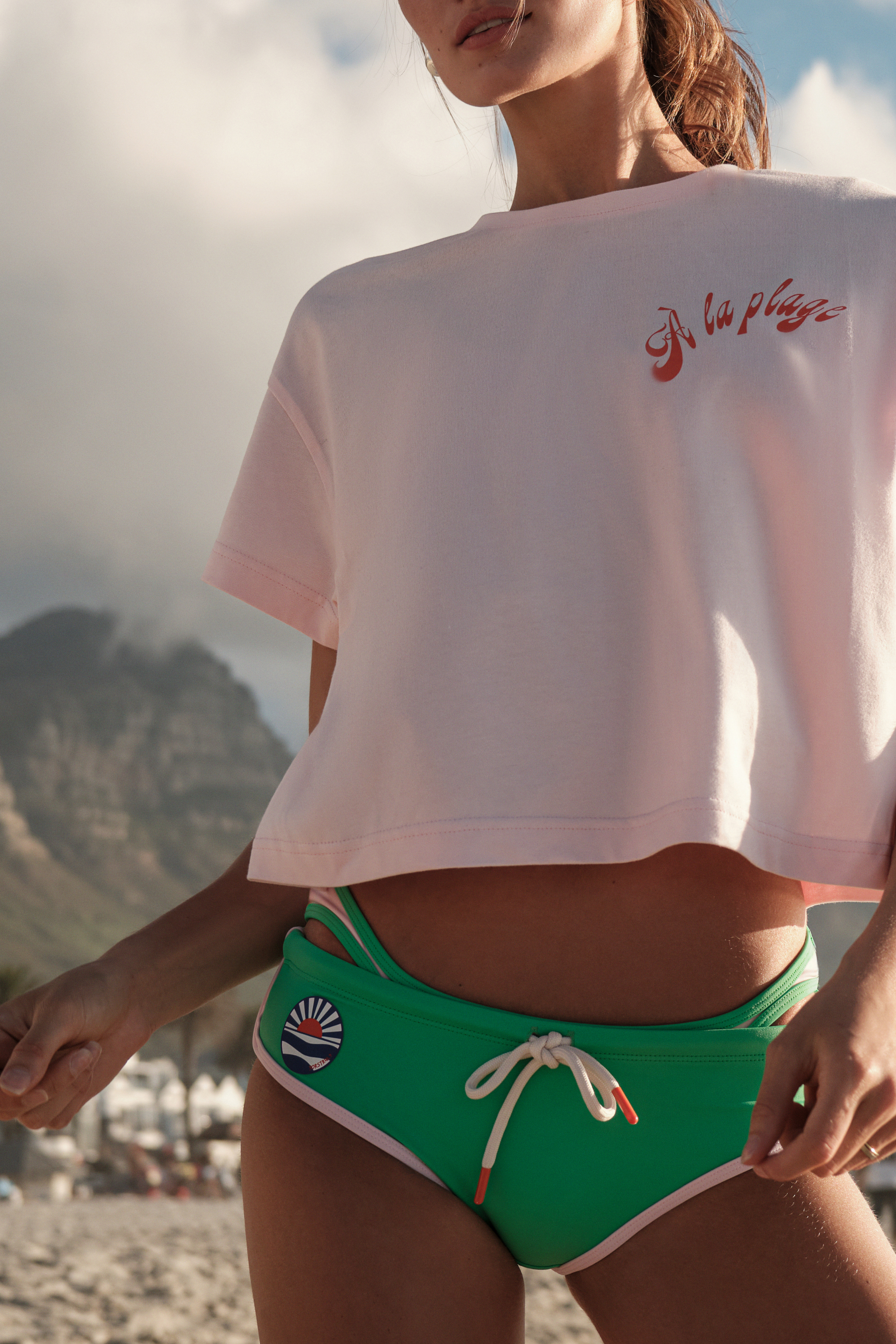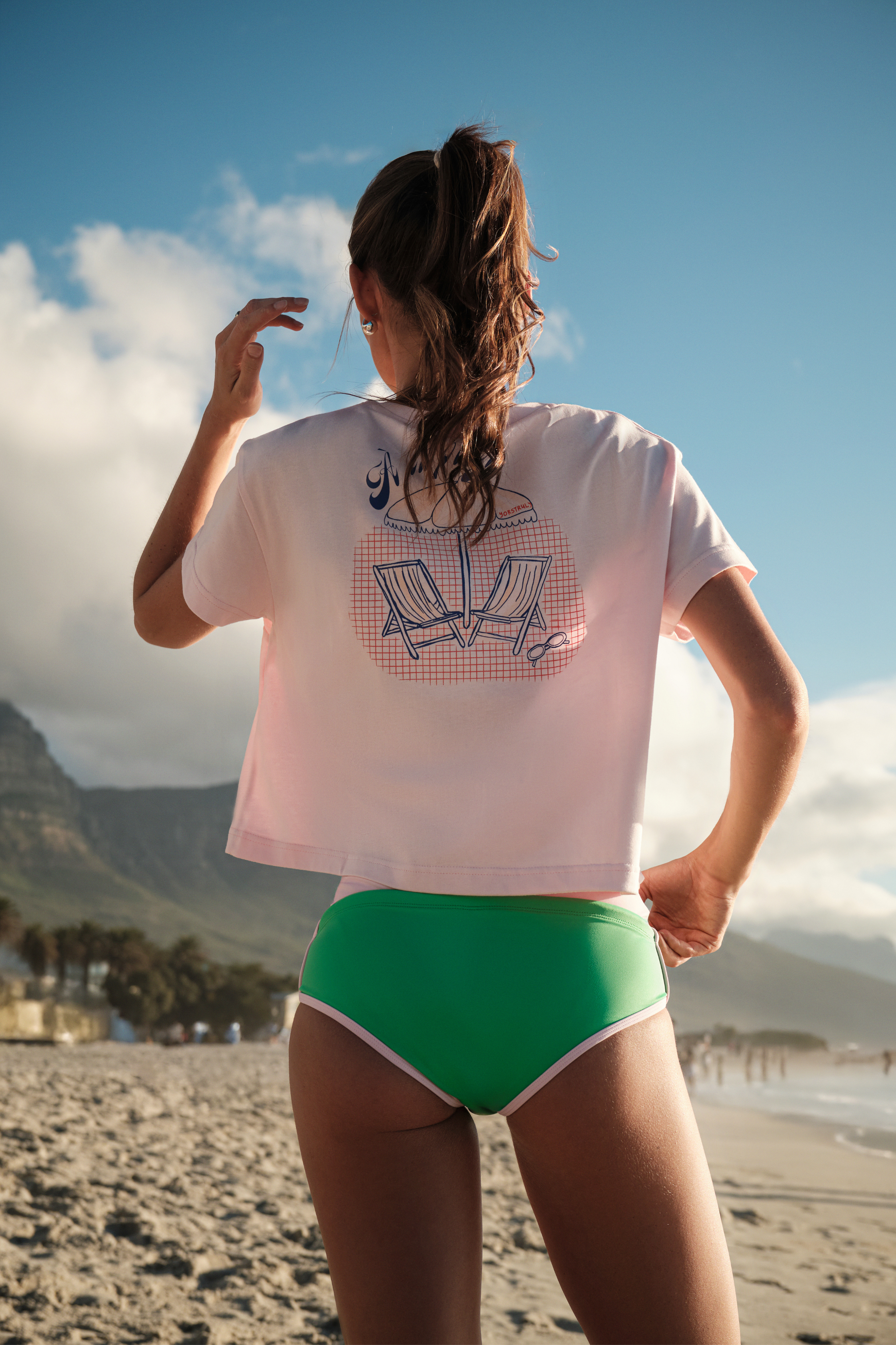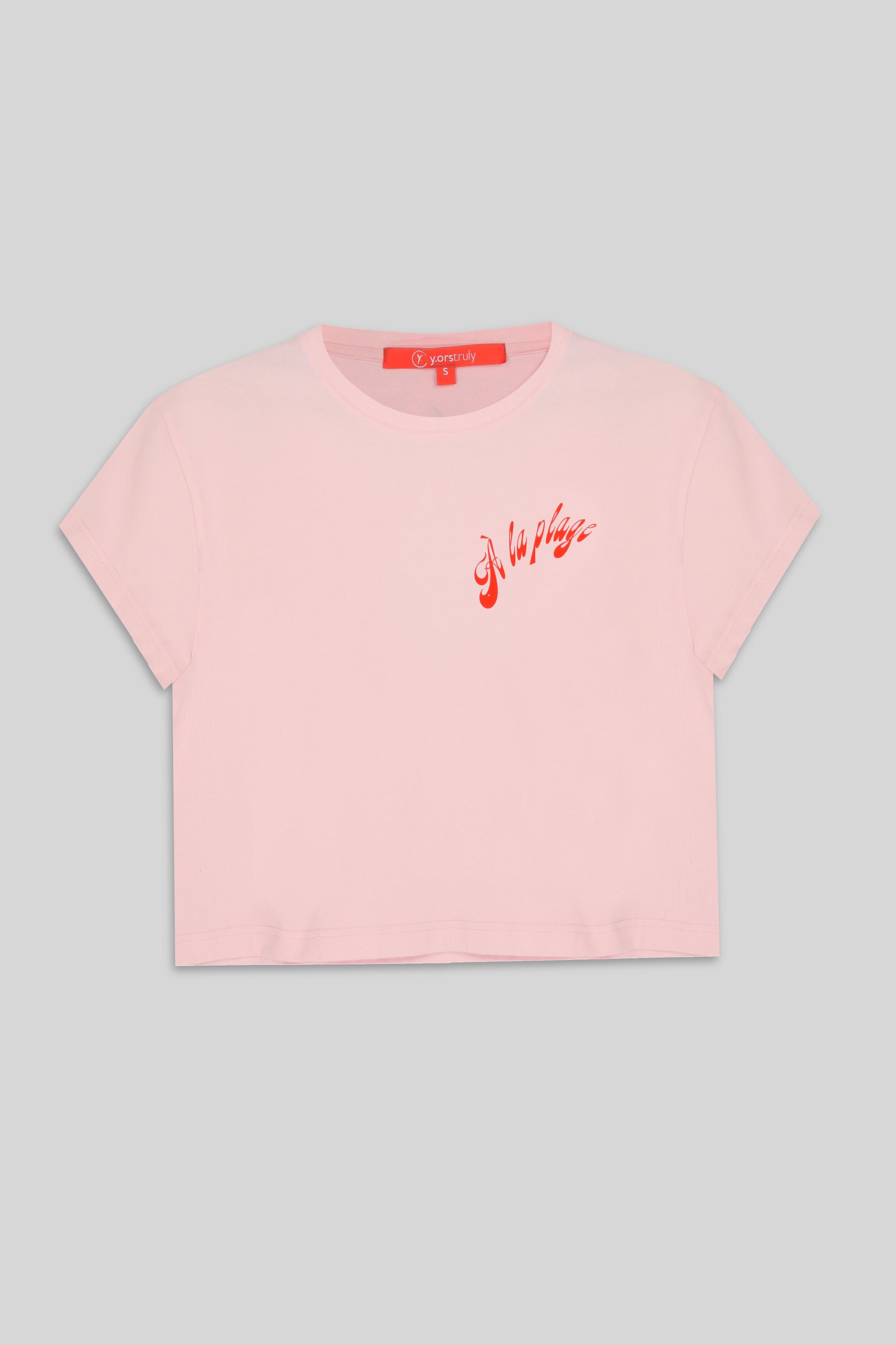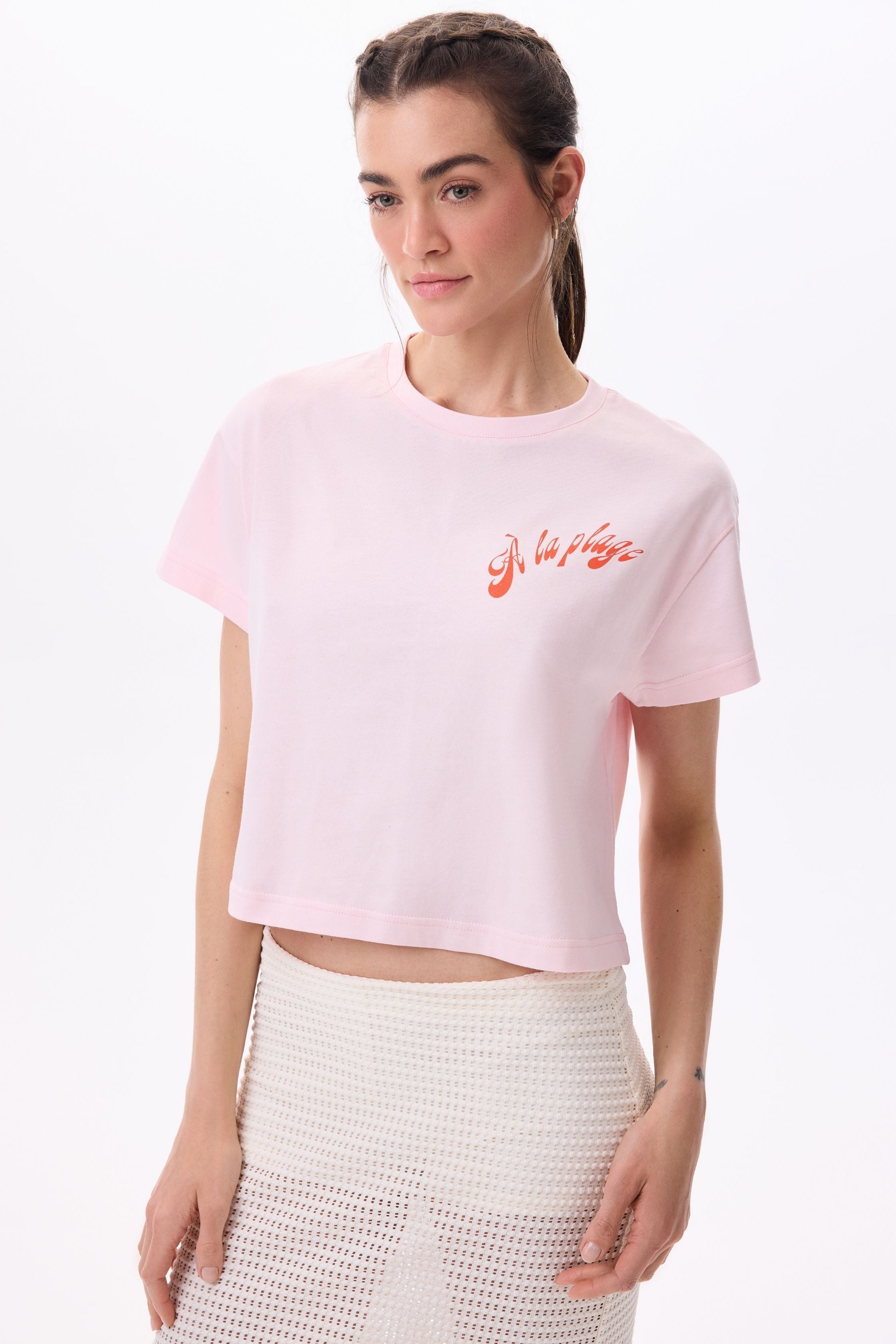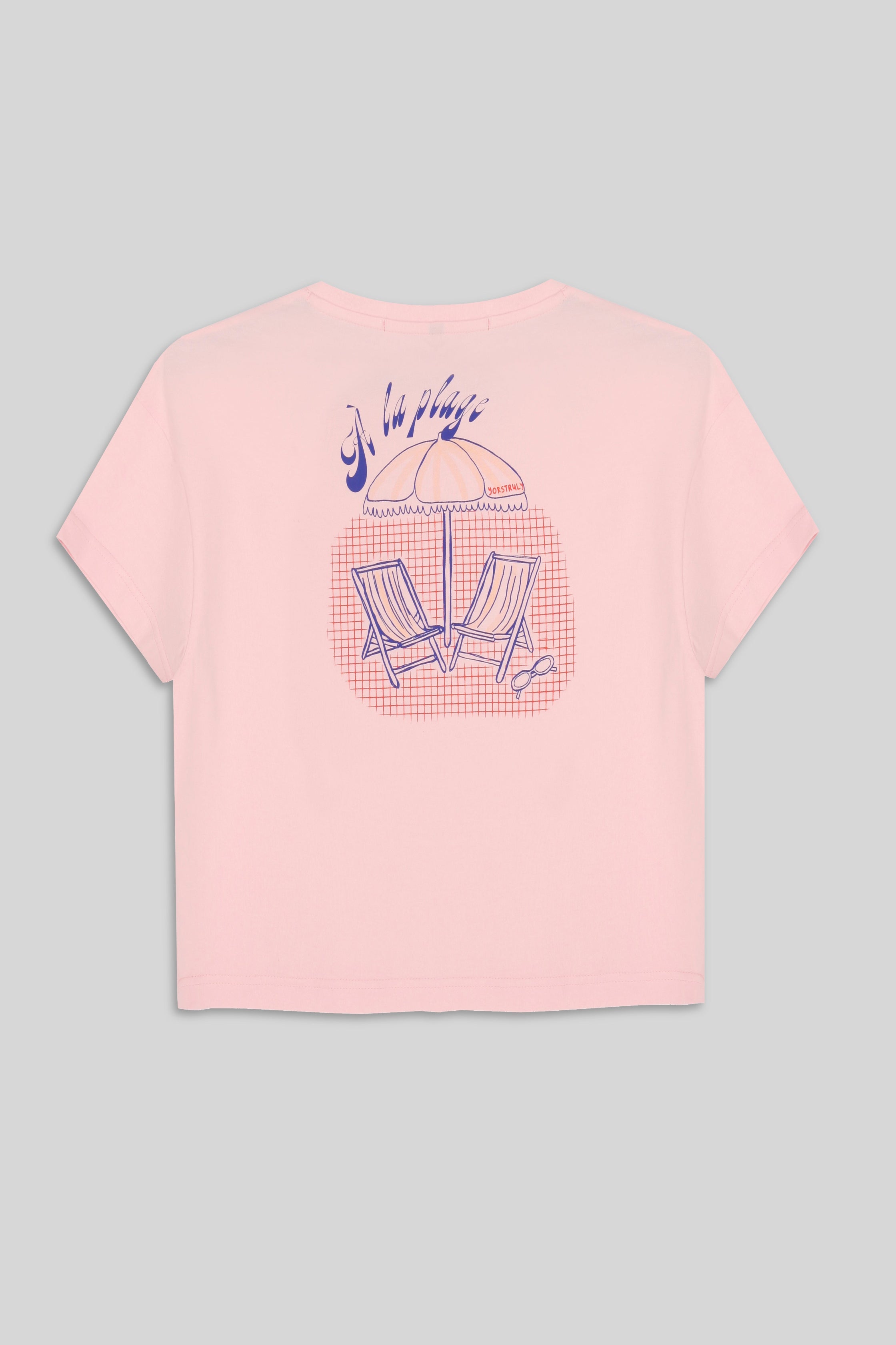 It has a slightly oversized and cropped fit. It has a crew neck, but it doesn't touch your neck, it's about one finger below. Made from 100% cotton with a soft fabric. The print is in a vibrant tone. On the left chest, there's the text 'A LA PLAGE,' and on the back, we have a design featuring a beach chair and umbrella, reminiscent of the beach.