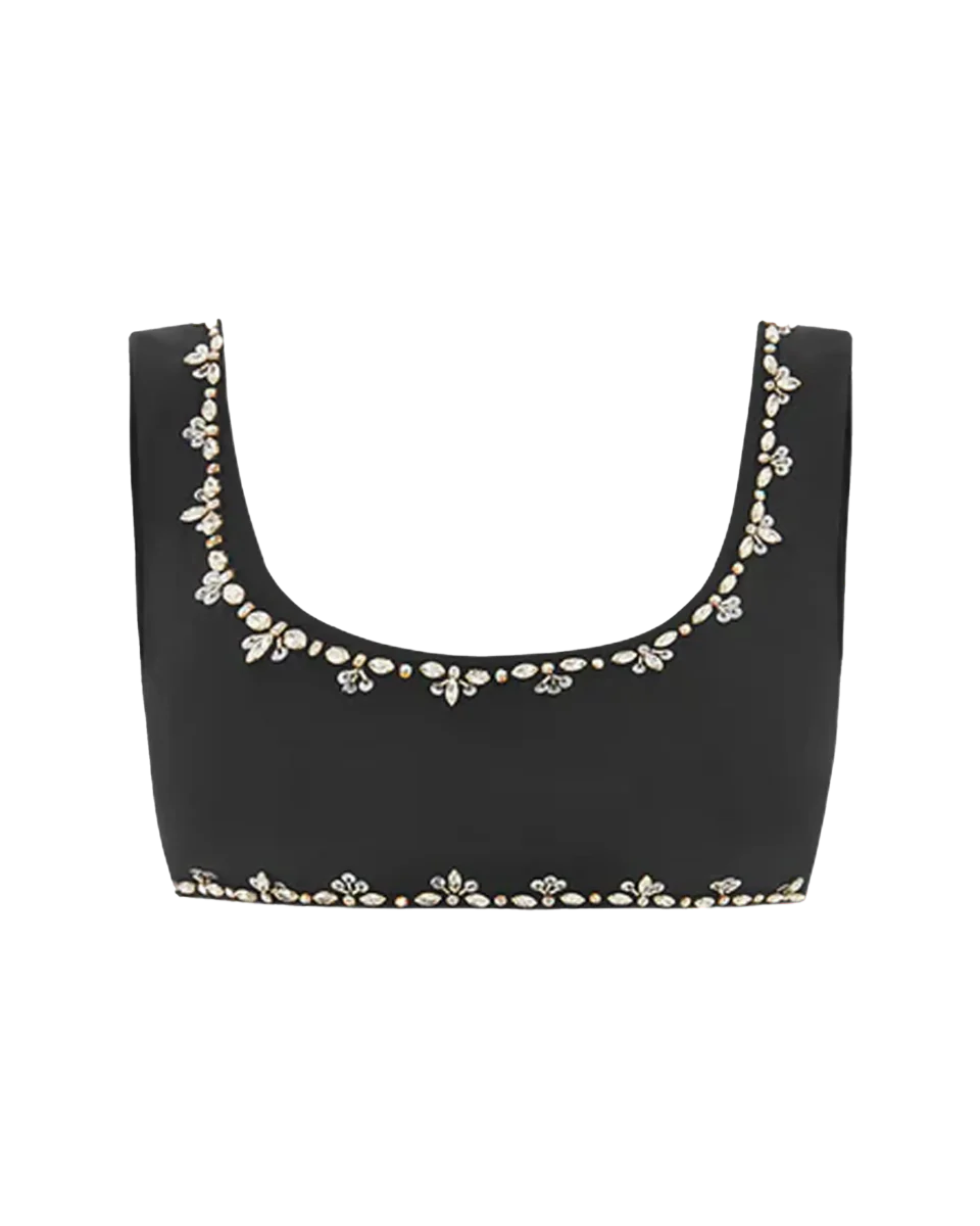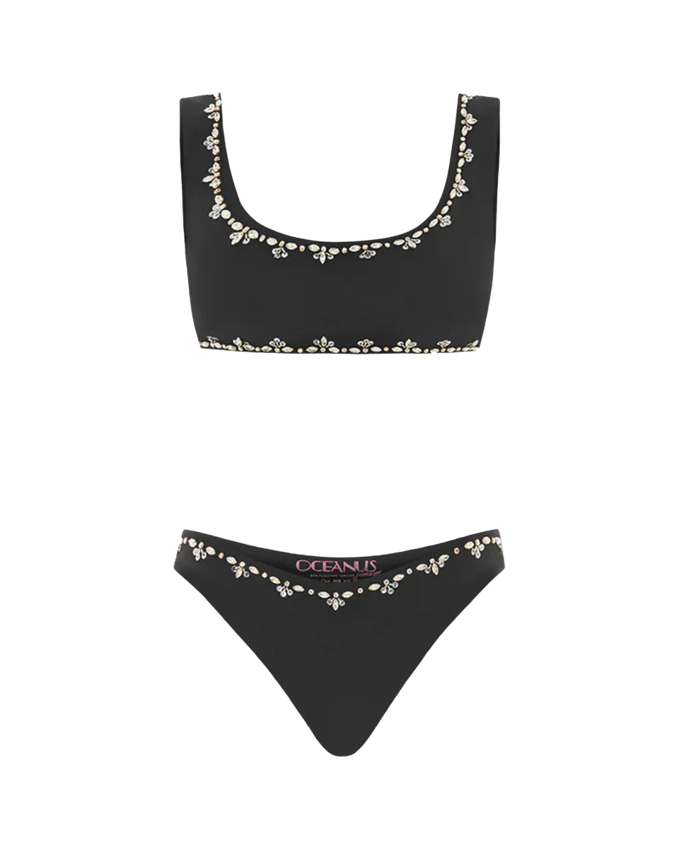 The Aaliyah Black Bikini Top is a classic Oceanus design, made from butter-soft eco-friendly Italian lycra. Featuring hand-beaded crystal trims, this luxury bikini top offers a glamorous yet sustainable swimwear option for women who love chic poolside and beachwear style.