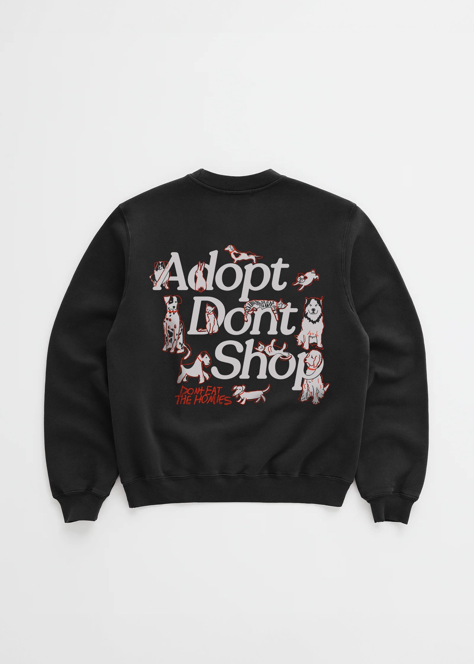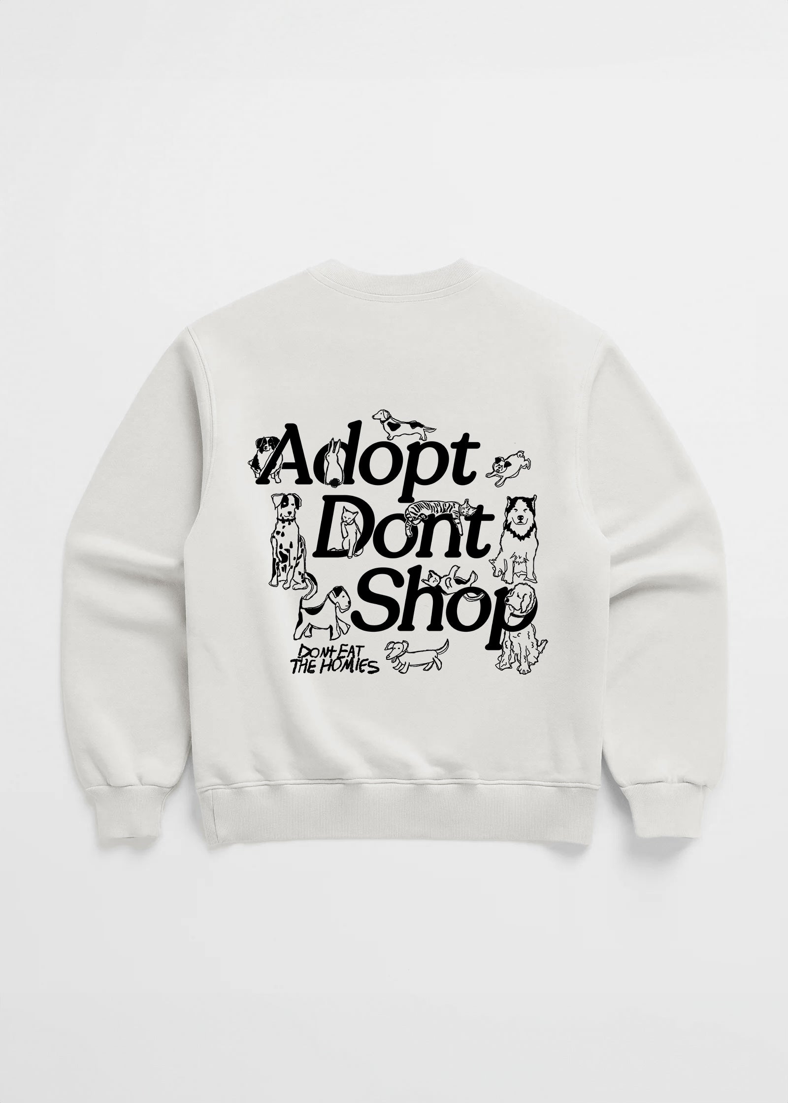 Our Adopt Dont Shop Crewneck features a classic fit and midweight feel for everyday wear - all year long. This crewneck features our best-selling Adopt Dont Shop graphic. The unisex fit & soft brushed fleece fabric is perfect for everyday wear and is designed with fashion, comfort, and the planet in mind. Made with 80% cotton and 20% recycled polyester.
