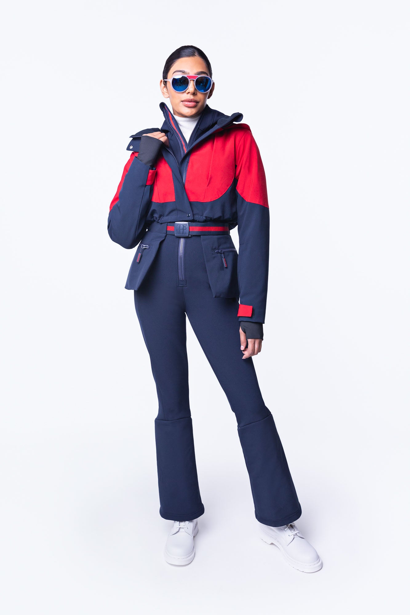 Upgrade your fanny pack to a far more flattering option for carrying your slopeside necessities. The Aerial peplum belt is designed to wear on its own or in conjunction with the Freestyler. The peplum is cut from Schoeller® 4-way stretch waterproof shell and is insulated with Primaloft® Gold 80 gram fill. It features two front zipper pockets and one back zipper pocket for storing credit cards, a trail map, a smaller smart phone, car keys, and slope snacks. The belt is made from high strength red and navy striped webbing with an adjustable branded buckle that stands up to sleet and snow. Tuck in any extra belt length through the side slit on the belt tunnel’s left side.