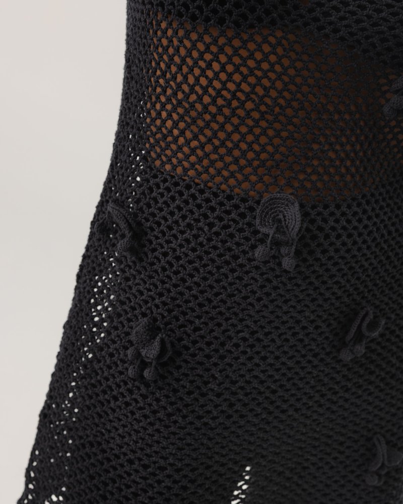 Aguonos (Eng. "poppies") Set is a tribute to slow fashion and craftsmanship, combining a hand-crocheted outer layer with a flowing linen underdress made in collaboration with Not Perfect Linen. The sheer cotton crochet features blooming 3D florals and couture chain stitches, taking 43 hours to complete, while the underdress is trimmed with delicate hand-crocheted “poppy seeds” along the side splits.