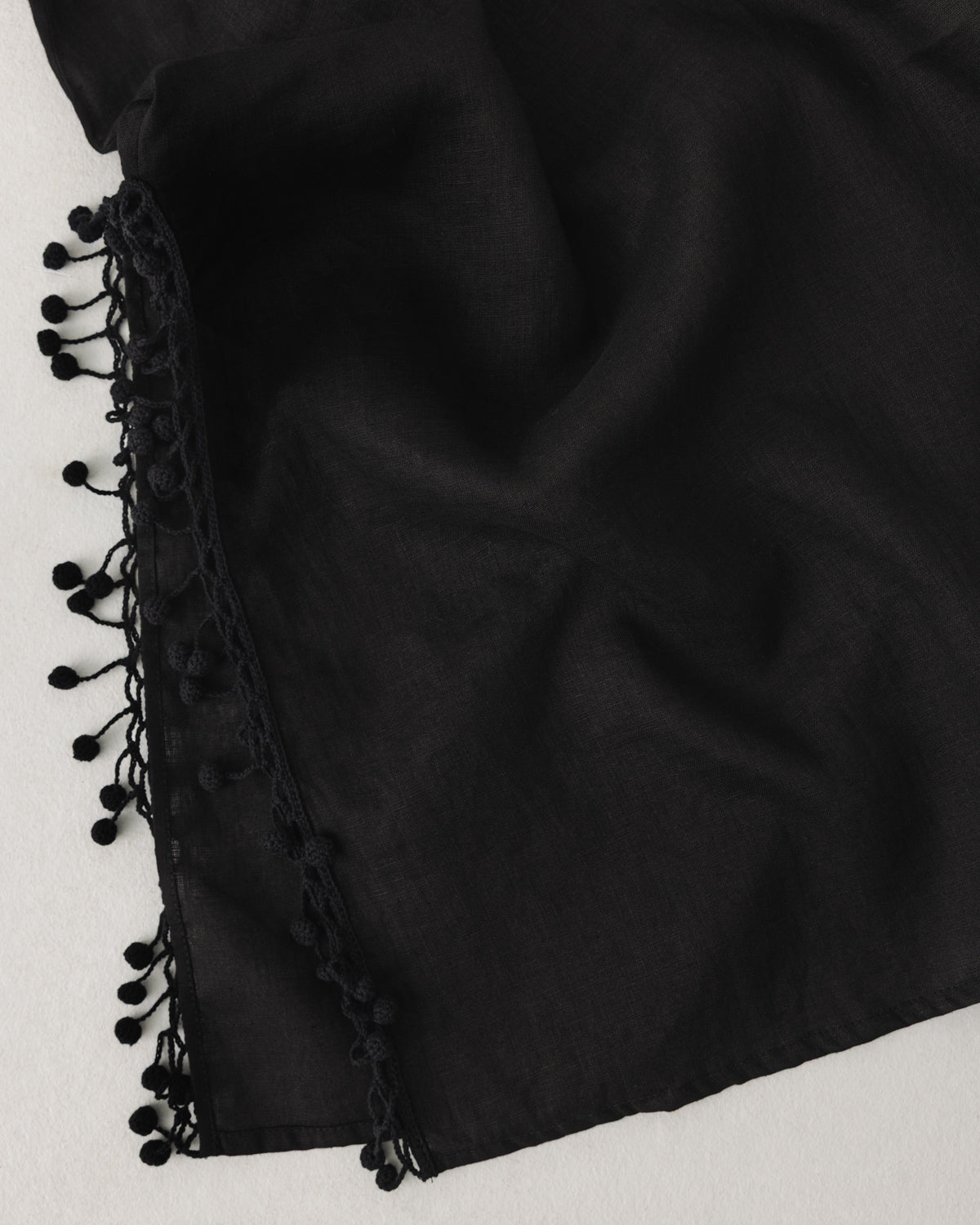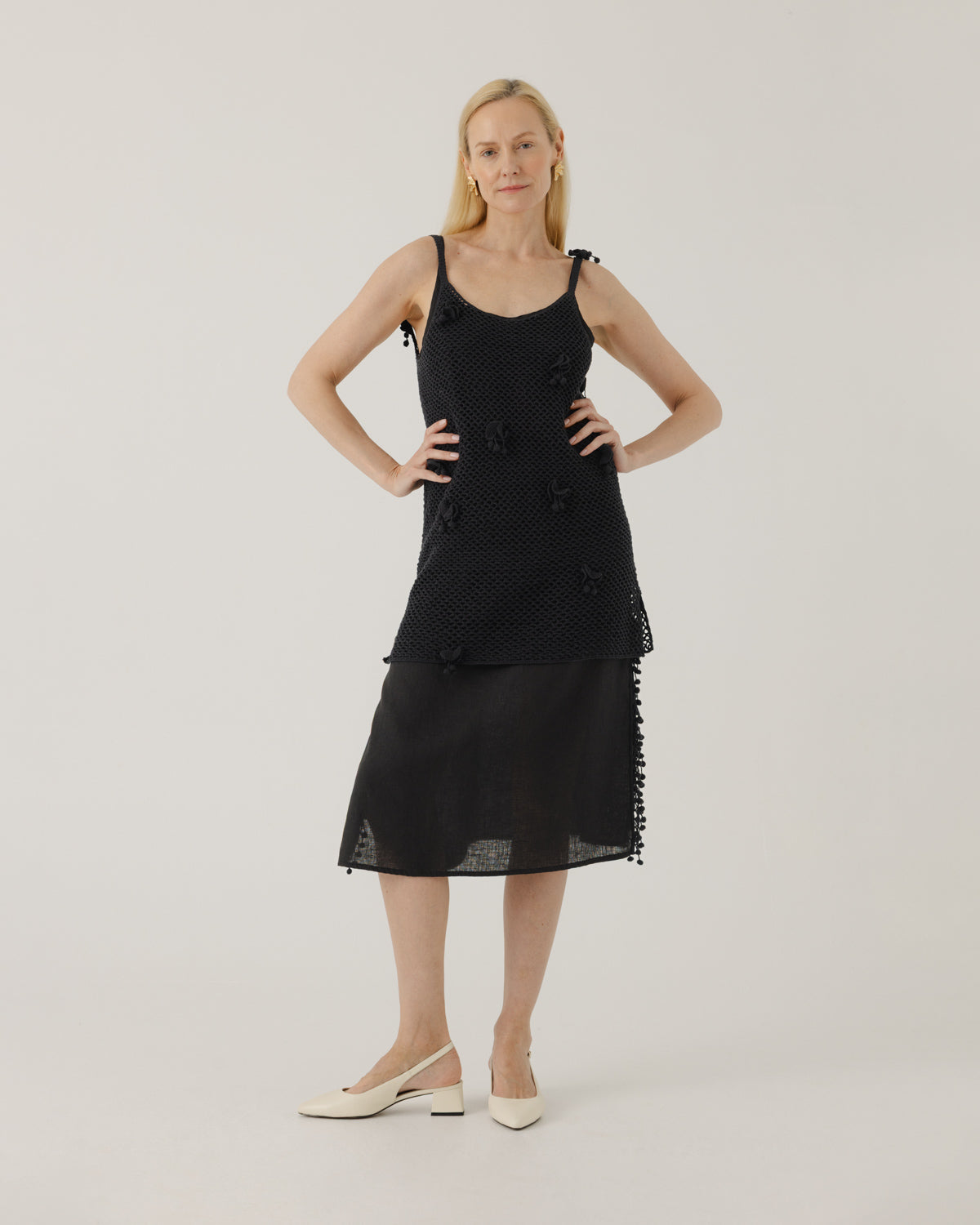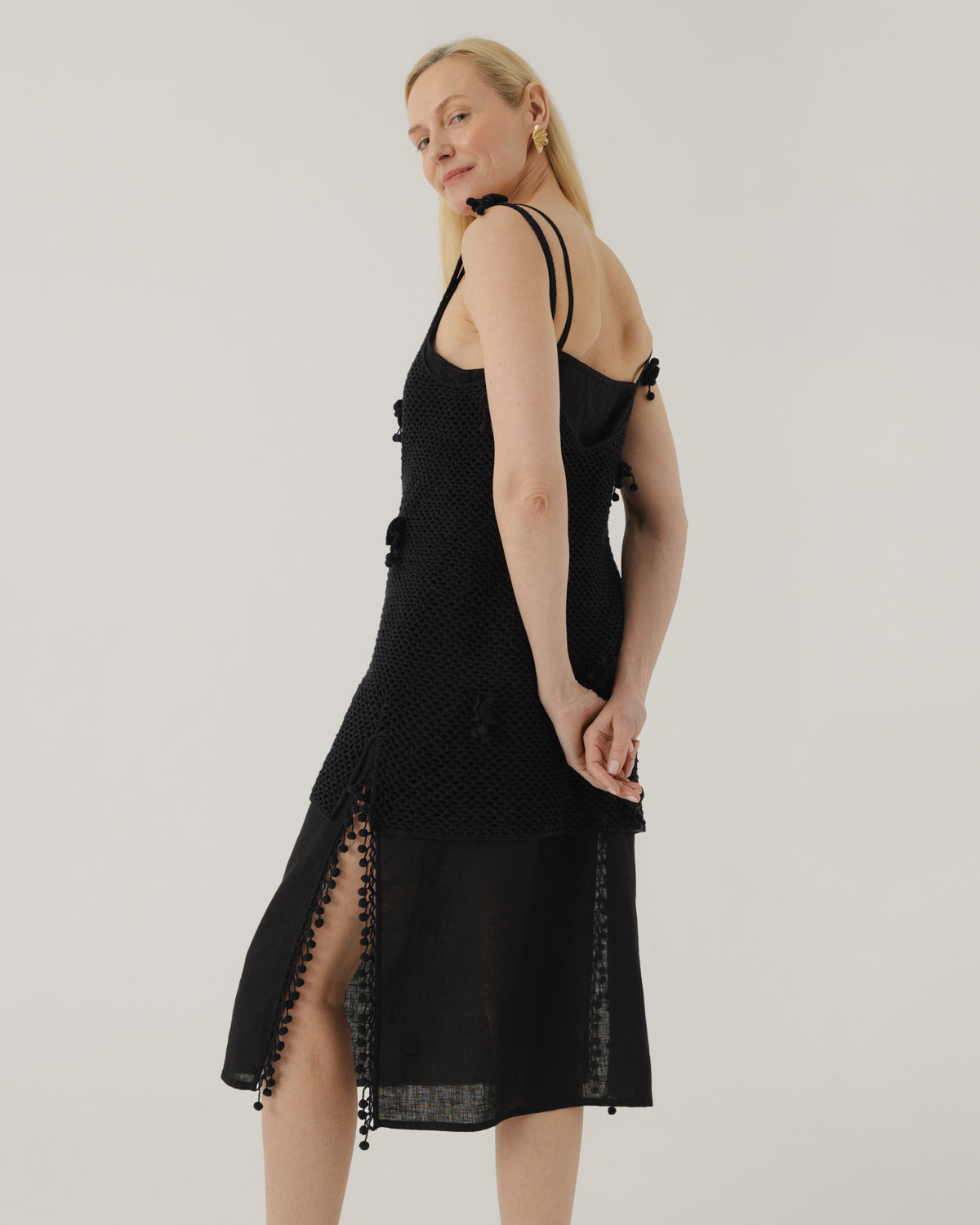 The linen dress is designed for joy and freedom of movement, with side splits trimmed in hand-crochet detailing that sways with every step — a subtle nod to scattered poppy seeds. Wear it on its own or paired with the crocheted outer layer for the full Aguonos look.