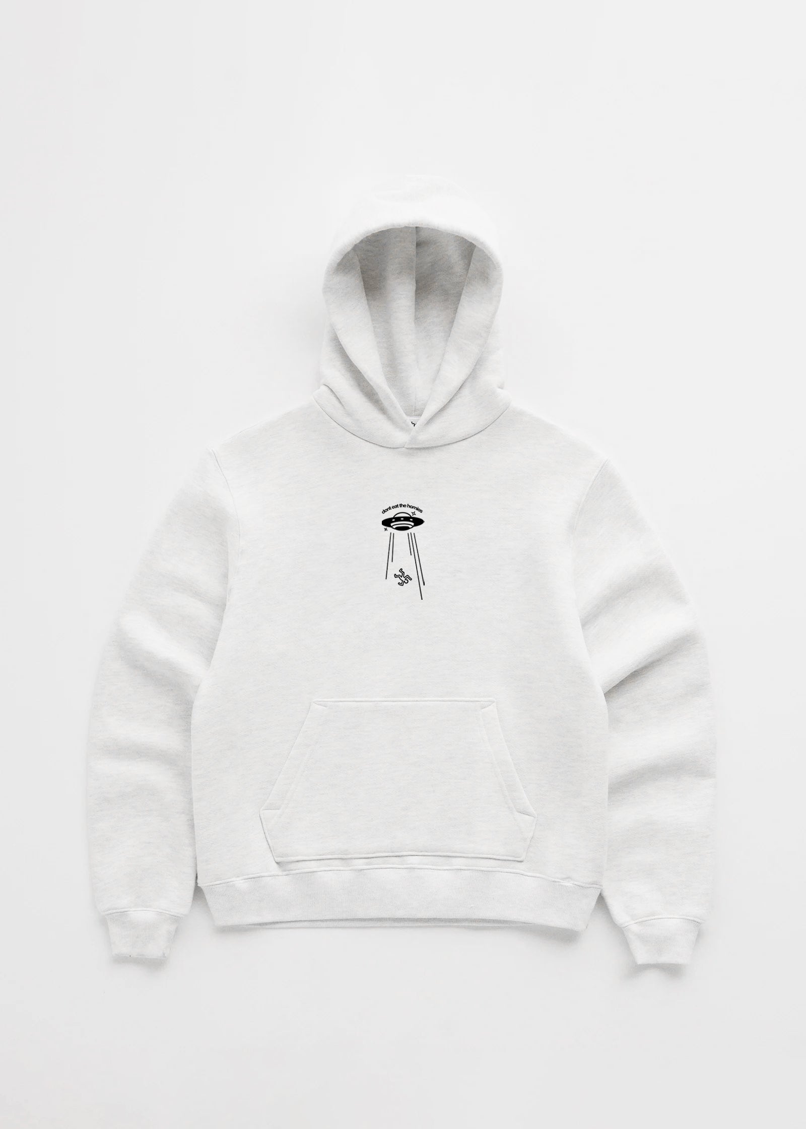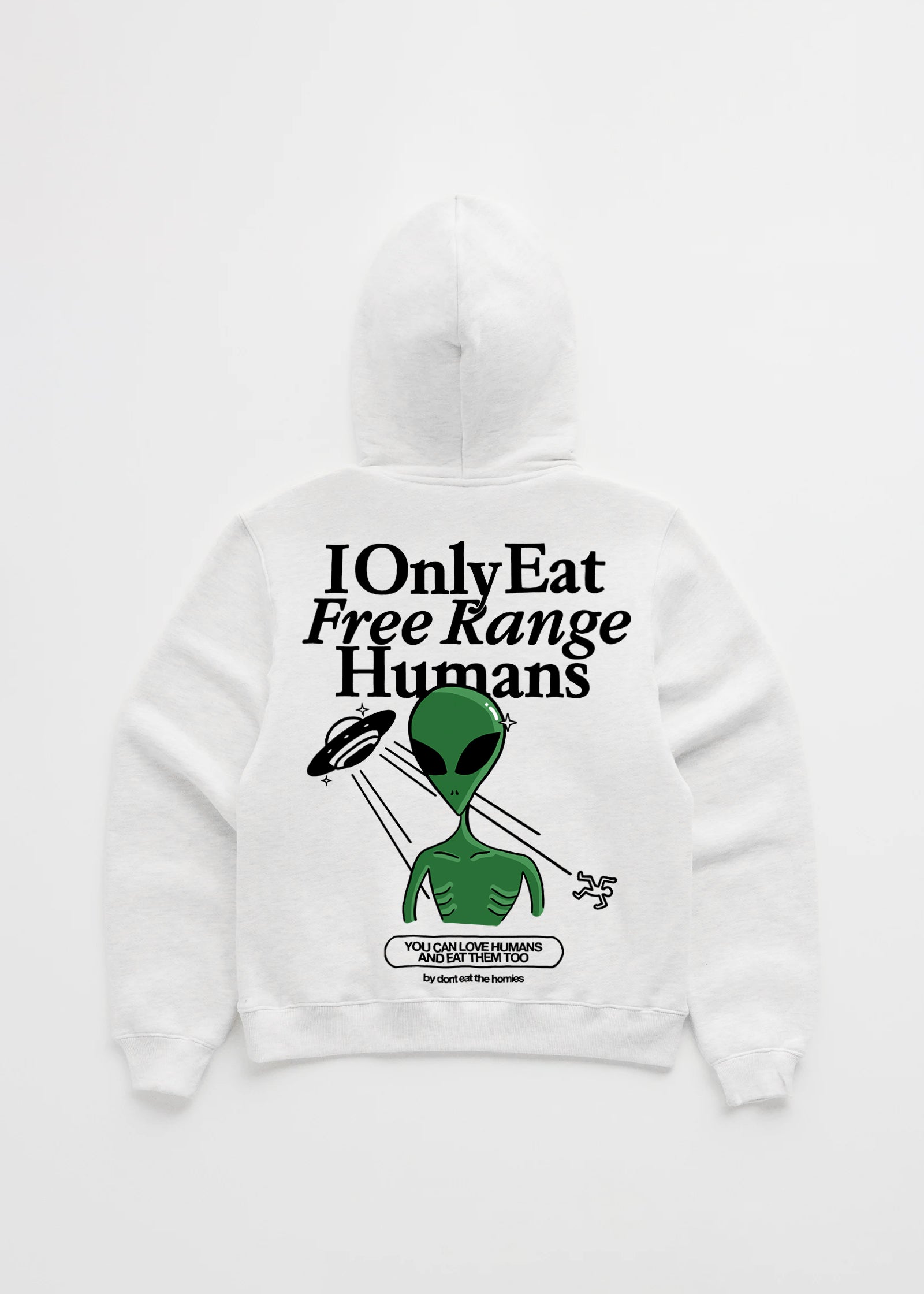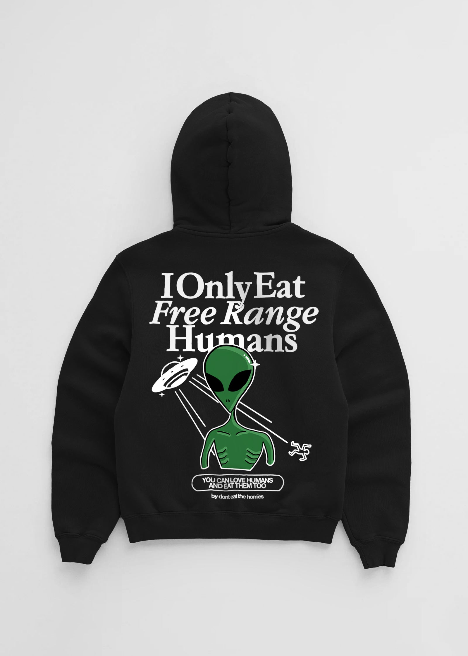 This hoodie features the "I Only Eat Free Range Humans" graphic on the center back and a smaller alien spaceship graphic on the center chest. Features kangaroo pocket, ribbed cuffs & hem. The unisex fit & soft brushed fleece fabric is perfect for everyday wear and is designed with fashion, comfort, and the planet in mind. Made with 20% recycled polyester from plastic bottles and 80% sustainably sourced cotton fibers. Global Recycling Standard & Oeko-Tex Standard 100 certified.