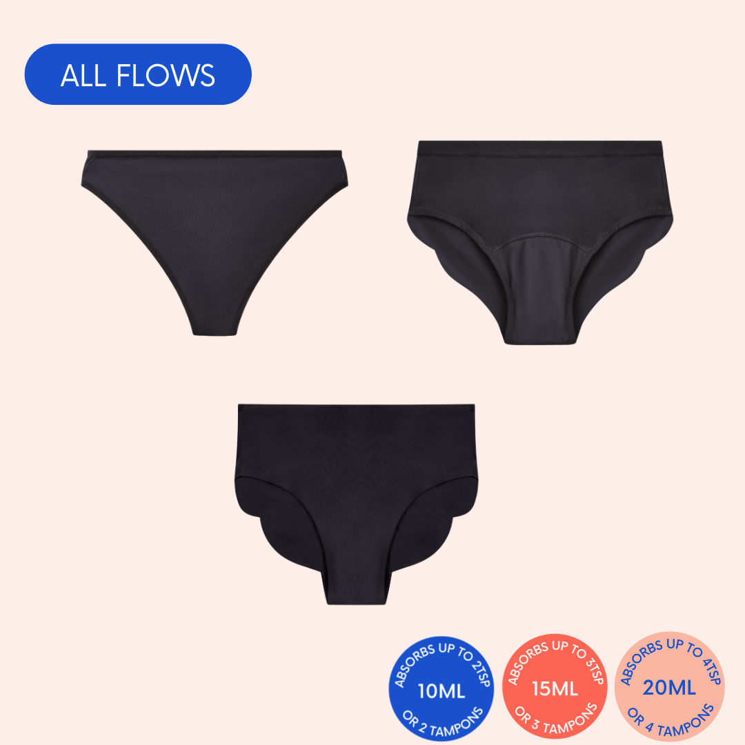 We know that when it comes to periods, every day and every cycle can be different. This bundle brings together our bestsellers in light, medium and heavy so however you’re flowing and wherever you’re going, you won’t be held back by leaks.
