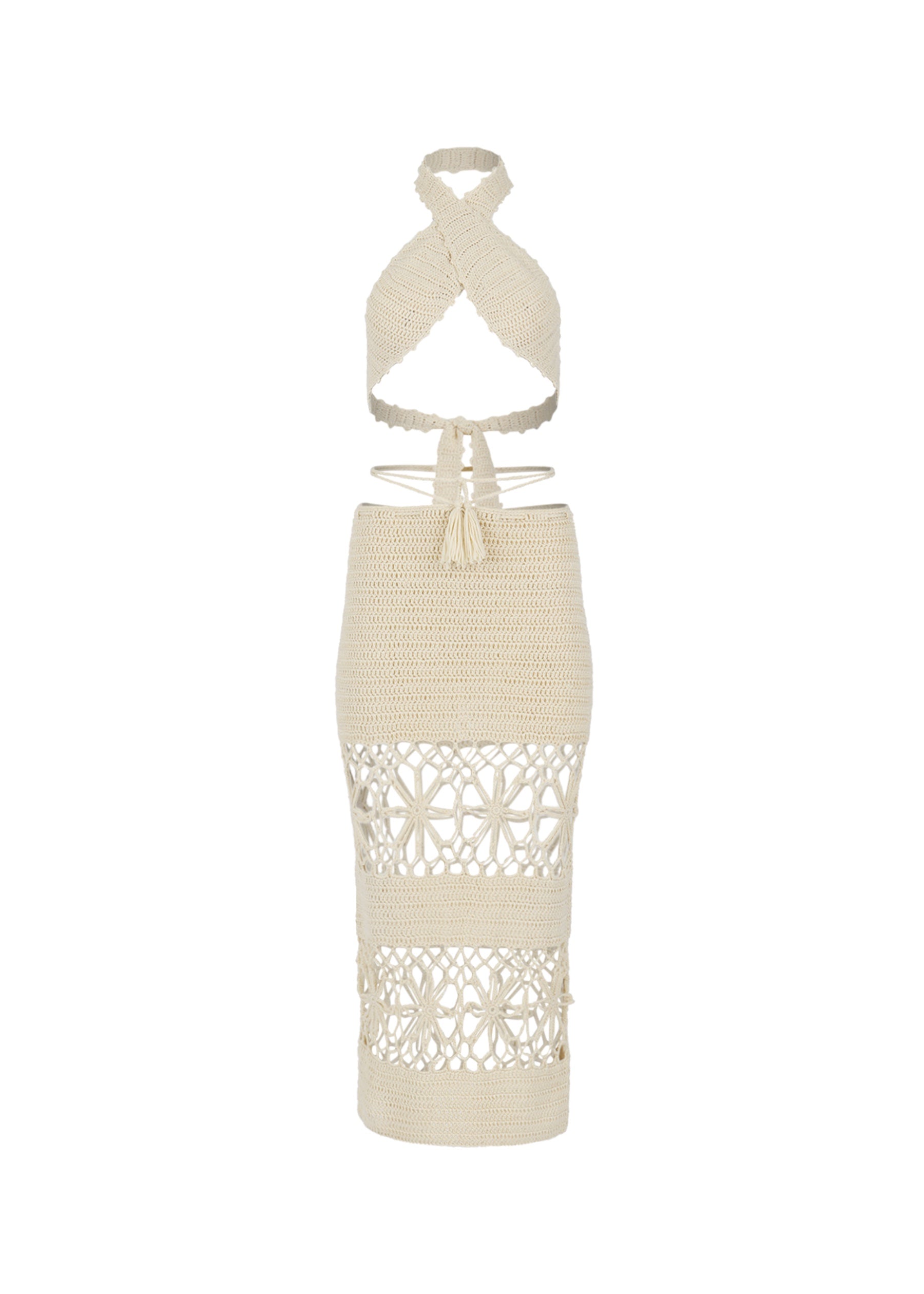 This Knitted Crochet set features ankle length skirt with floral cutouts, and a wrap-around adjusted tie at the waist. Wear it high or low on the waist. Paired with a versatile top that can be worn Different ways as a tie around. Whether you're lounging by the pool, strolling through a tropical garden, or exploring a coastal town, our Two-Piece Crochet Resort Wear is your go-to choice for relaxed sophistication. Elevate your vacation wardrobe with this enchanting ensemble, where crochet craftsmanship and floral cutout details come together to create a truly unforgettable resort experience. Sold as a set.