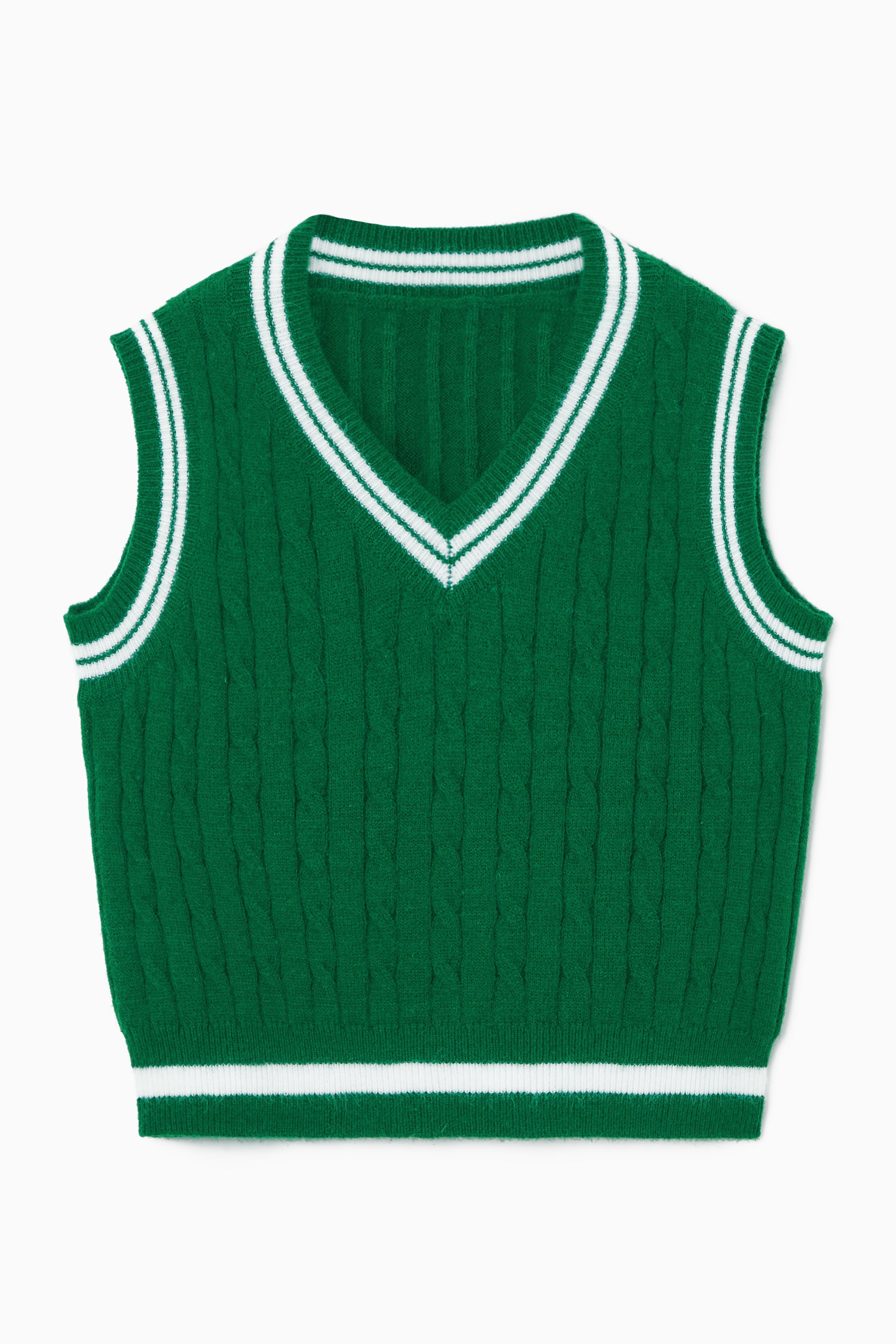 Experience the ultimate combination of comfort and style with our Anne Sweater Vest. Crafted from a luxurious viscose/nylon blend, this cable knit V-neck vest features a trendy boxy cut and preppy stripe detailing. Embrace your inner golf chic and elevate any outfit with this timeless piece!