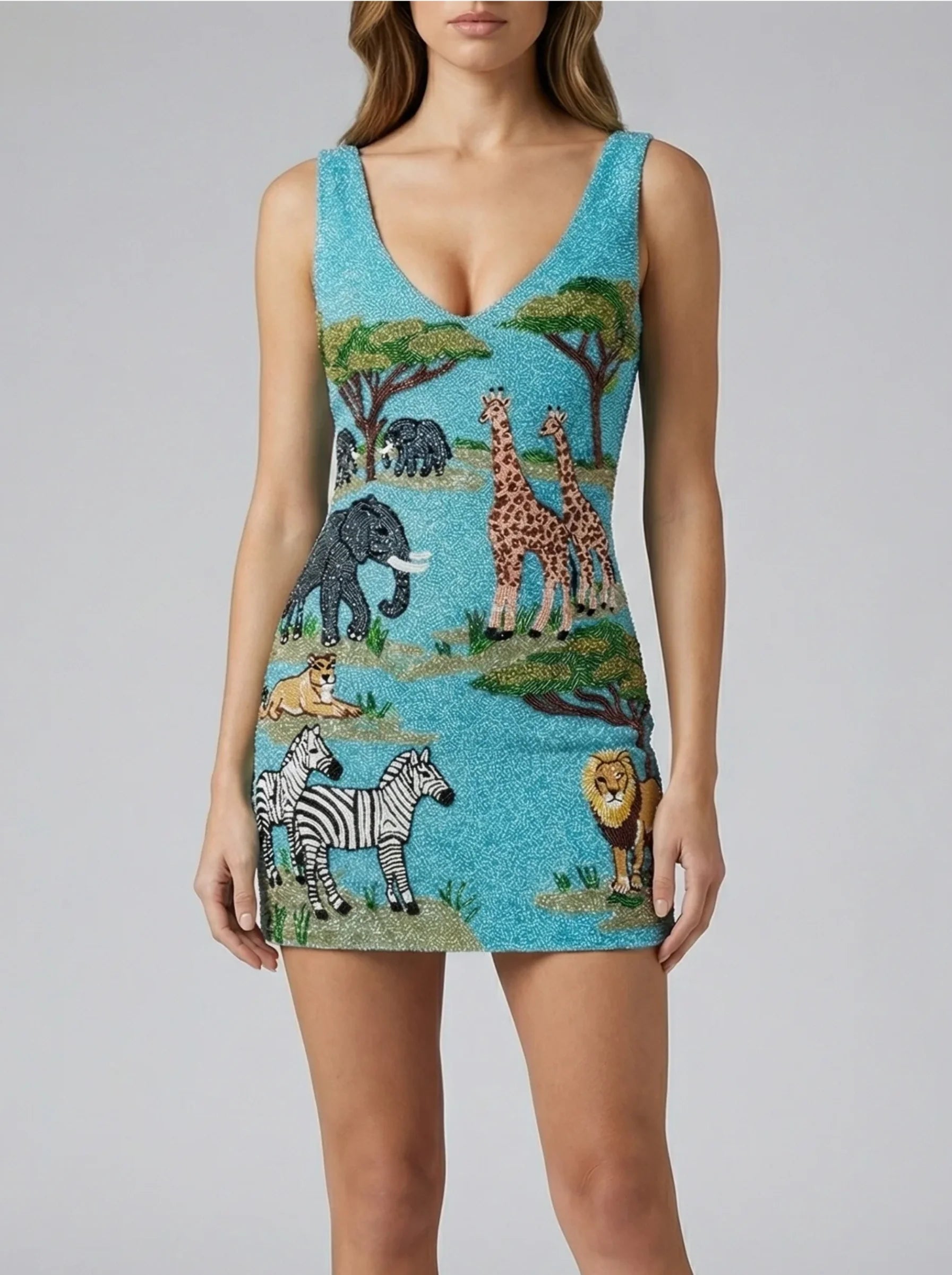 Vibrant, playful, and irresistibly eye-catching—the Aqua Savannah Embellished Dress captures the essence of tropical glamour with a bold artisanal twist. Designed in a striking aqua hue, this piece is brought to life through intricate hand-beaded embellishments inspired by exotic flora and oceanic elements, creating a richly textured and luminous finish.