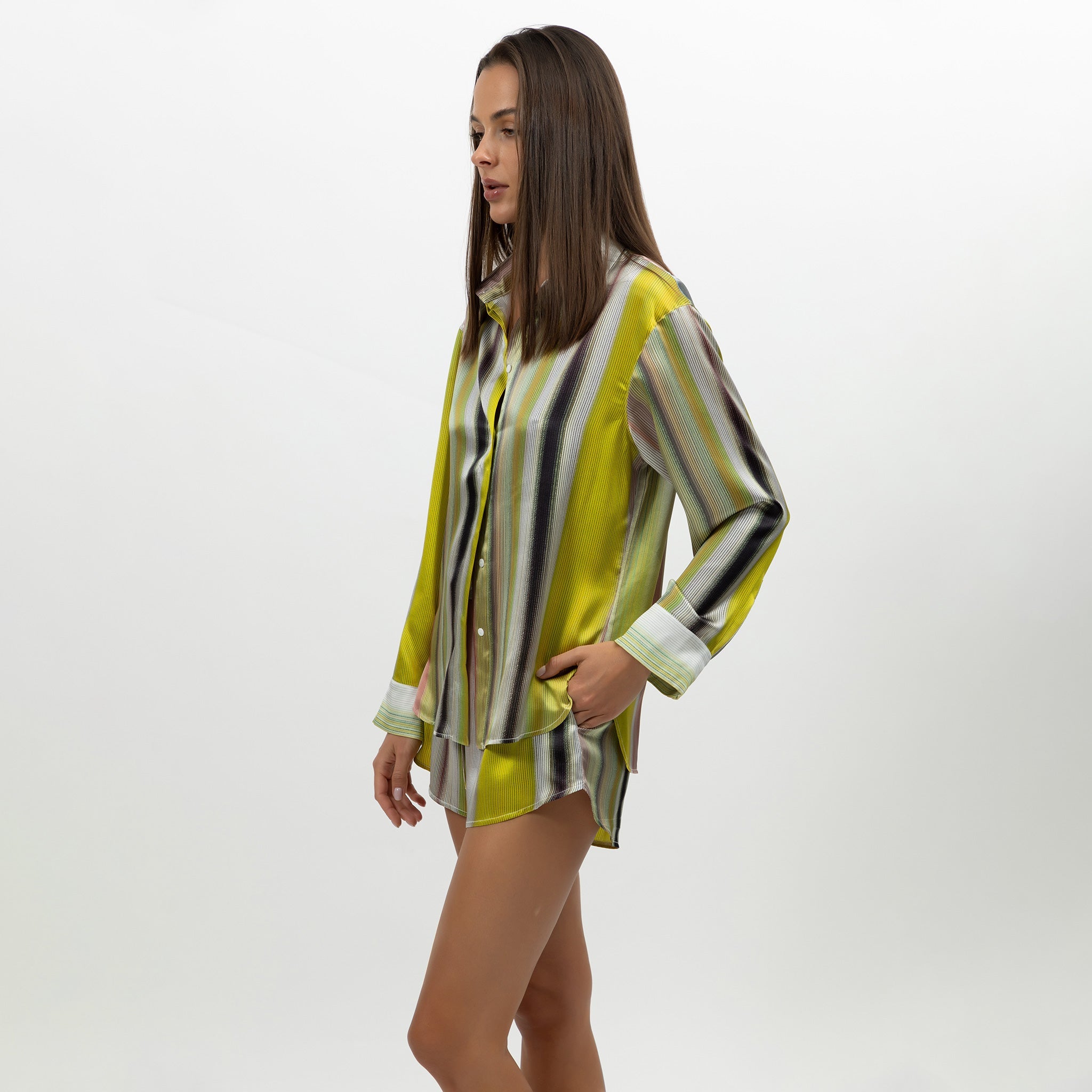 Cut in silk for lightness and fluidity, the Art Stripes shorts offer a refined silhouette with an easy fit. The mid-rise waist and soft structure create a balance between comfort and polish. Naturally wrinkle-free, the silk keeps them looking fresh with minimal effort.