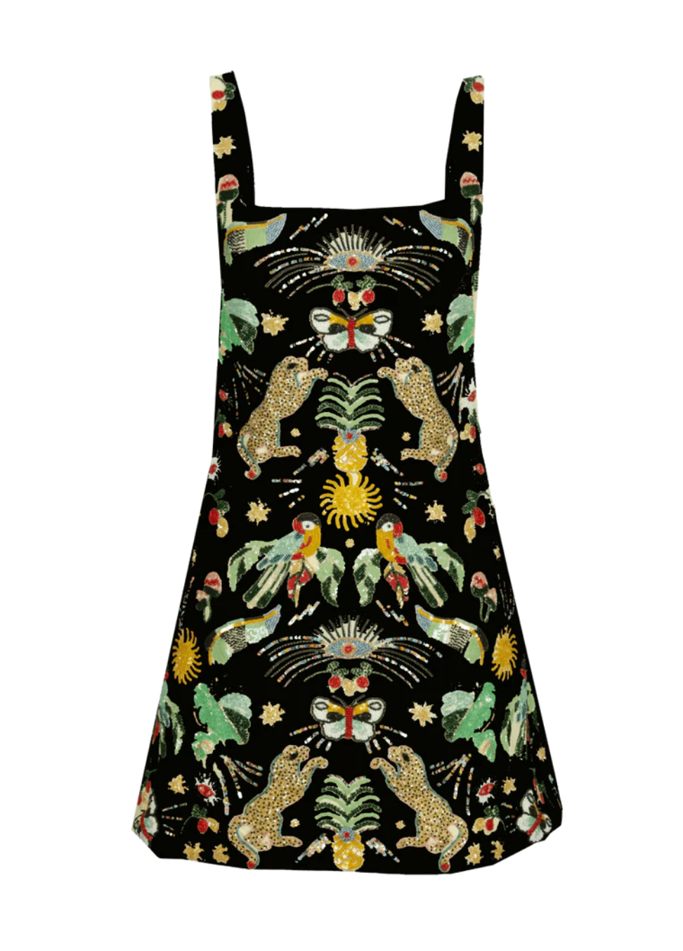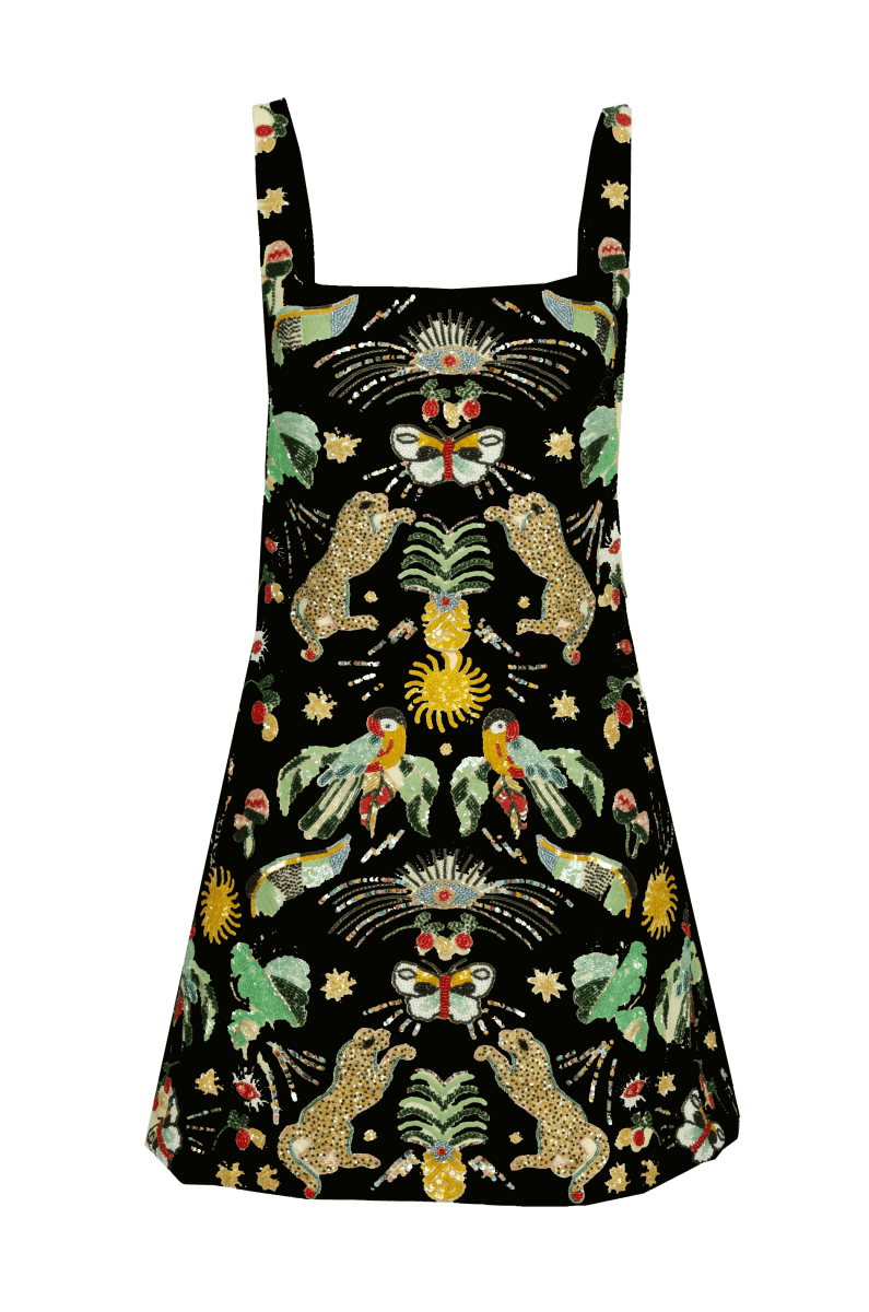 The Aurelia Black Sequin Embroidered Mini Dress is a tropical-inspired cocktail dress featuring hand-embroidered motifs on eco-friendly Italian Lycra. Perfect for summer parties, luxury evenings, and chic holiday events, this sustainable sequin mini dress offers a figure-flattering fit and Oceanus’s signature exotic elegance.