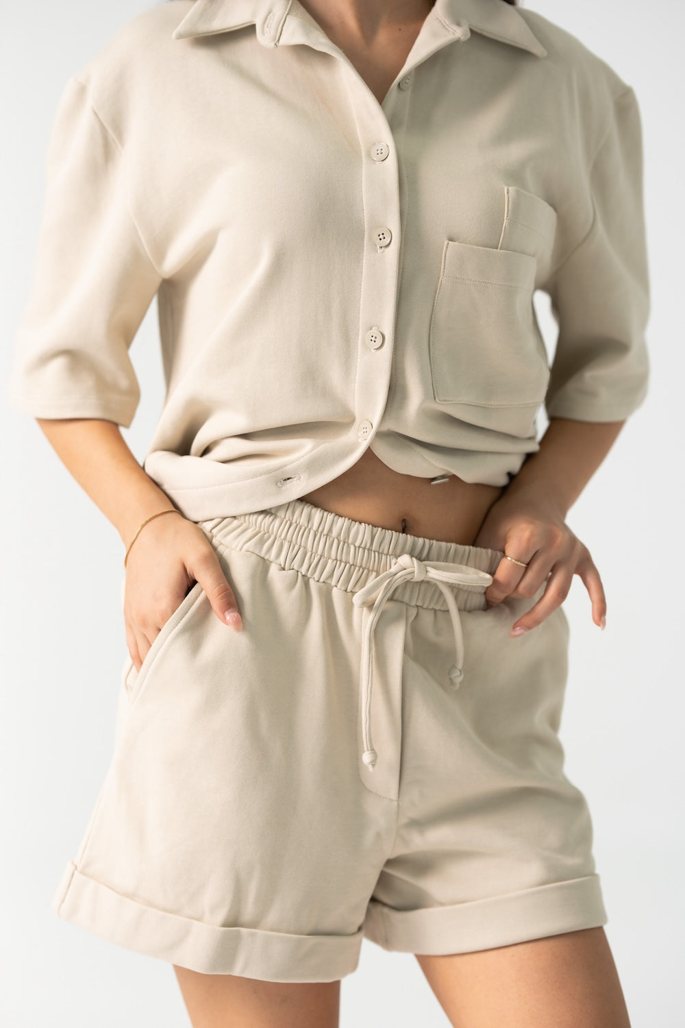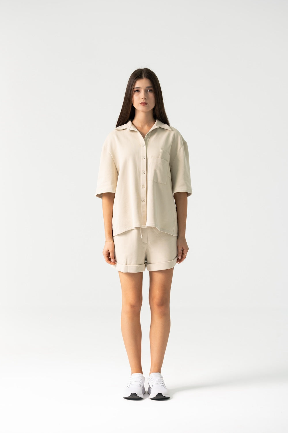 This minimalist set features a short-sleeved button-up shirt with a front pocket, paired with cuffed shorts. The relaxed, oversized silhouette and soft fabric offer comfort and effortless style, making it ideal for warm days or a smart-casual look that transitions throughout the day.