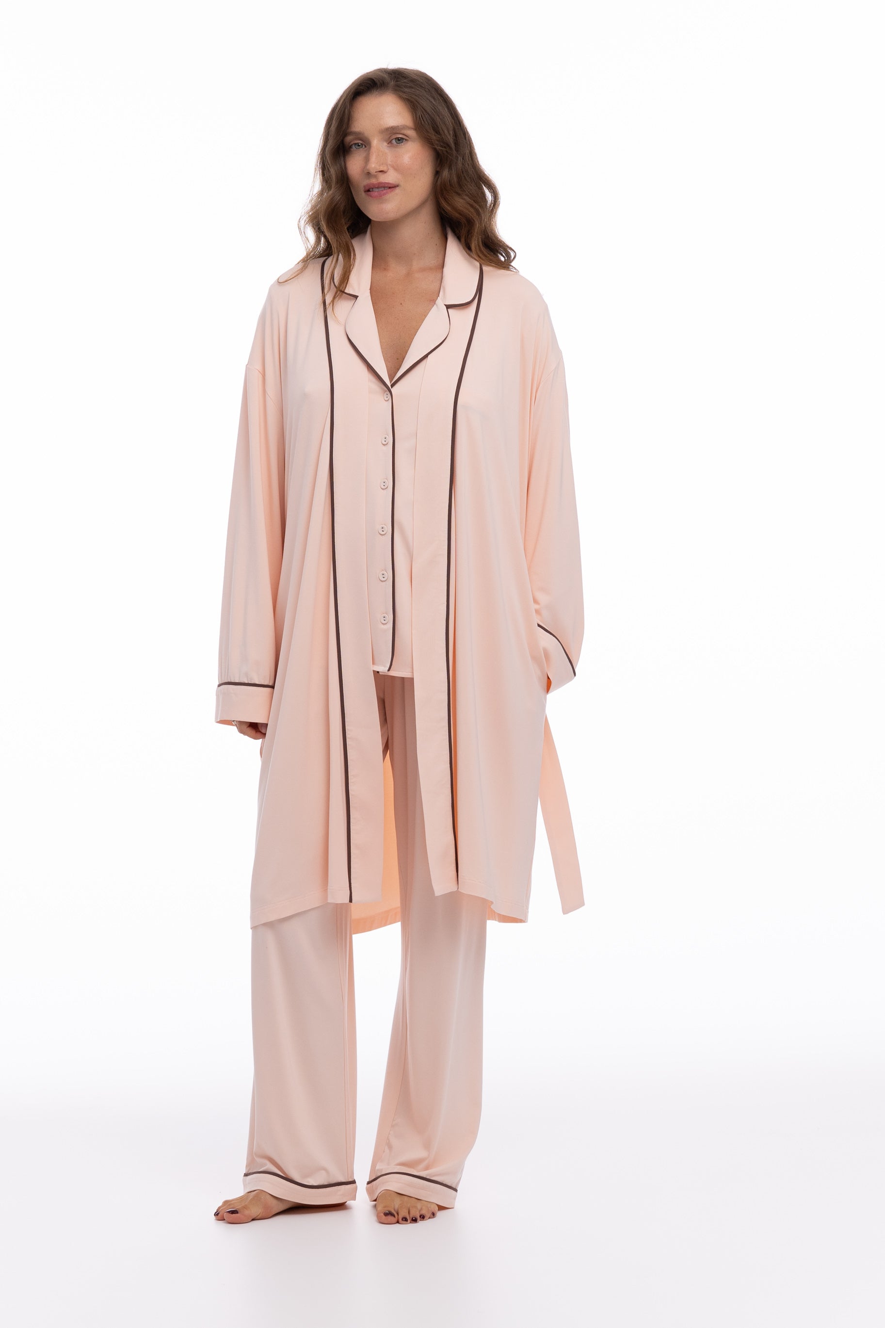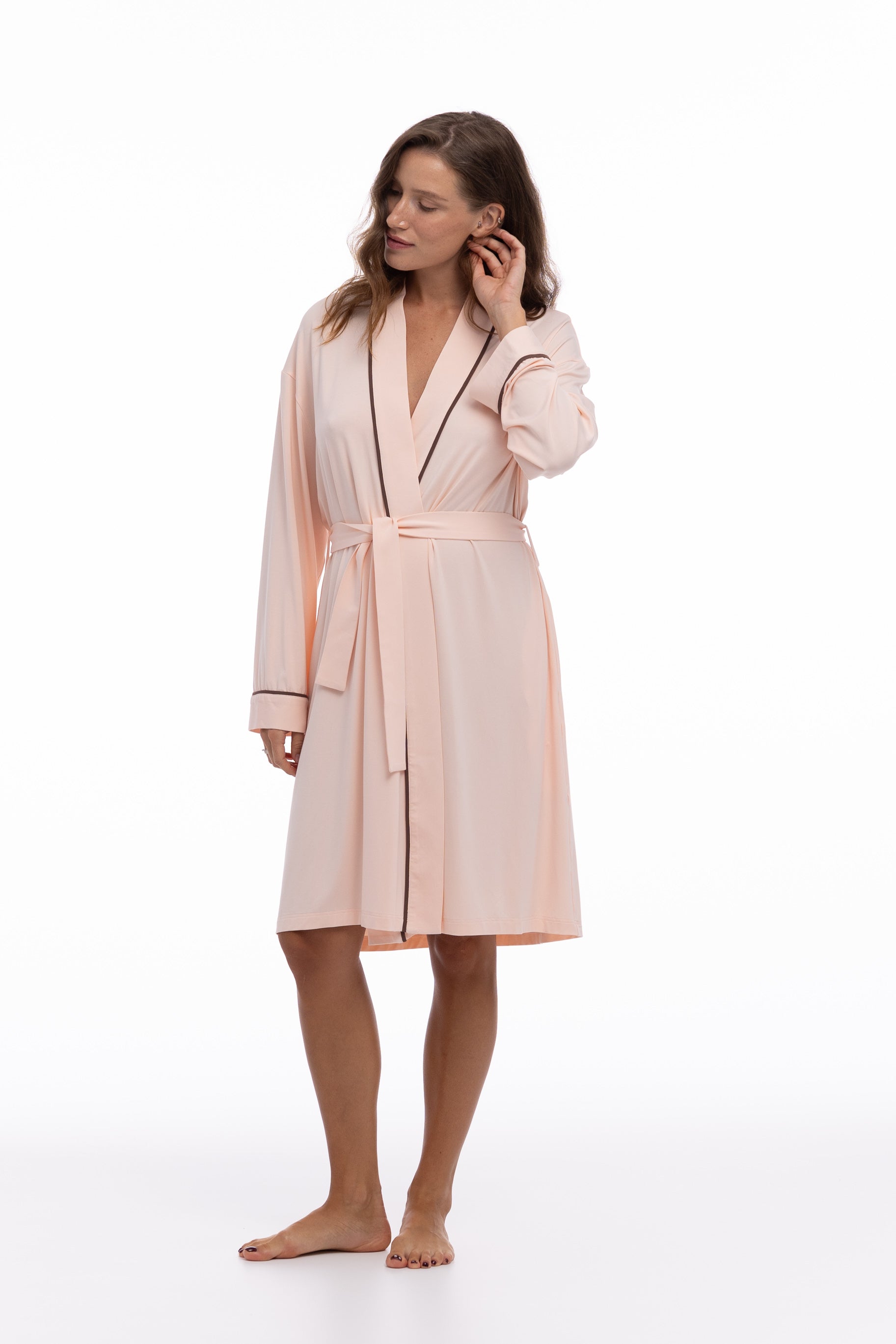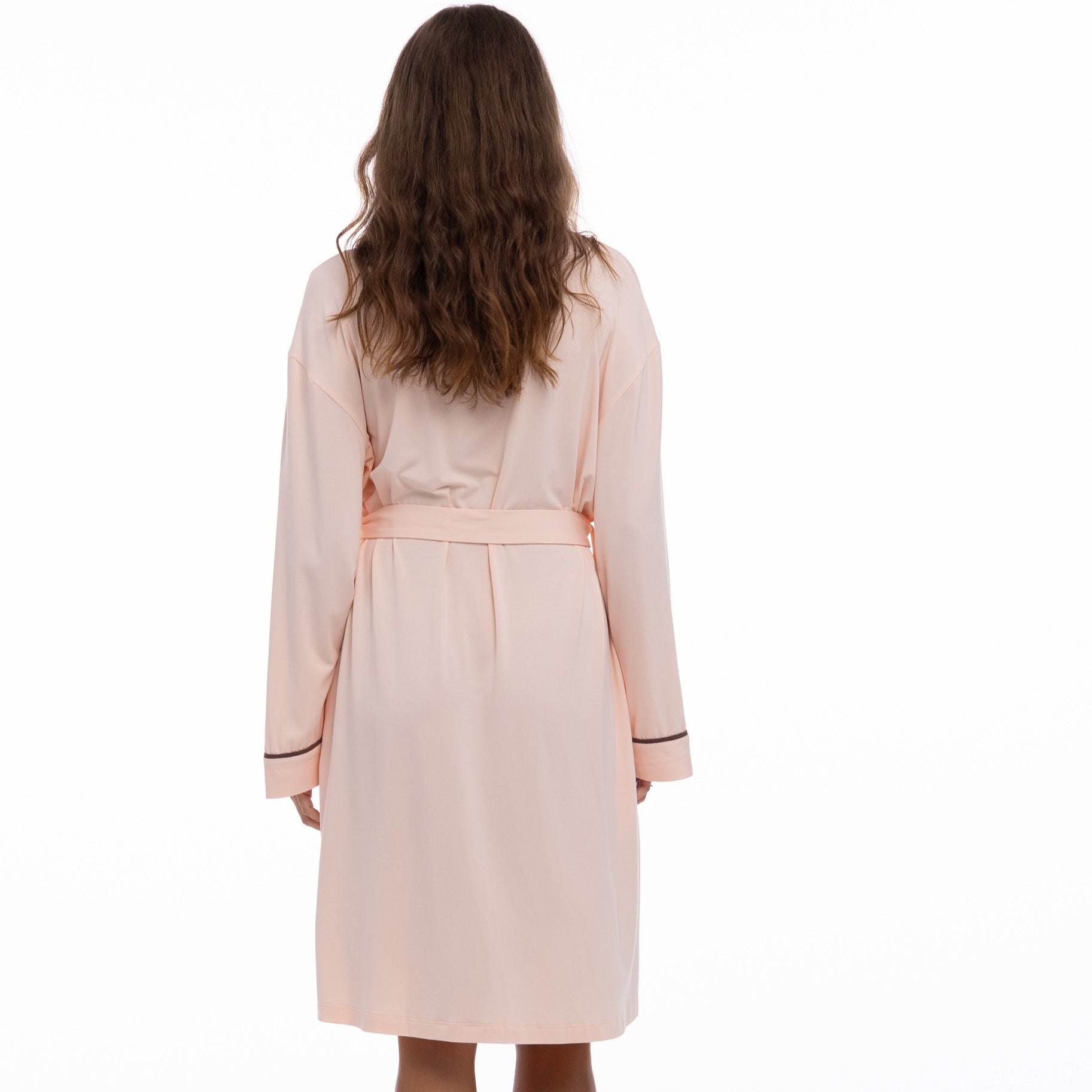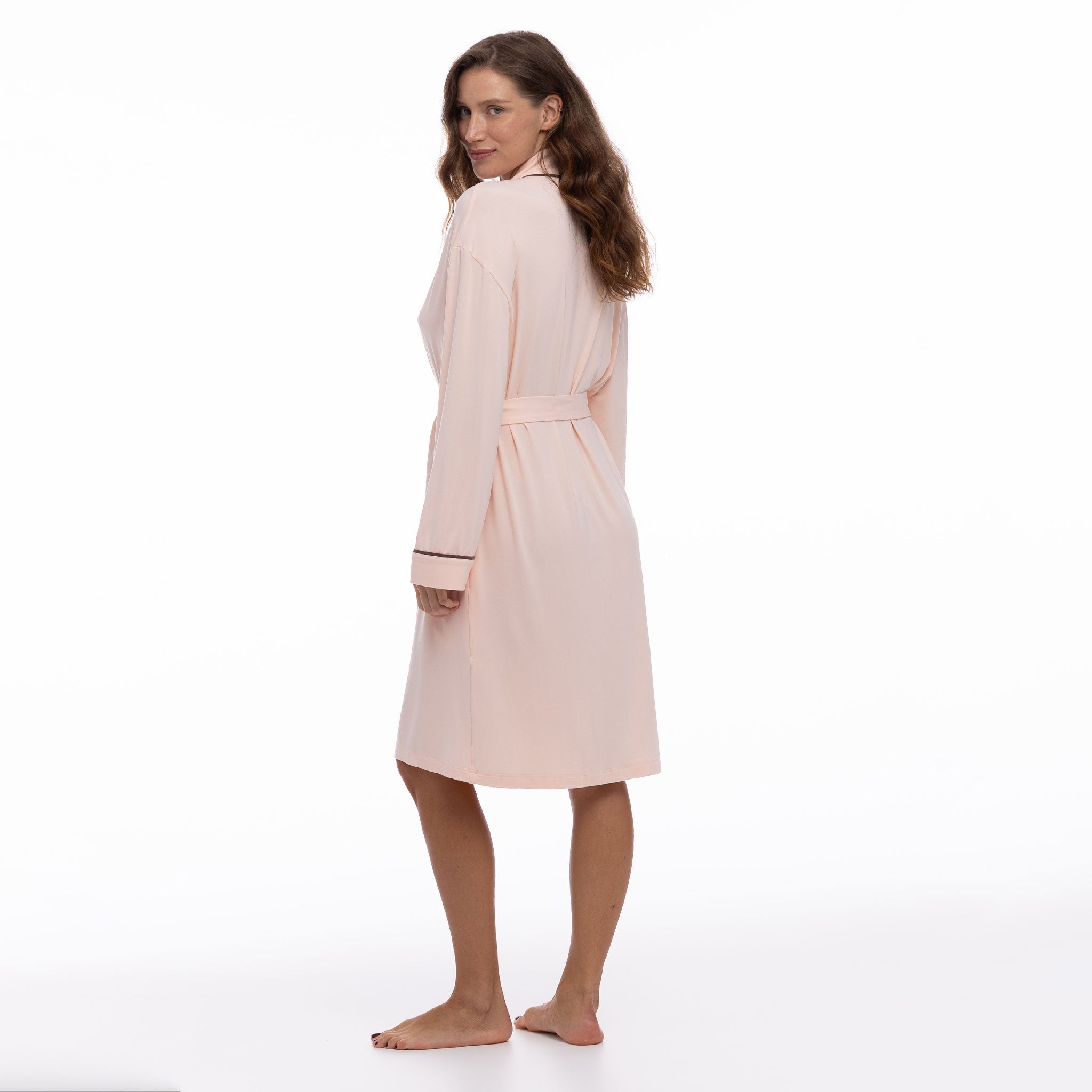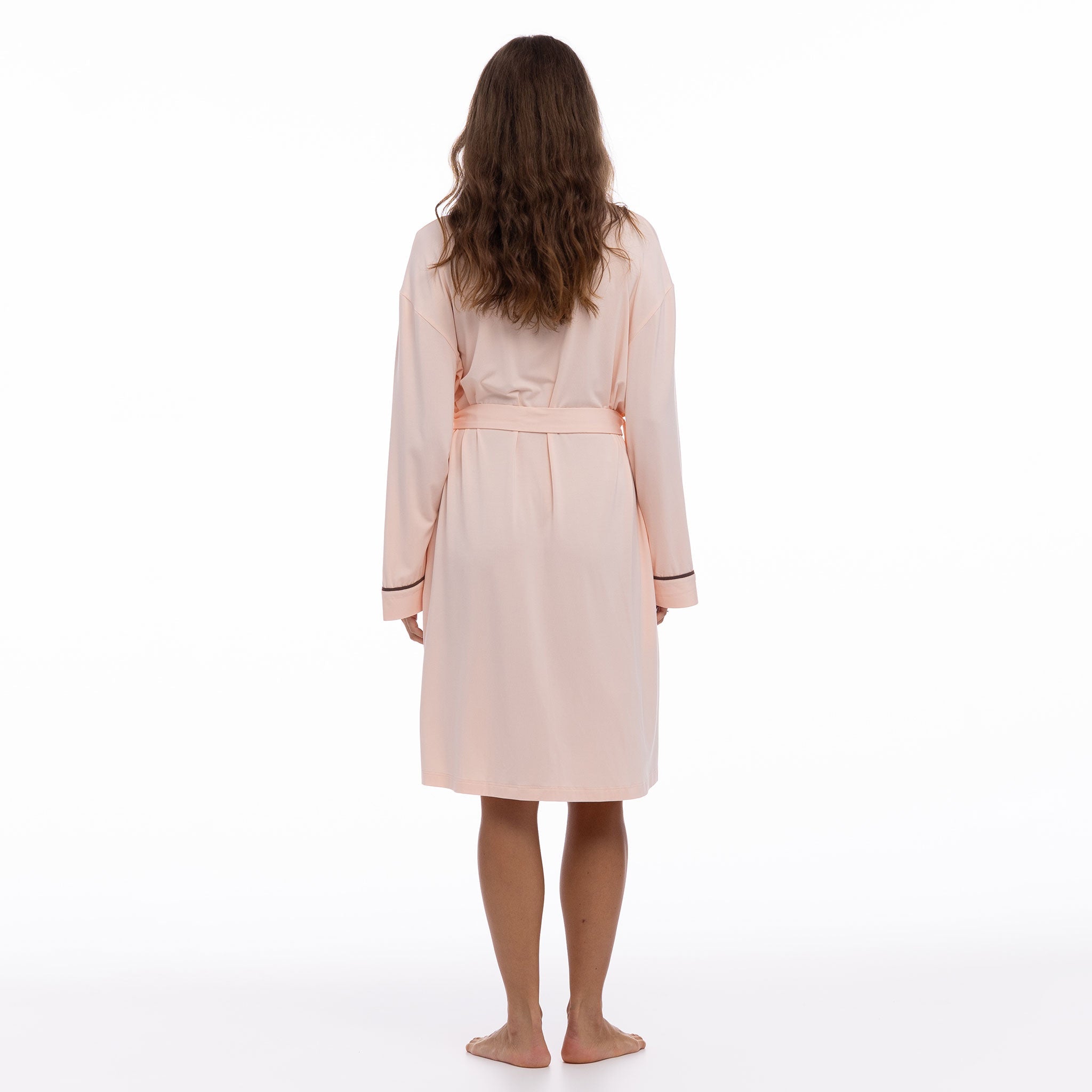 In Peach Powder with Ground Coffee trims, this robe offers a calming, refined colourway for every self-care ritual.