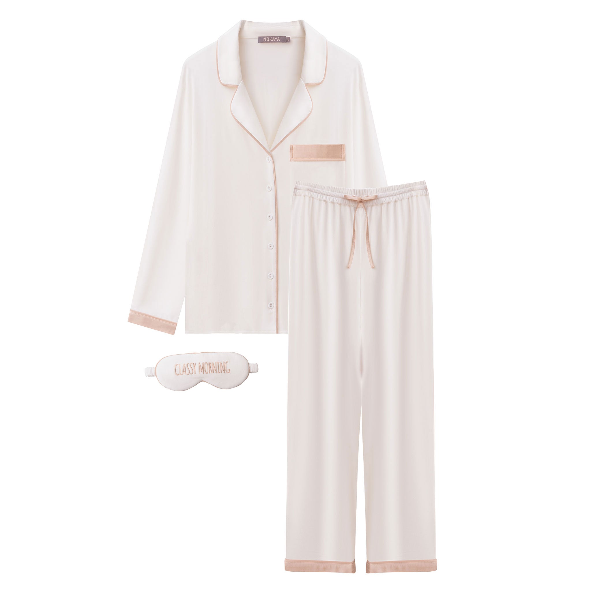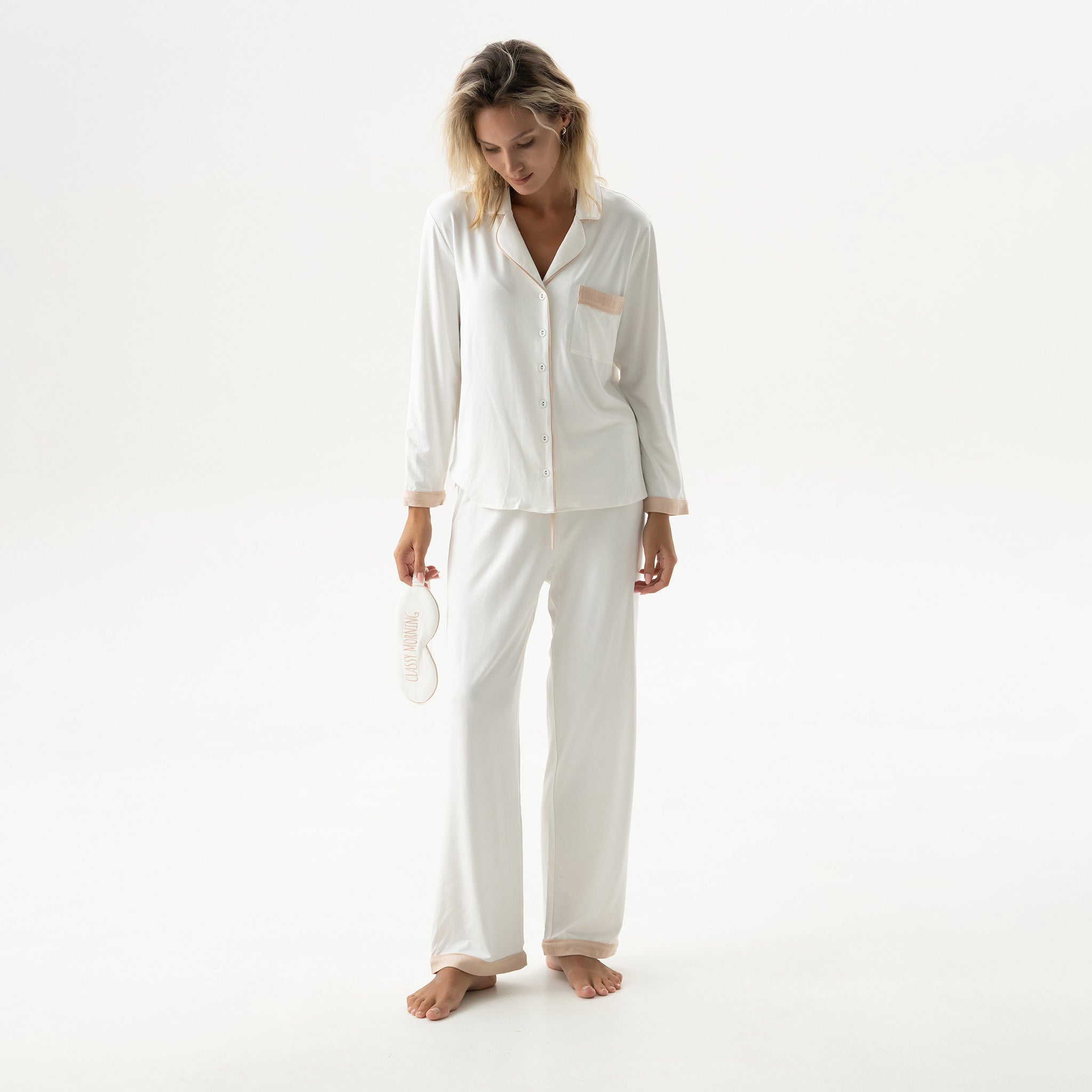 Designed for moments of slow living, this long pyjama set is made from breathable bamboo that’s gentle on the skin. The shirt features a soft, tailored cut with contrast piping and self-fabric-covered buttons, while the drawstring trousers offer a comfortable fit with freedom and flow.