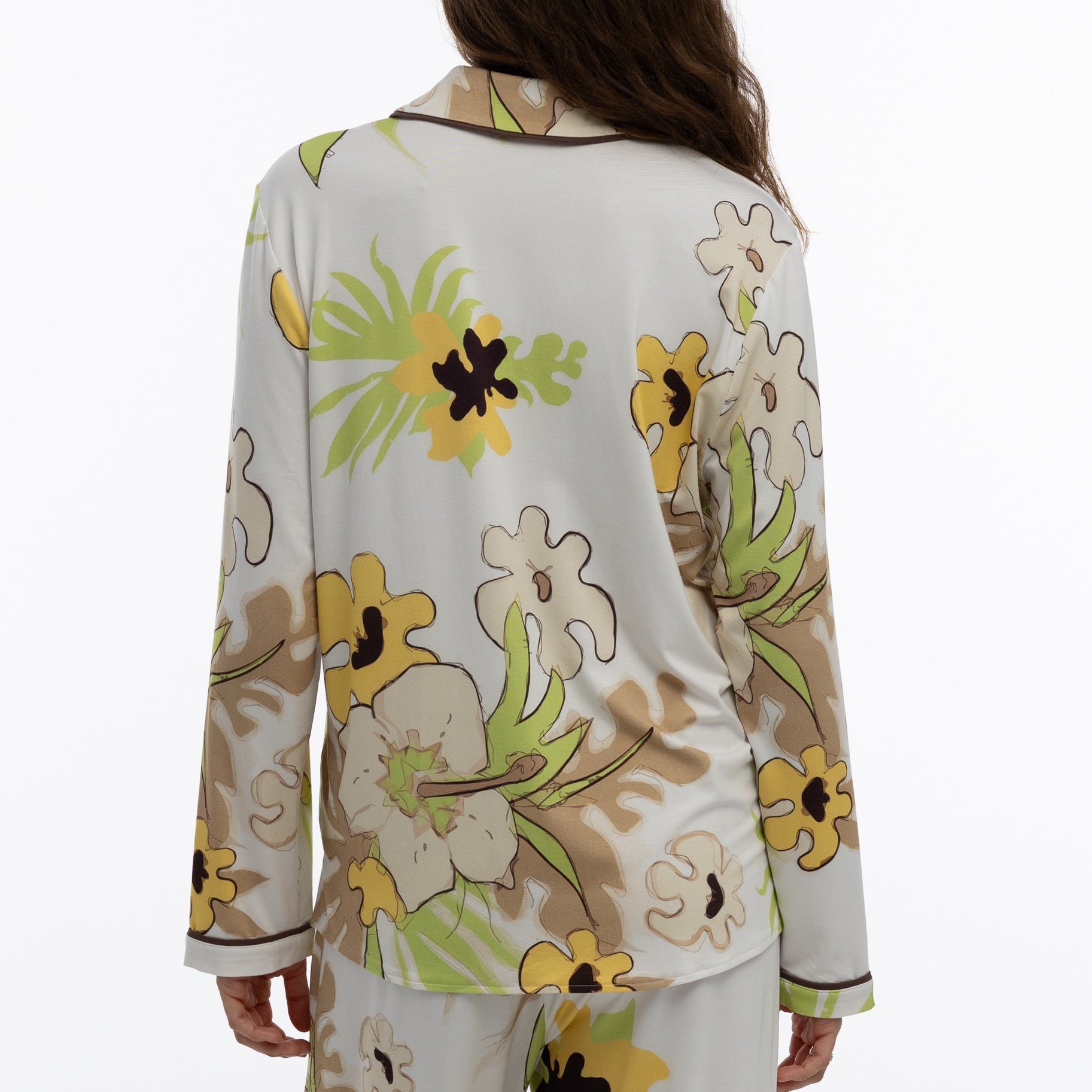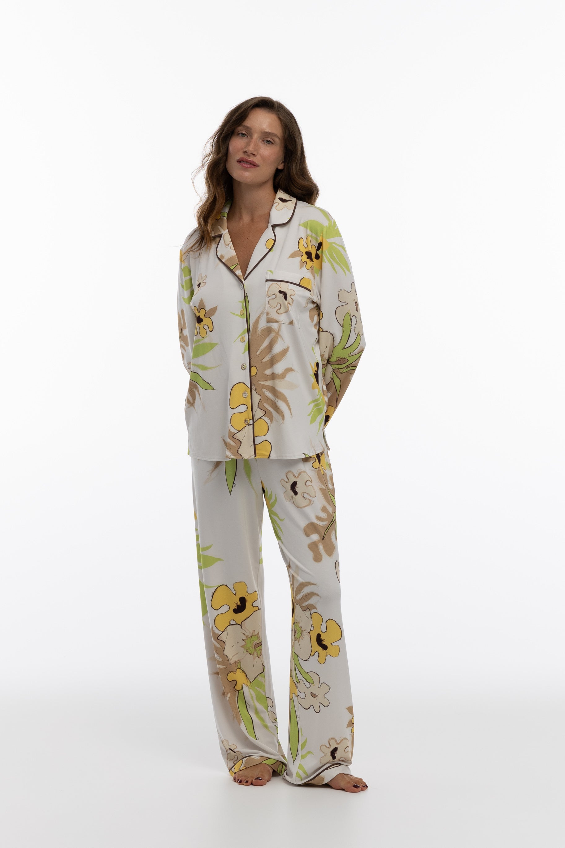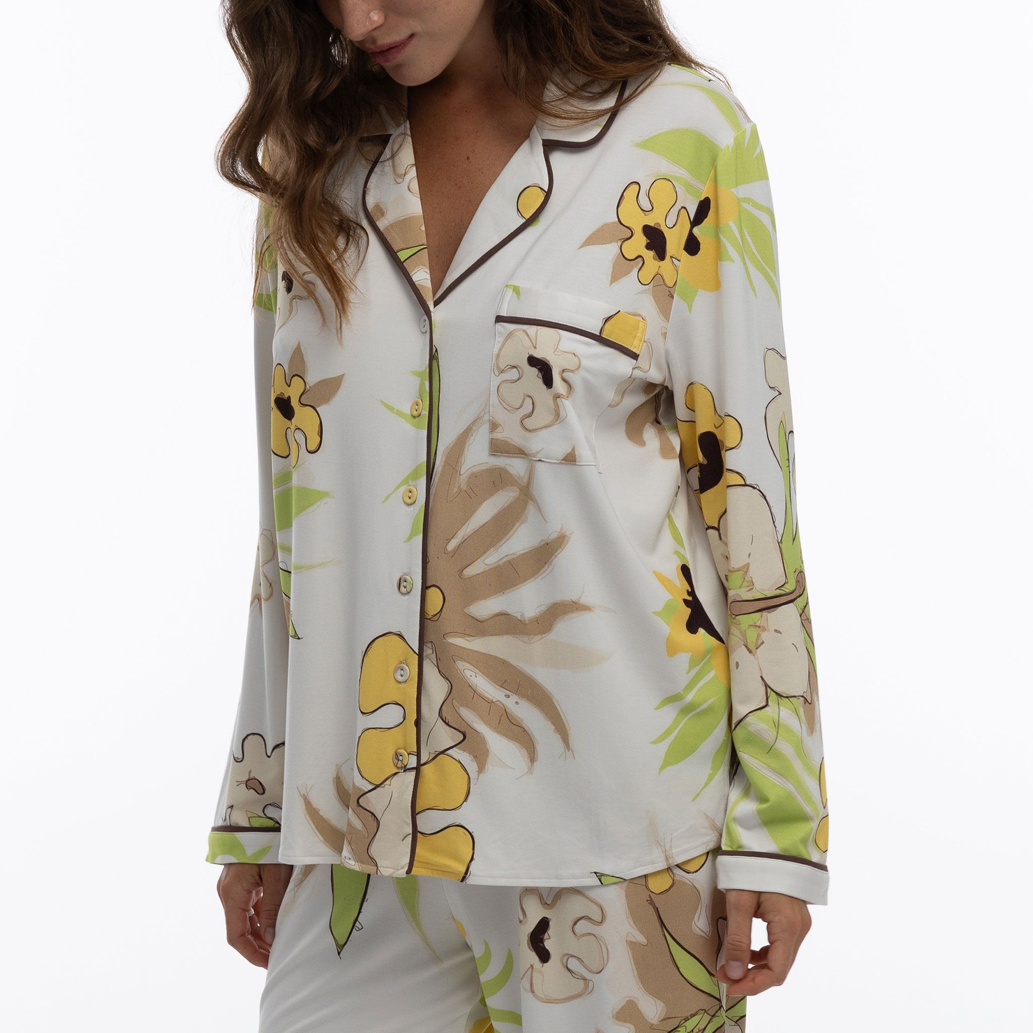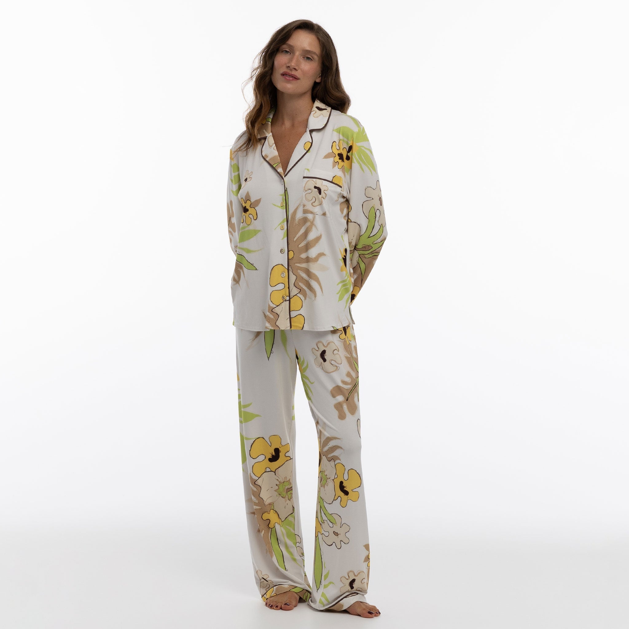 Unwind in elegance with this luxuriously soft long-sleeve pyjama set, crafted from our breathable bamboo jersey. Designed with self-fabric-covered buttons, relaxed tailoring, and contrast piping for a refined silhouette.