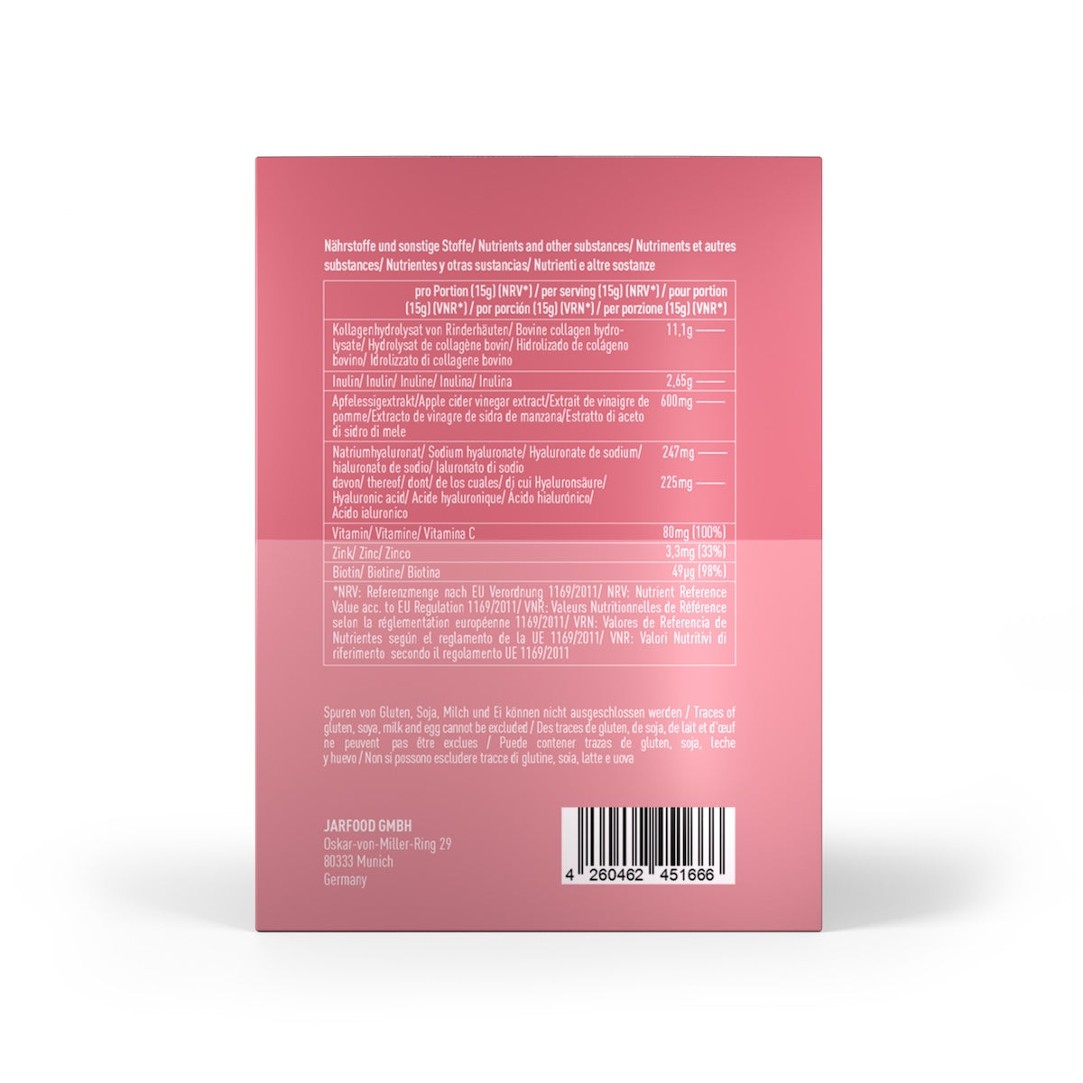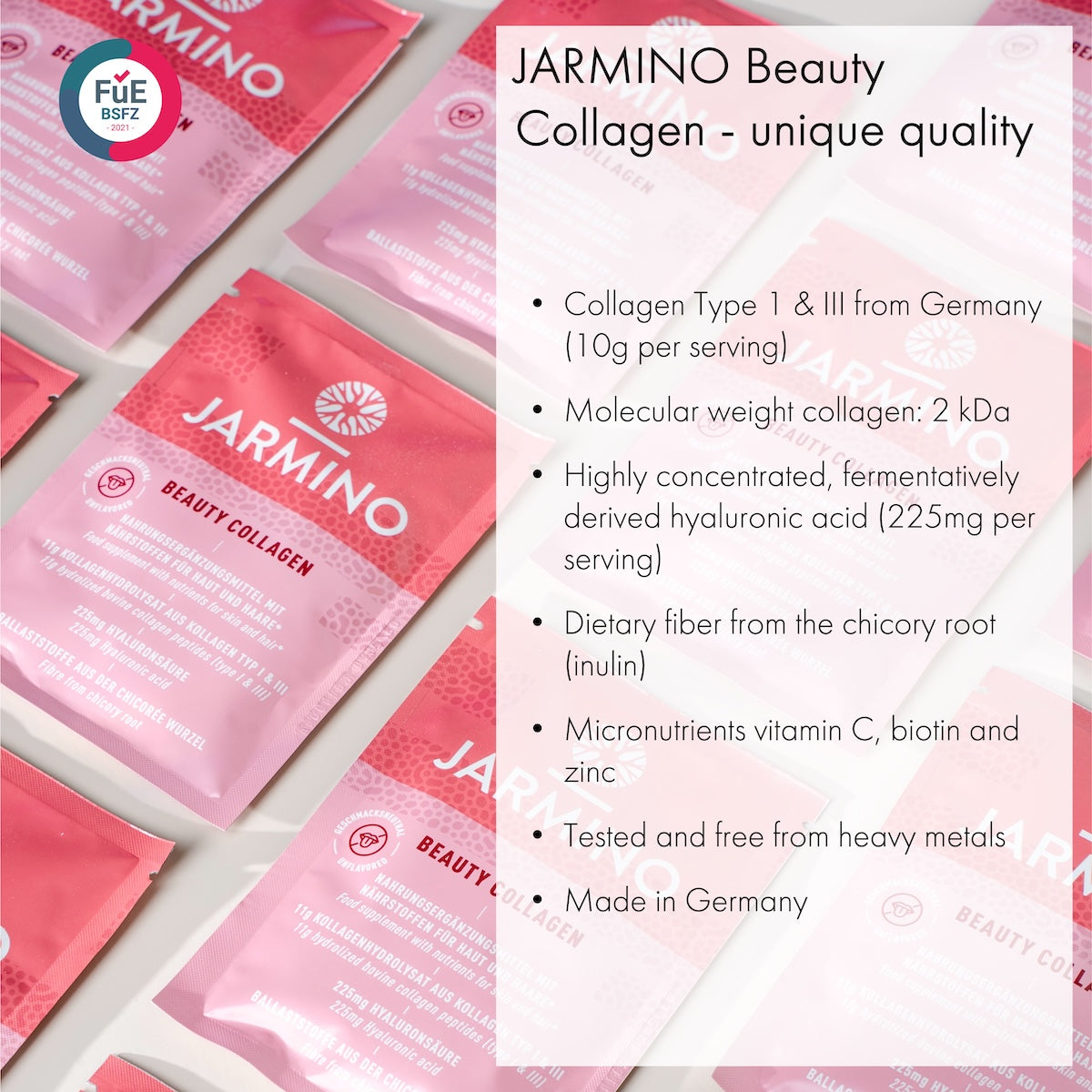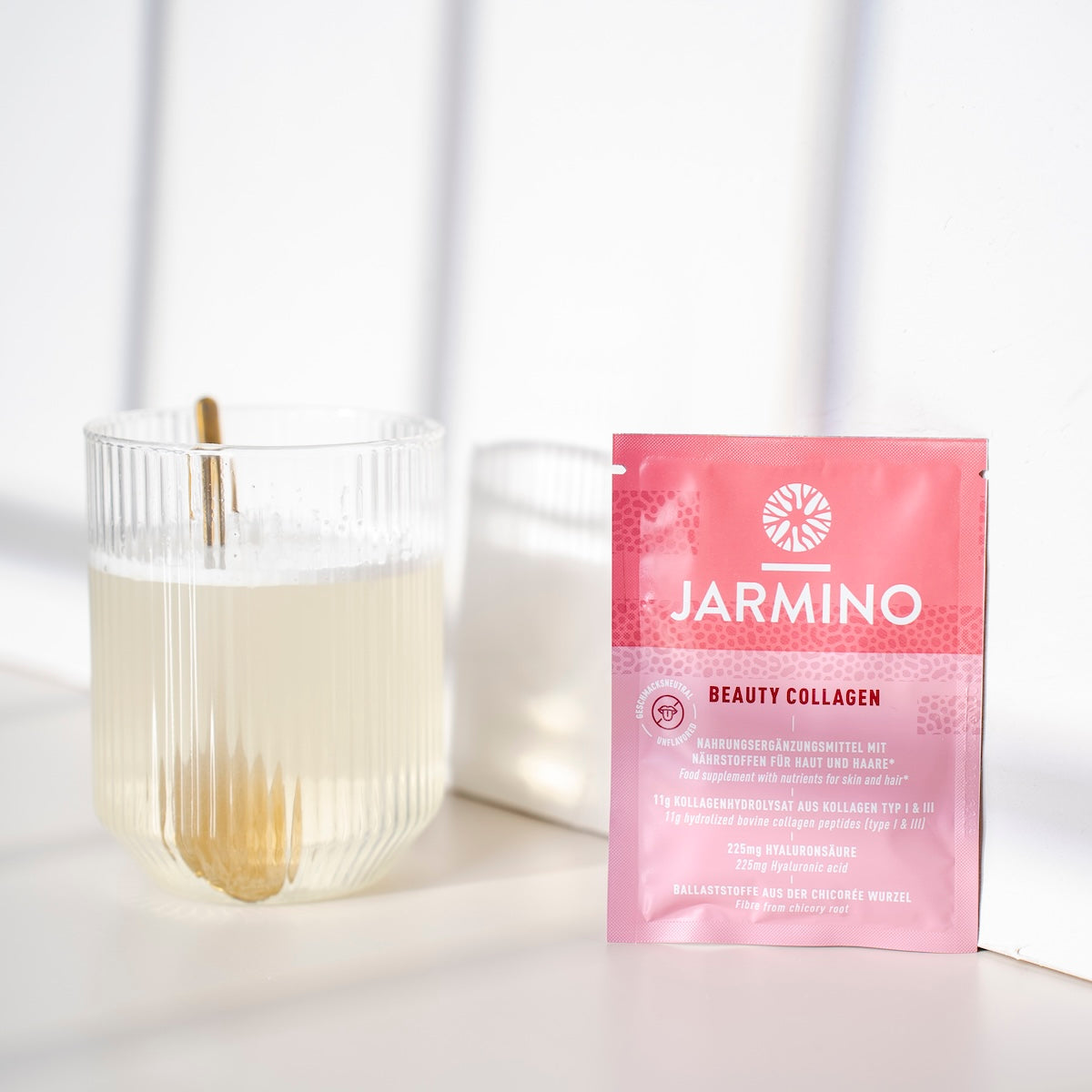 JARMINO Beauty Collagen for on the go in practical sachets. One box contains 15 sachets with 15g Beauty Collagen each. Our unique formula of collagen peptides type I and III, hyaluronic acid, the fiber inulin from the chicory root, natural apple cider vinegar, vitamin C, biotin (vitamin B7) and zinc provides your skin, hair and nails* with many important nutrients. *Biotin contributes to the maintenance of normal skin and hair. *Vitamin C contributes to normal collagen formation for normal skin function. *Zinc contributes to the maintenance of normal skin, hair and nails. Best quality