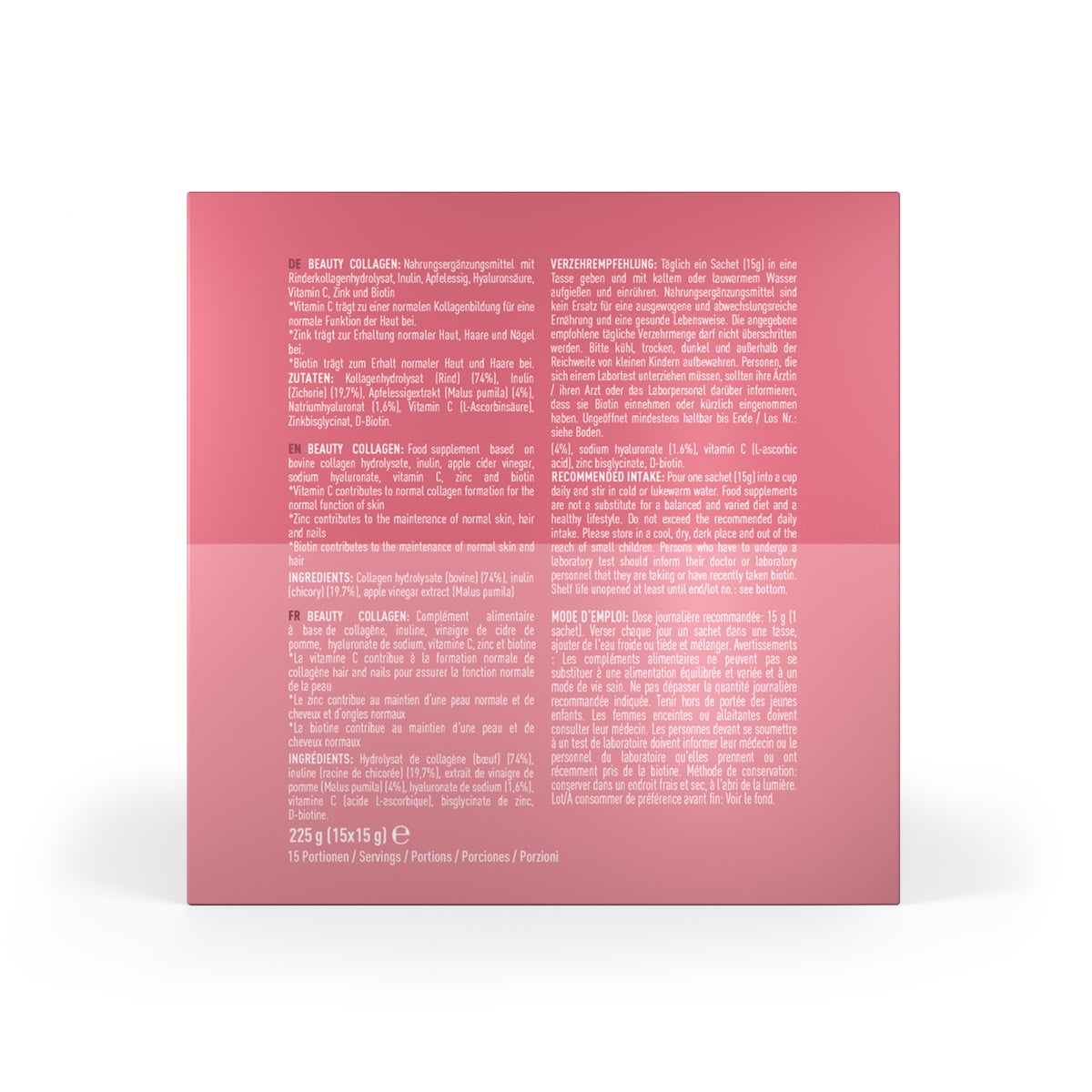One box contains 15 sachets with 15g JARMINO Beauty Collagen each (15 portions of 15g each).