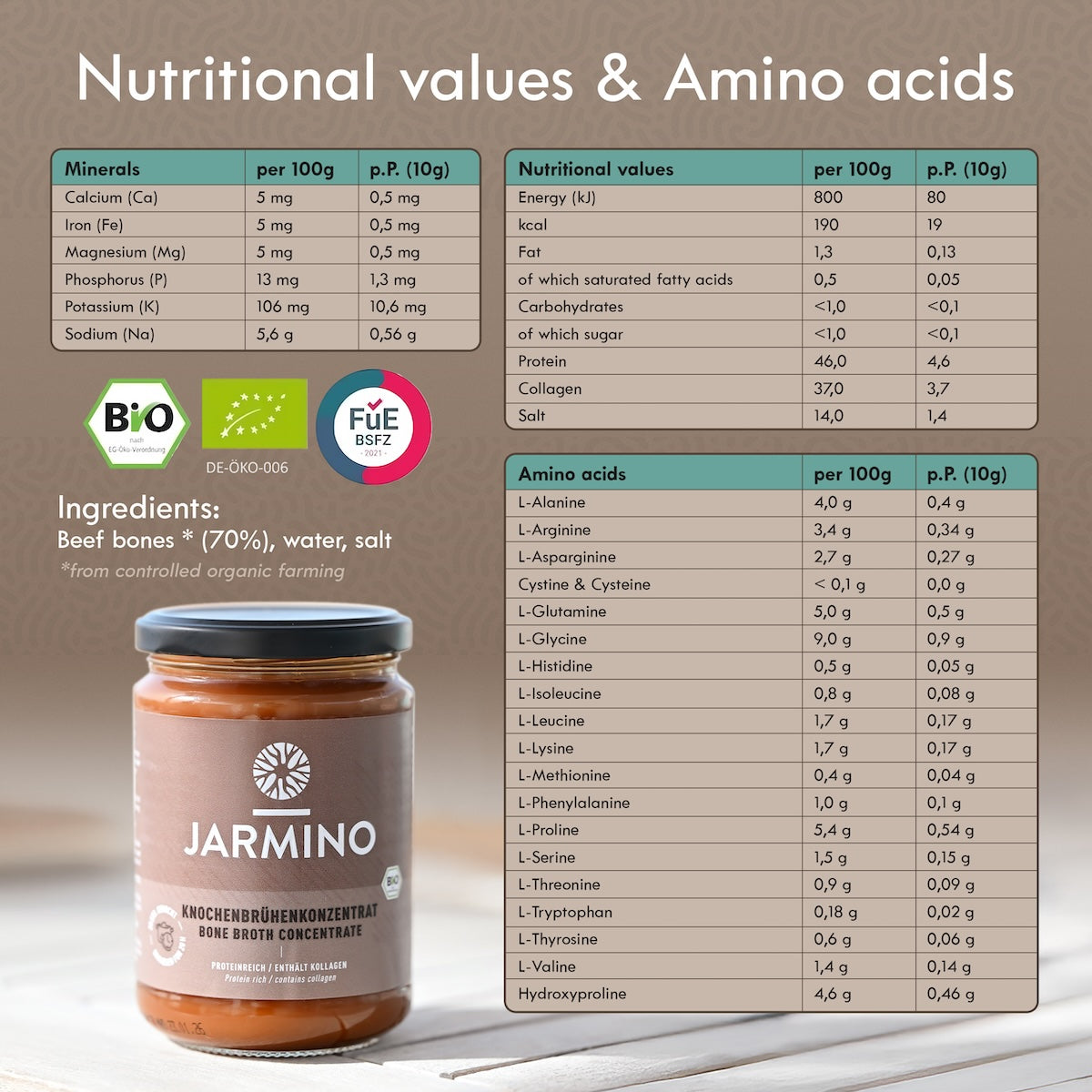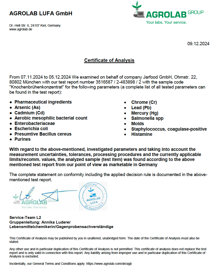 Where do the ingredients come from? We use only organic bones for our bone broth concentrate. Bottled in our manufactory in Bavaria, we source the bones from several farmers who practice sustainable agriculture. The animals are kept on pasture and are fed grass. Is the concentrate lead-free? Yes, regular laboratory tests prove that there is no lead in it. This is common for organic products. Is the bone broth concentrate free of histamine? Yes, the product is regularly tested, and no histamine could be detected. I case of any further questions, just send us an e-mail support@jarmino.co.uk. |