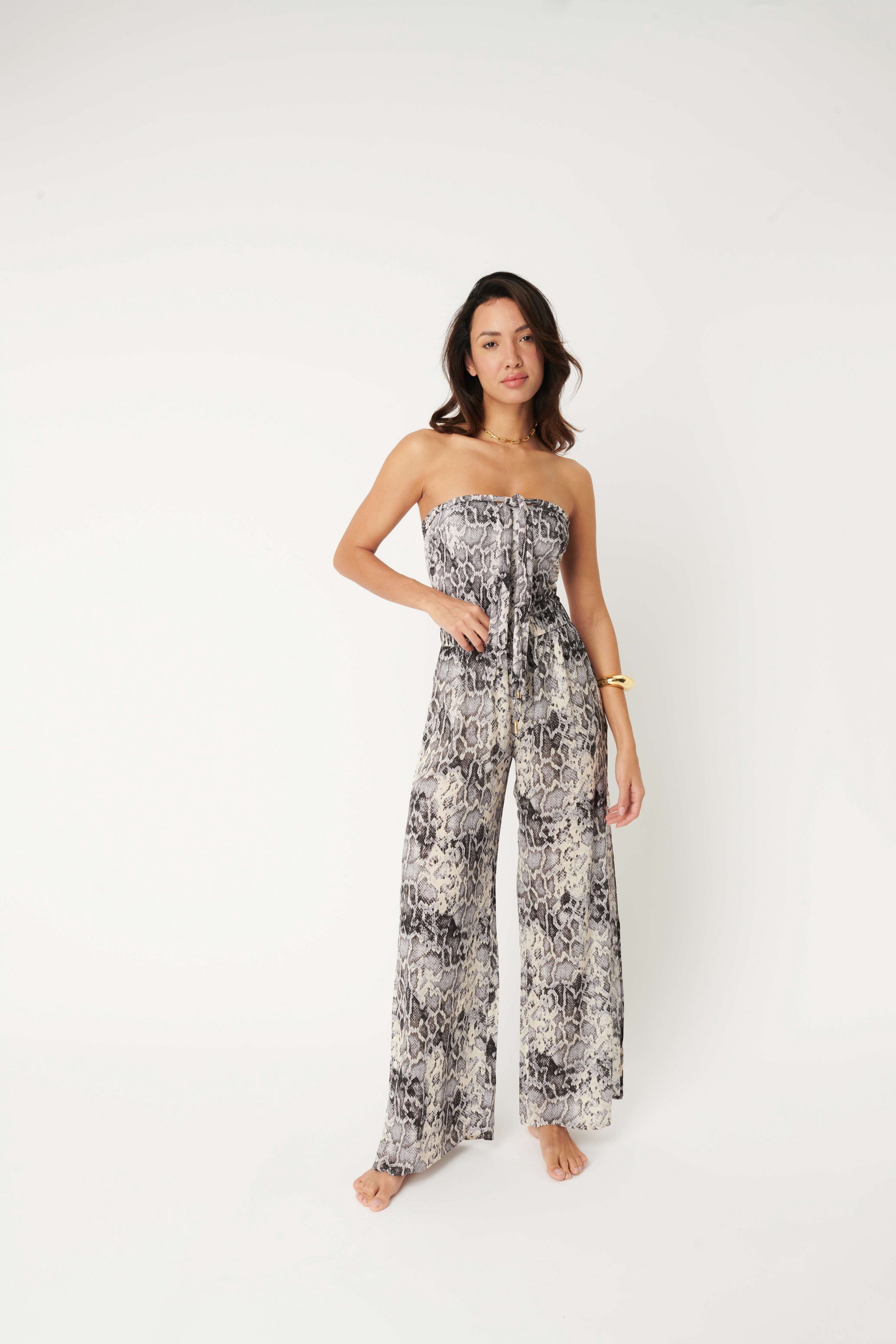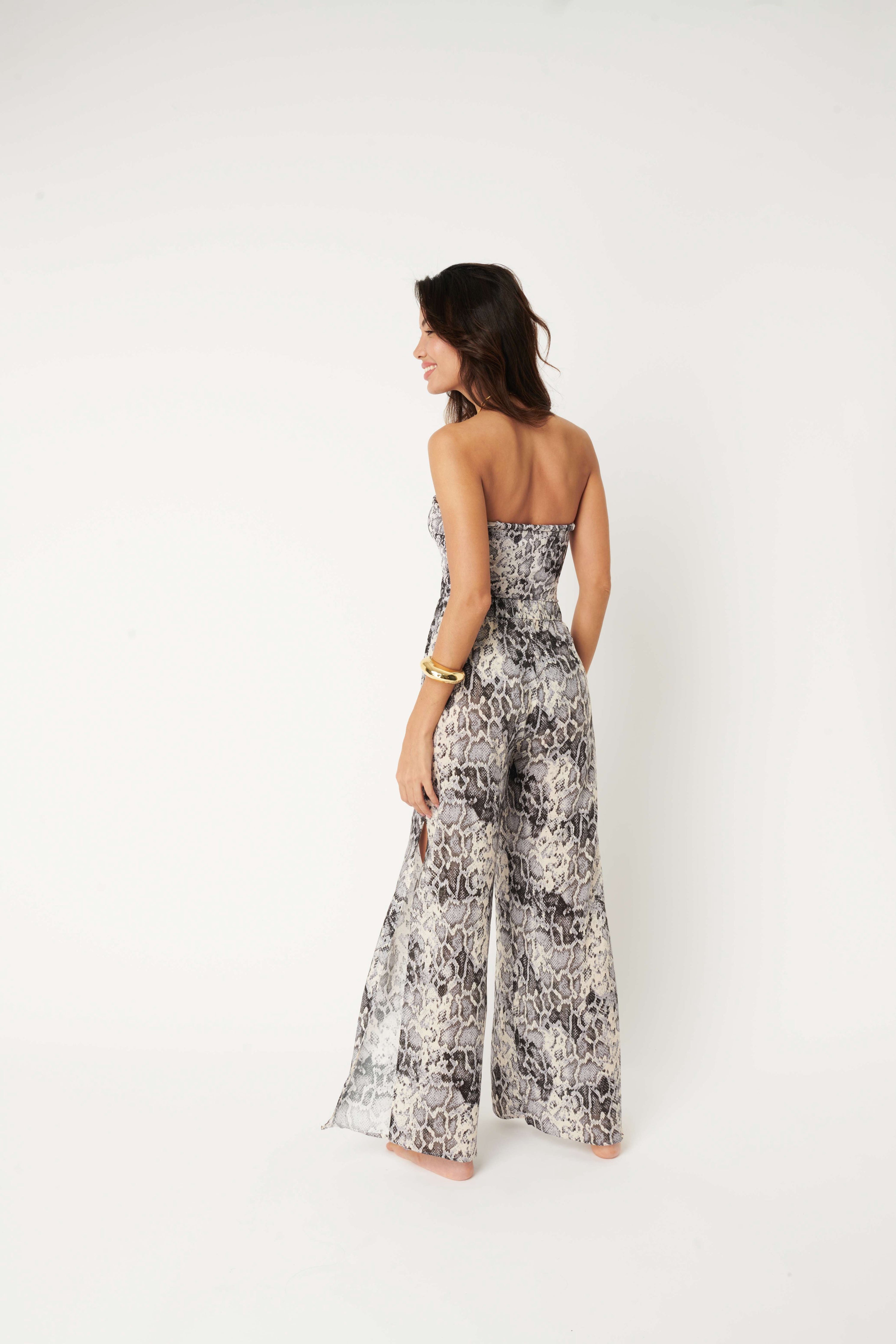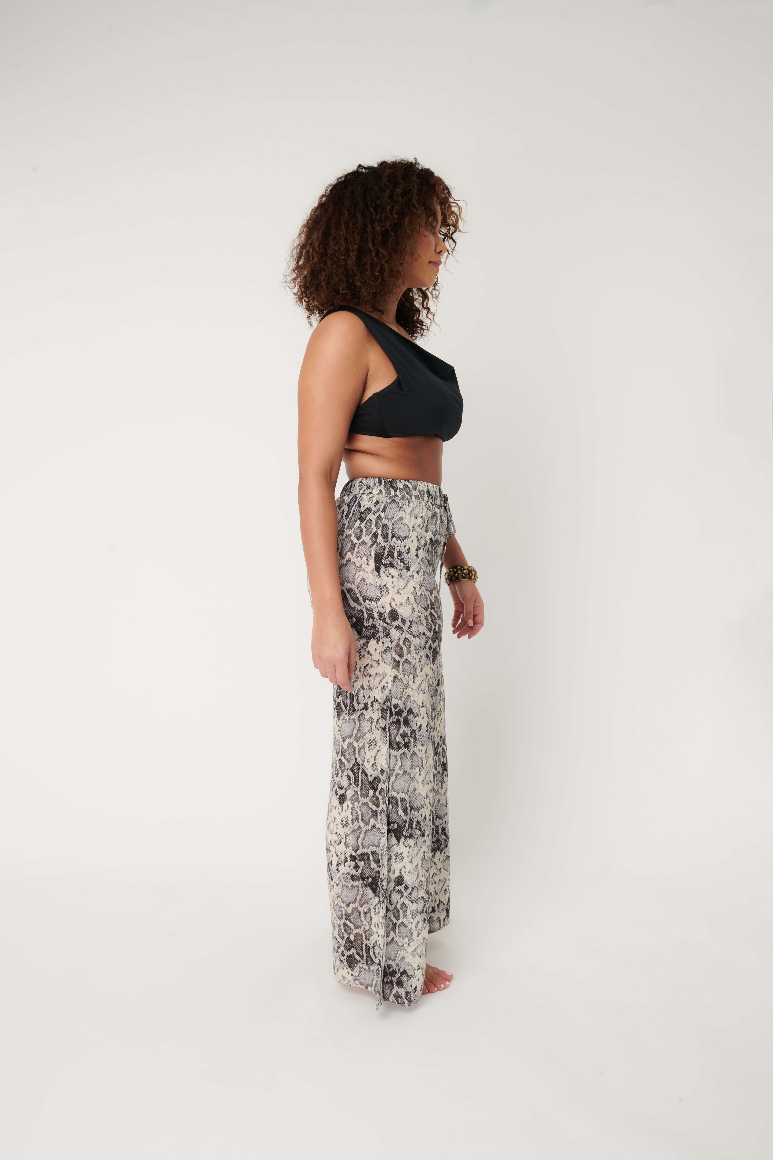 Introducing the Benirras Lolo Trousers - the perfect addition to your luxury beachwear collection. These easy high waist trousers feature large slits for a breezy beachwear look, and can even be paired with our Benirras Talitha swimsuit for a jumpsuit look. The elasticated waistband with pull ties is beautifully accented with serpent embossed gold beads, adding a touch of elegance to your beach attire. Made from lightweight ecovero viscose, these trousers are perfect for a day by the sea or styled up for a party. Don't miss out on these must-have trousers for your next beach vacation.