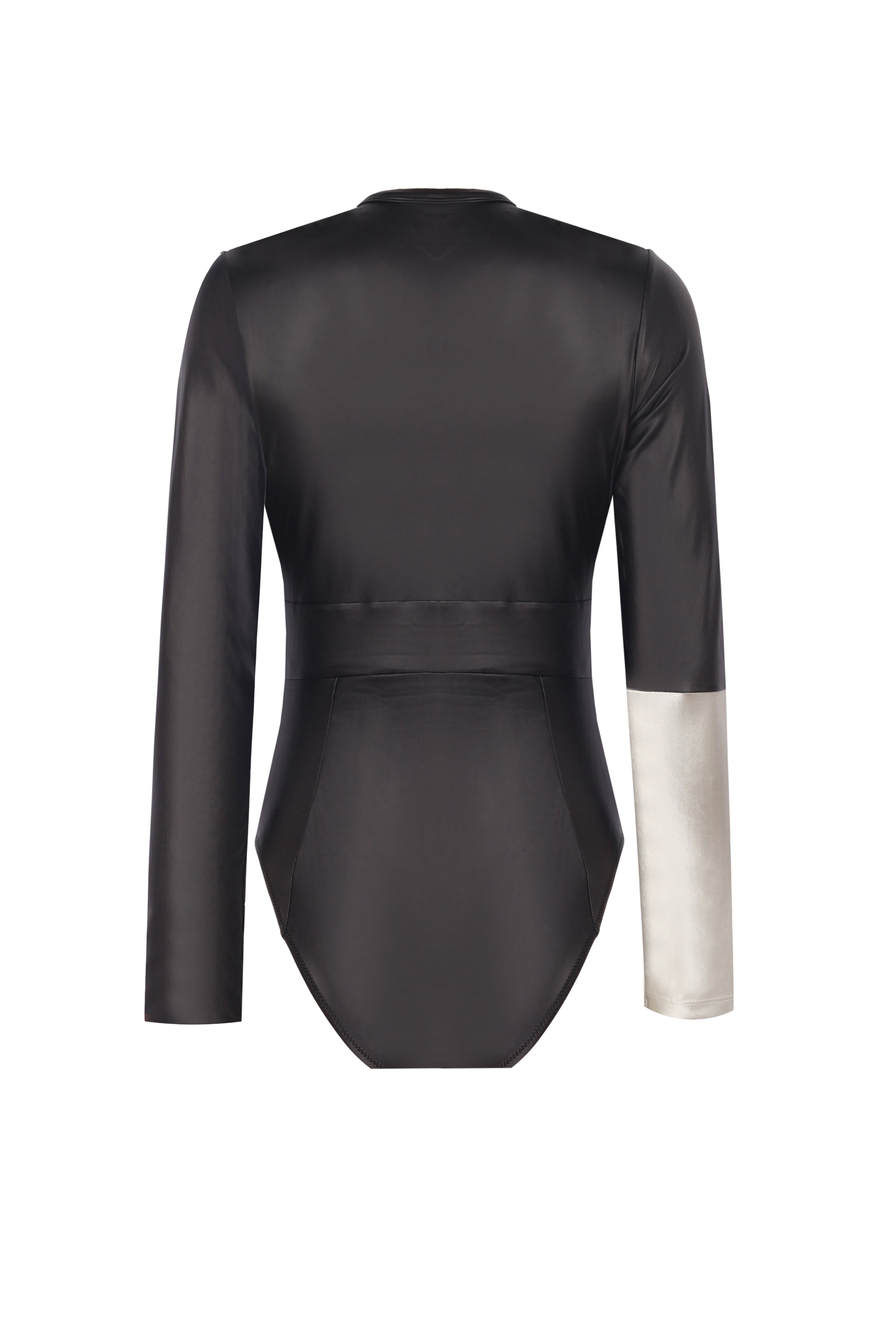 Our new surf suit with leather effect and wet look. One arm is dore. Front zipper is 30 cm. It is designed to make wearing easier. The waist cut and side cups are designed to fit well on the body and make you feel better.