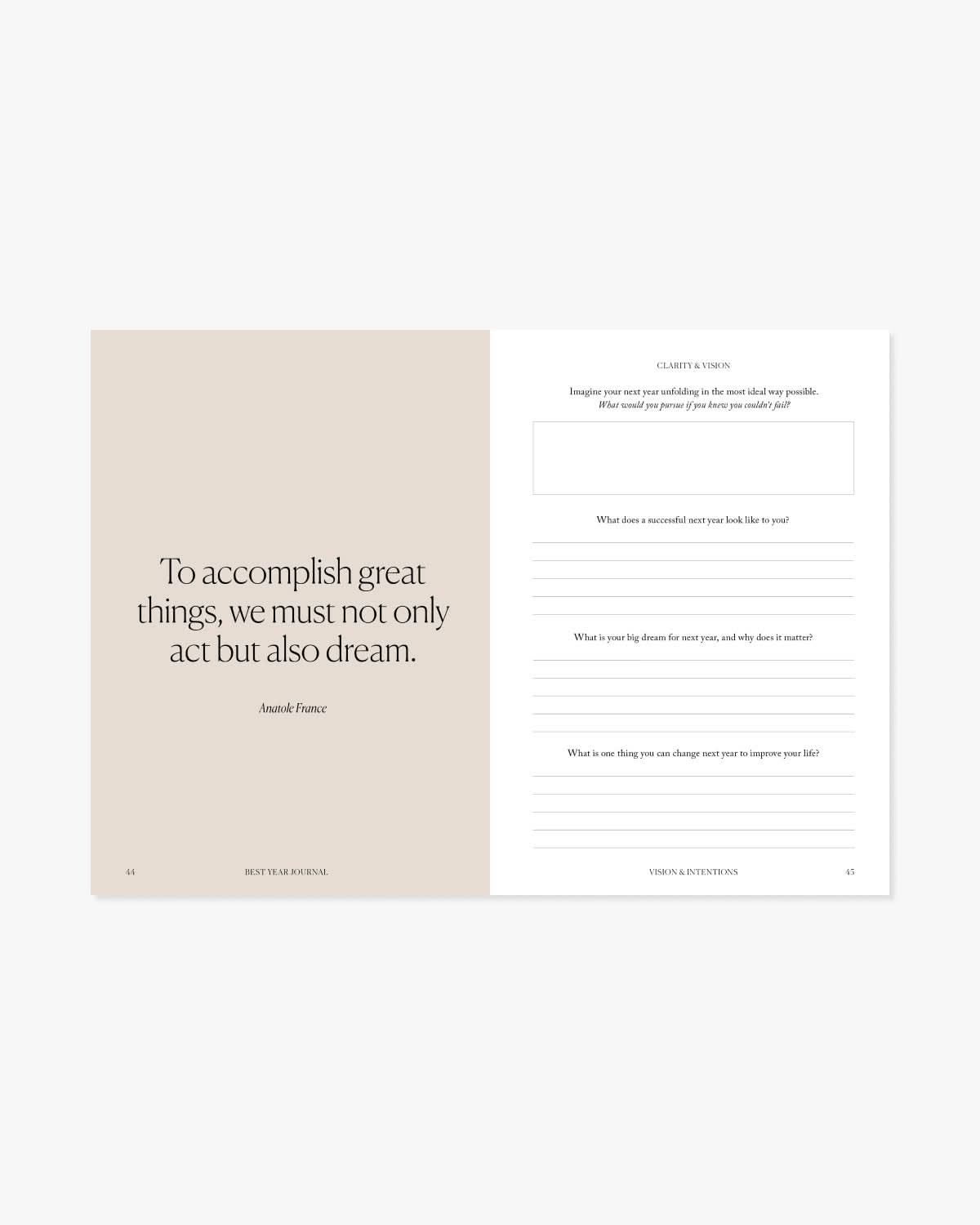 The digital Best Year Journal Essential Edition is your space to reflect, gain clarity, and set intentions. With two guided chapters and 75+ easy-to-answer prompts, it helps you look back on what truly mattered, uncover lessons, and shape a meaningful vision for the year ahead—without the pressure of rigid goals or detailed planning. Your year, your way.
