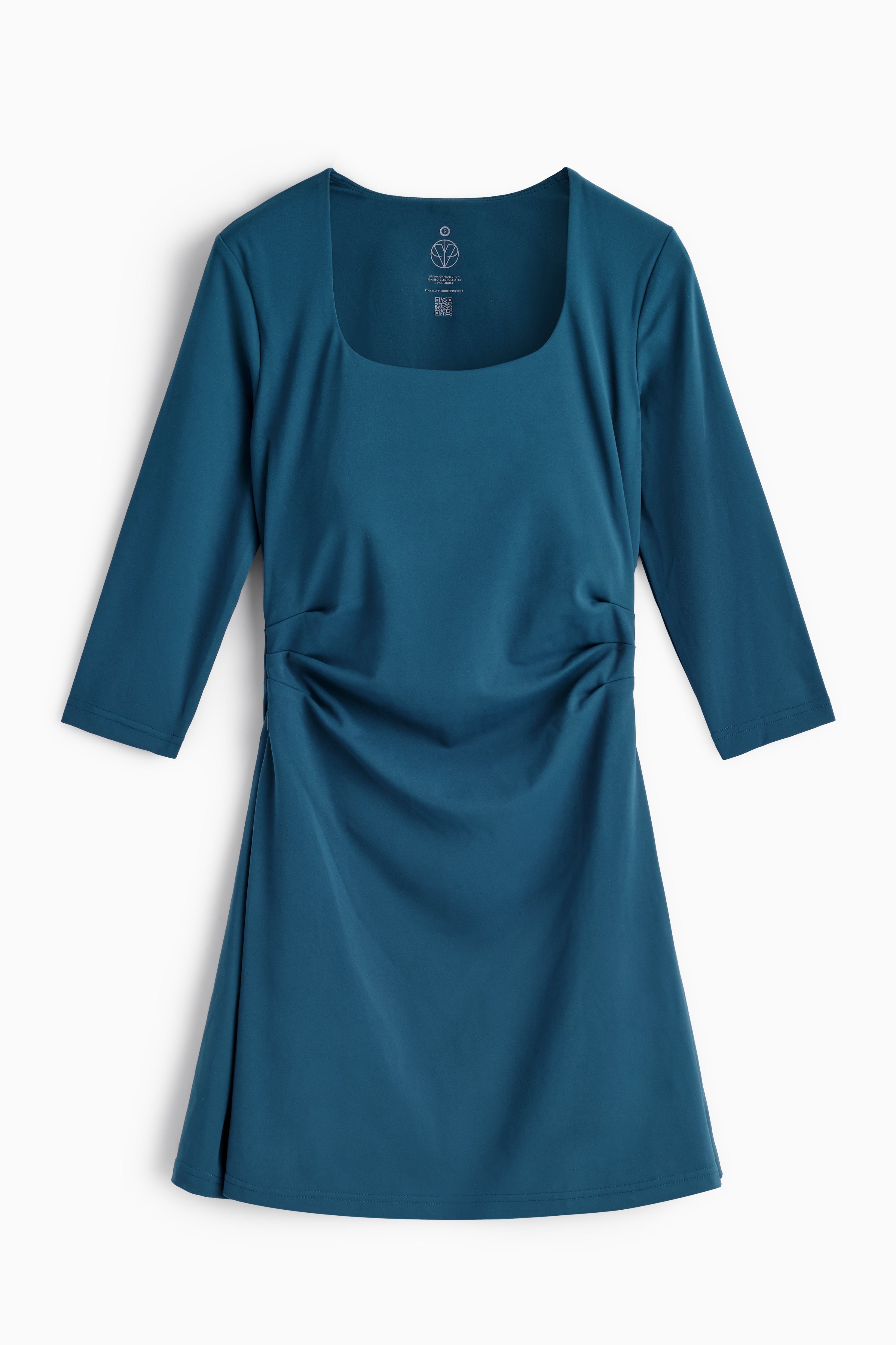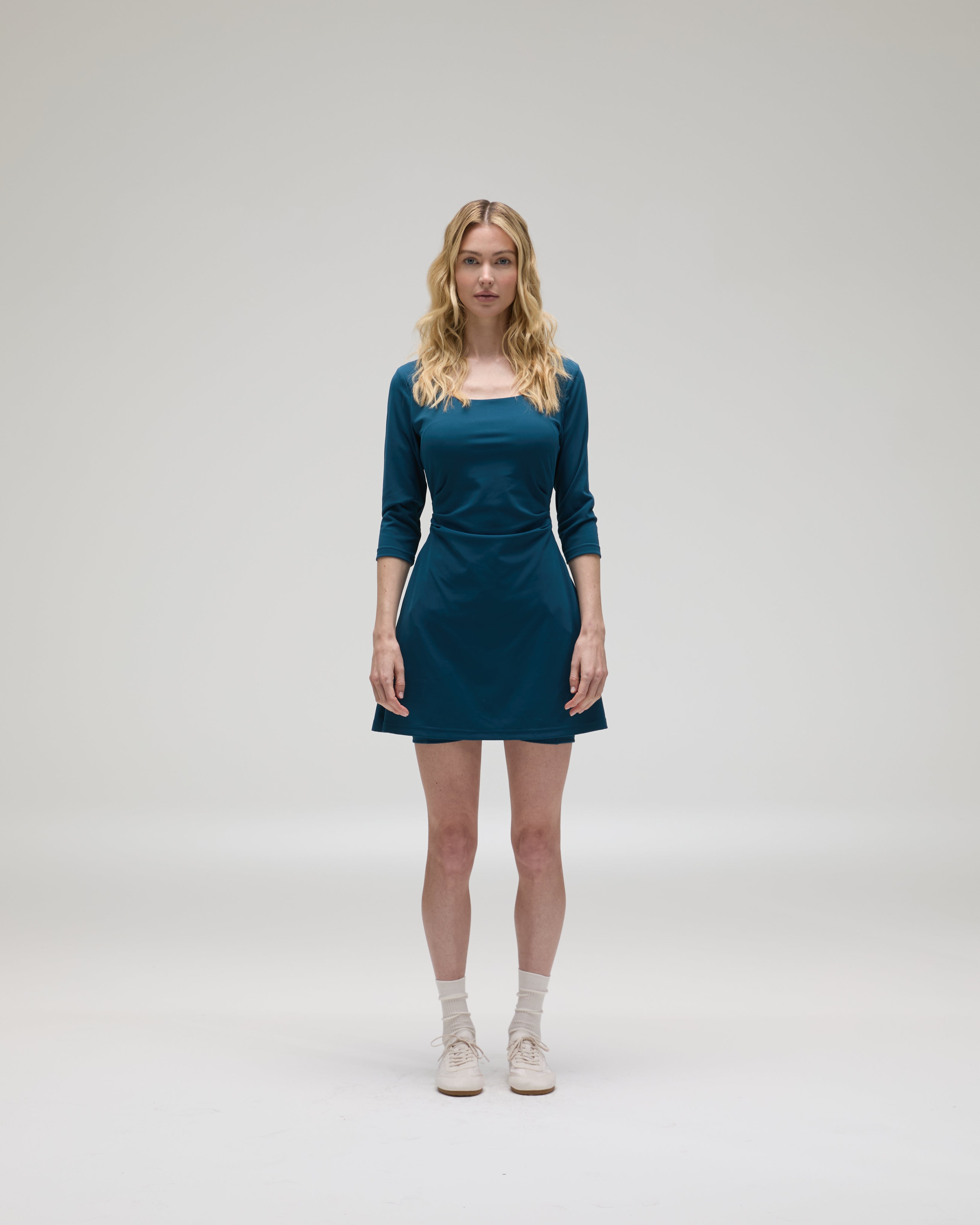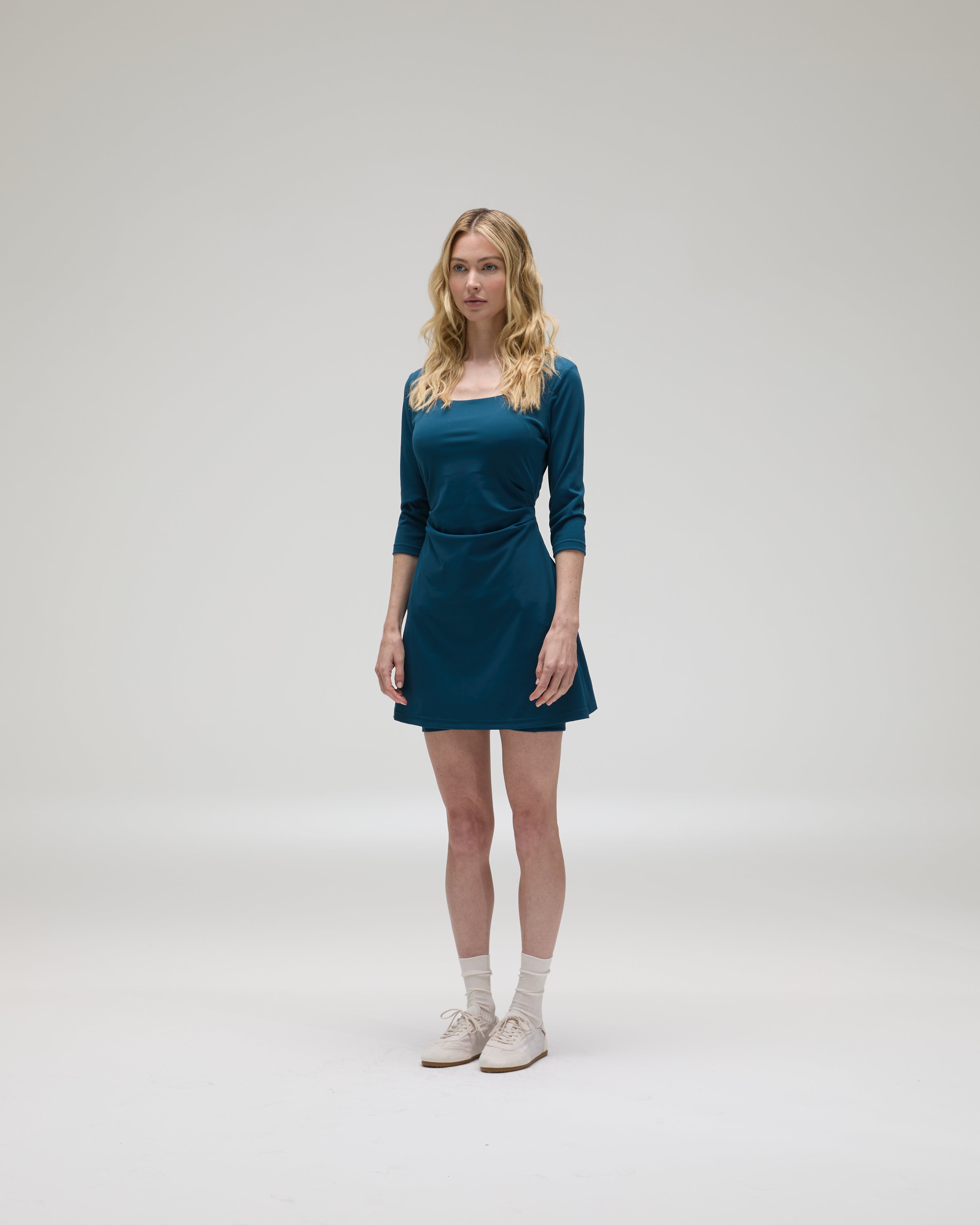 The Bethany 3/4 Sleeve Dress blends refined style with modern performance for effortless wear on and off the course. Crafted from a smooth stretch fabric with UPF 40+ sun protection, this flattering silhouette features a square neckline, 3/4 sleeves, and subtle ruching at the waist for a sculpted fit. Thoughtfully designed with invisible side zip pockets and a built-in bra with removable padding, the Bethany Dress offers comfort and versatility for golf, tennis, and everyday wear.
