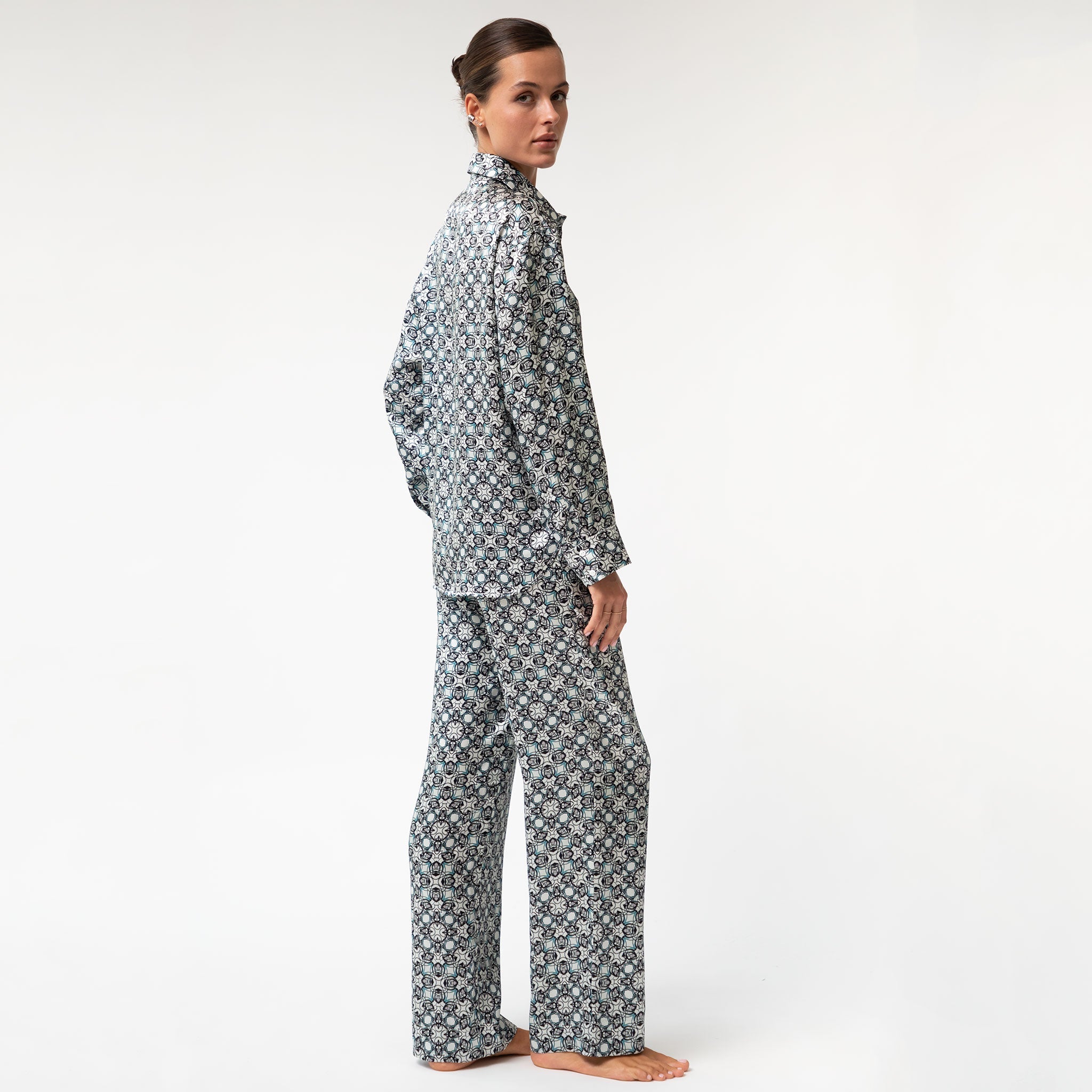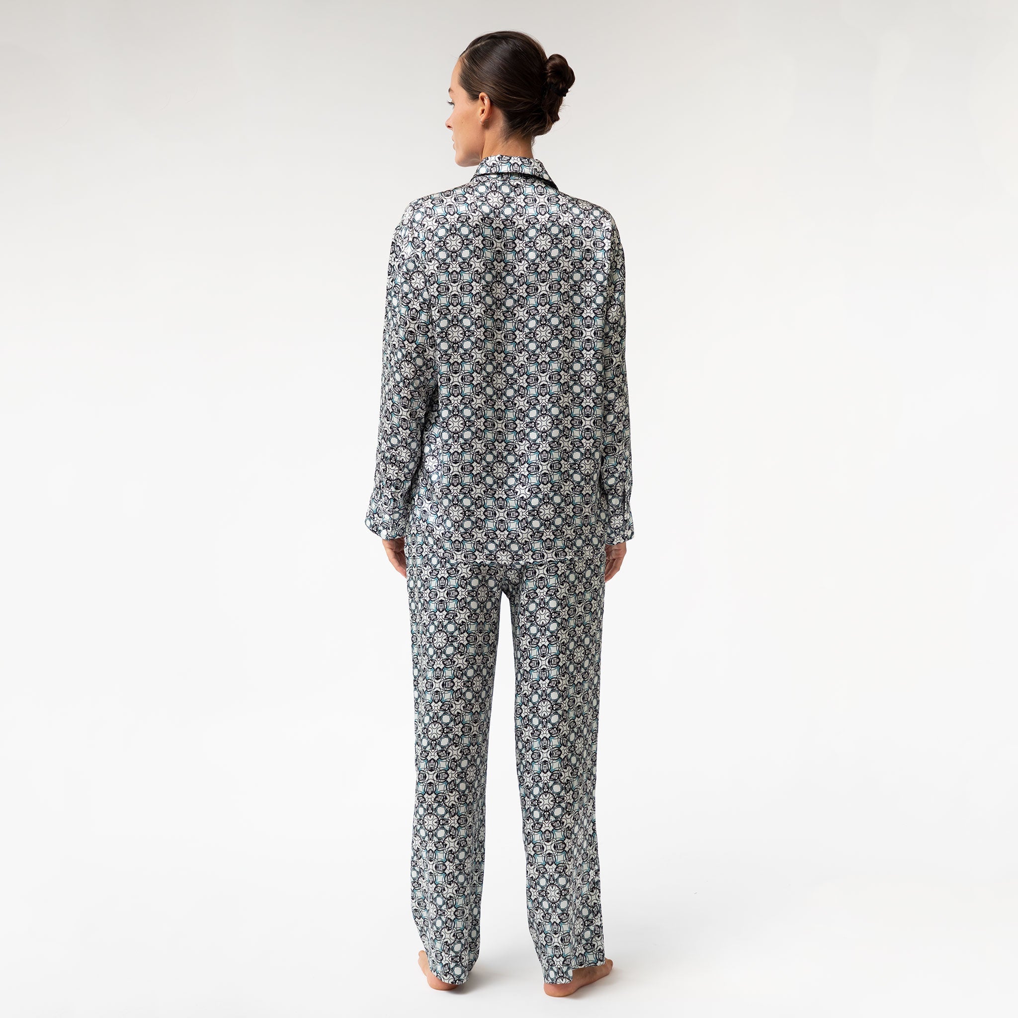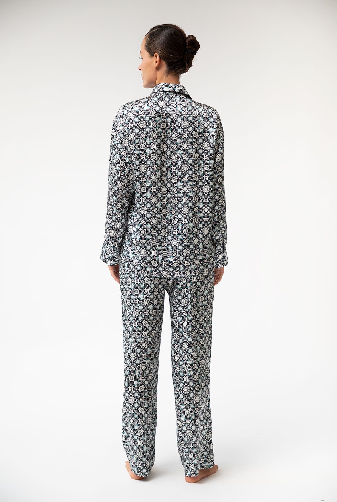This bespoke print features bold black crystals that exude contemporary elegance, complemented by subtle hints of rich emerald green and antique rose tones. It is designed with an in-and-out aesthetic and is ideal for the time at home and casual lounging.