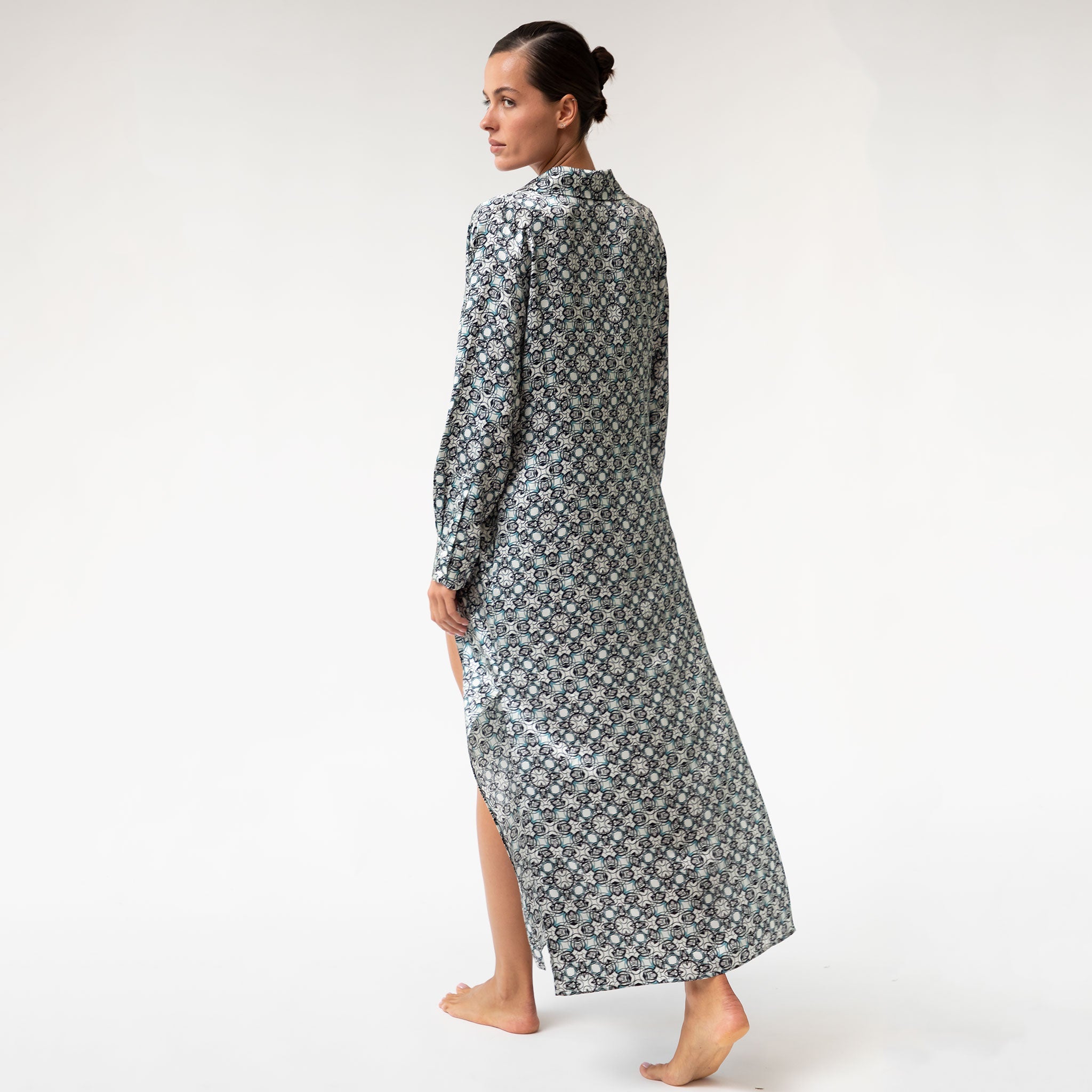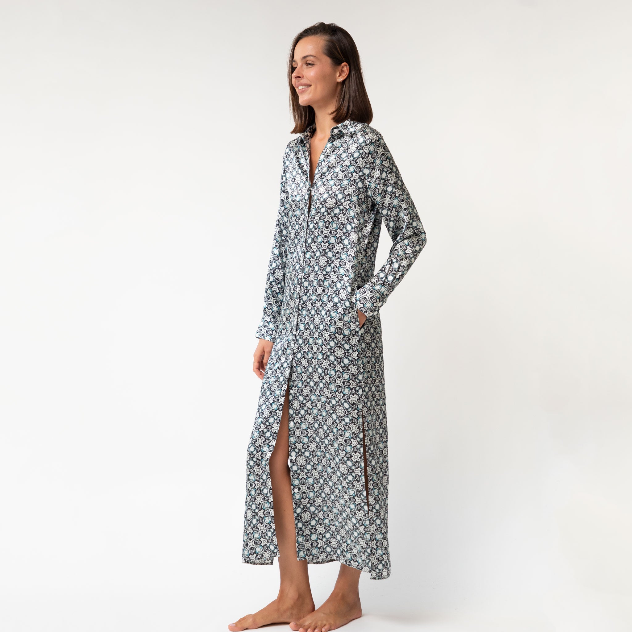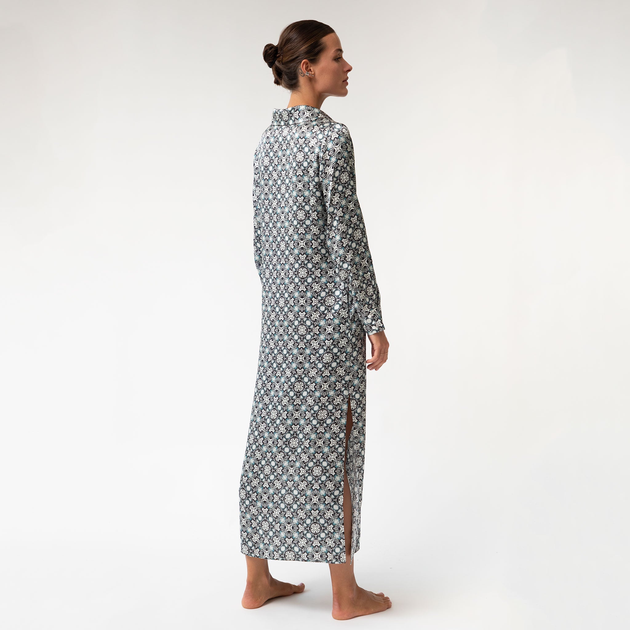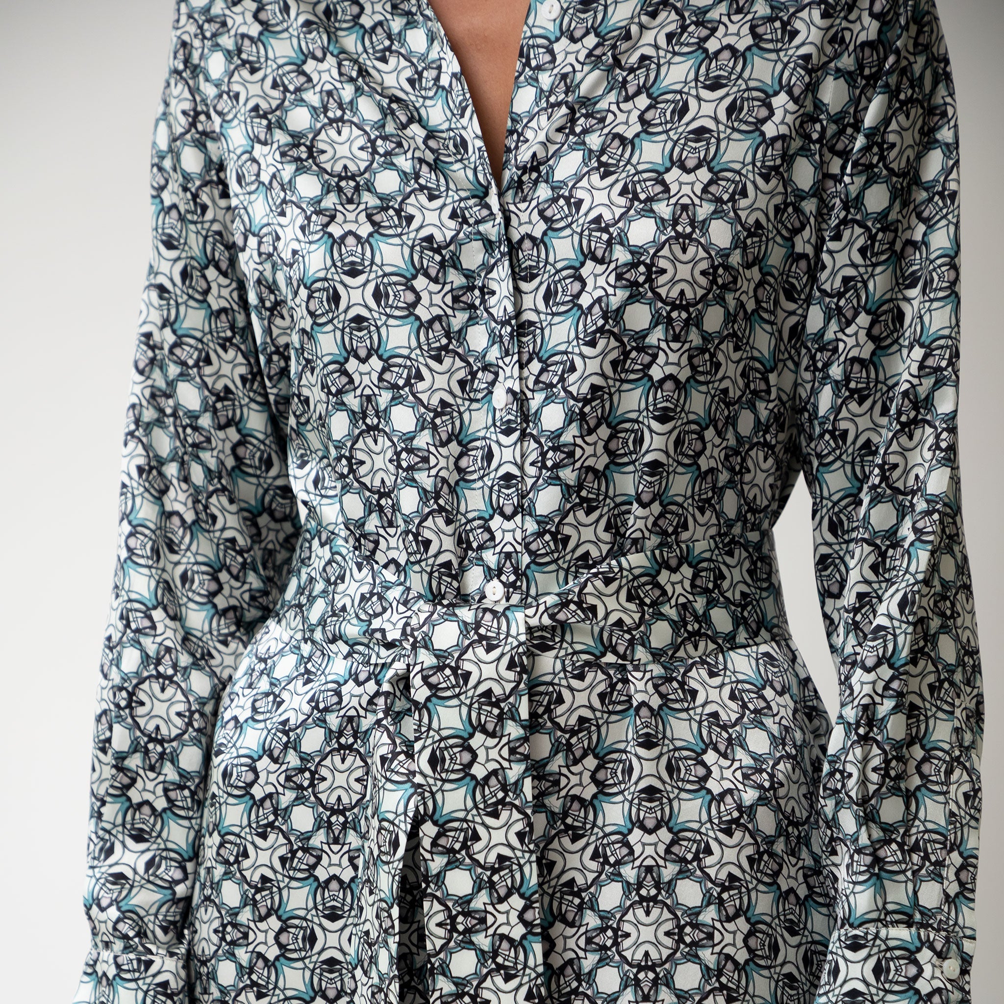 The Neo Geo Silk Long Shirt Dress is made from 100% washable Mulberry Silk, ensuring a consistent and striking design, while the button-down front adds a touch of classic elegance. Designed for a slim fit, if you prefer a looser fit, consider sizing up.