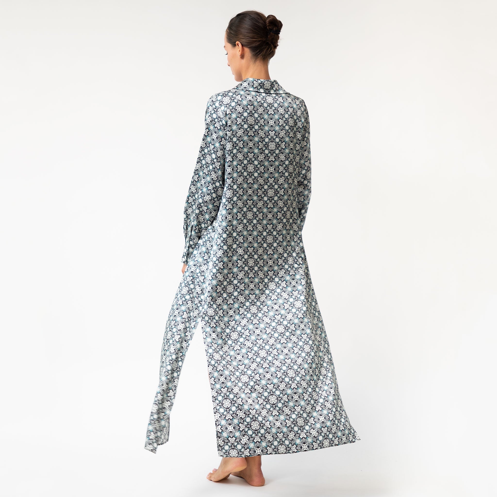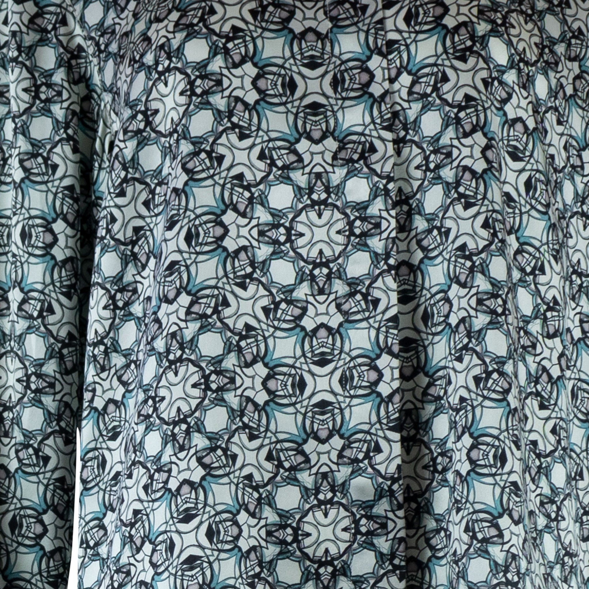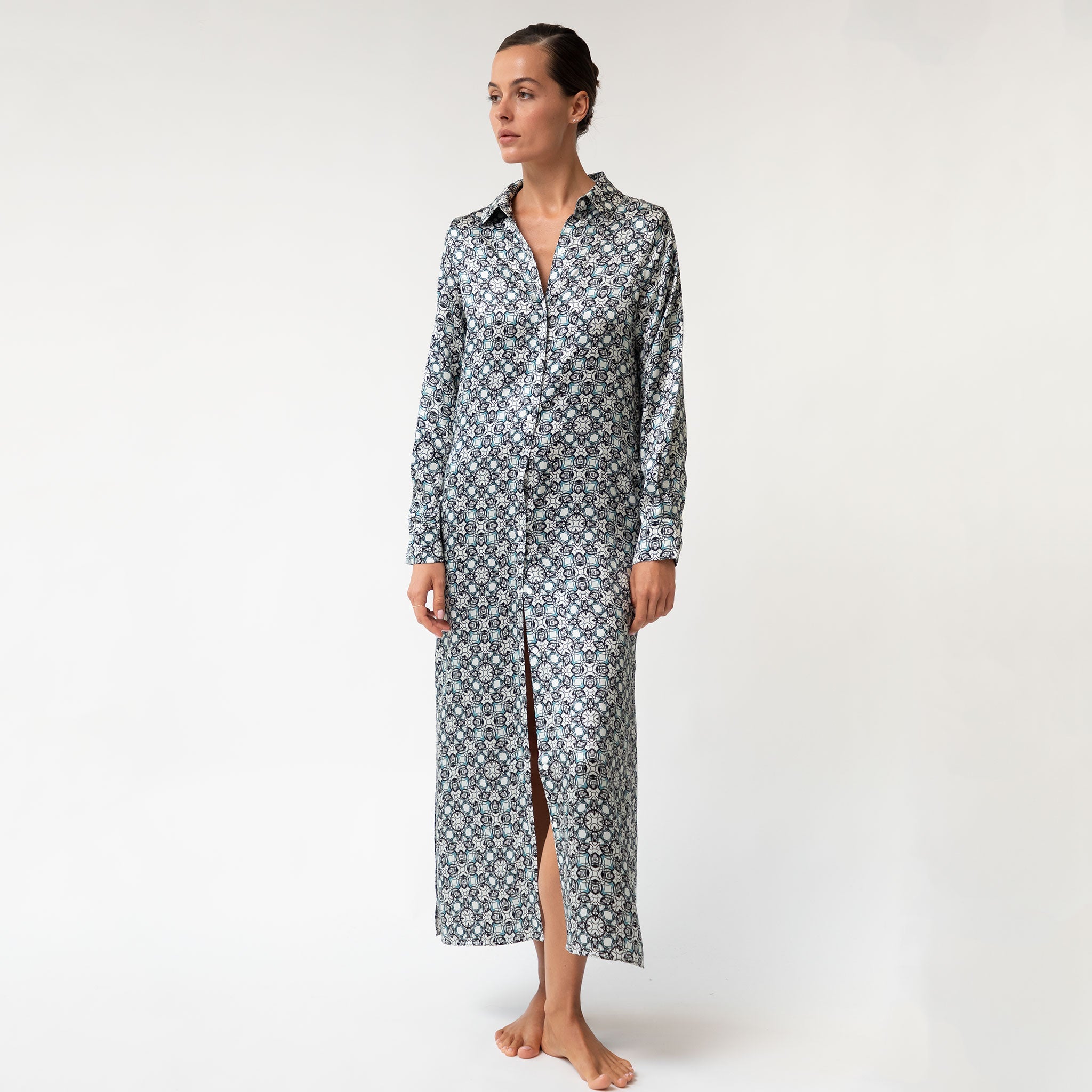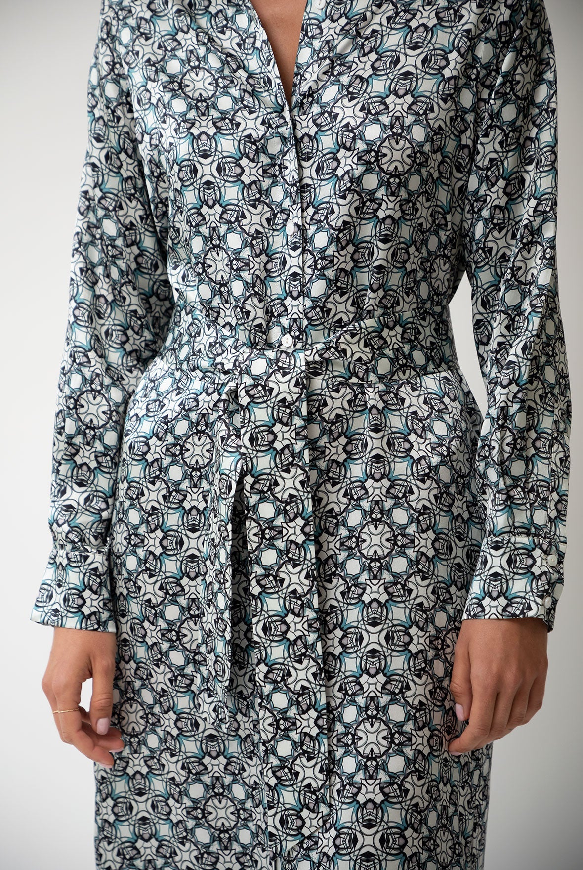 The Neo Geo Silk Long Shirt Dress is made from 100% washable Mulberry Silk, ensuring a consistent and striking design, while the button-down front adds a touch of classic elegance. Designed for a slim fit, if you prefer a looser fit, consider sizing up.
