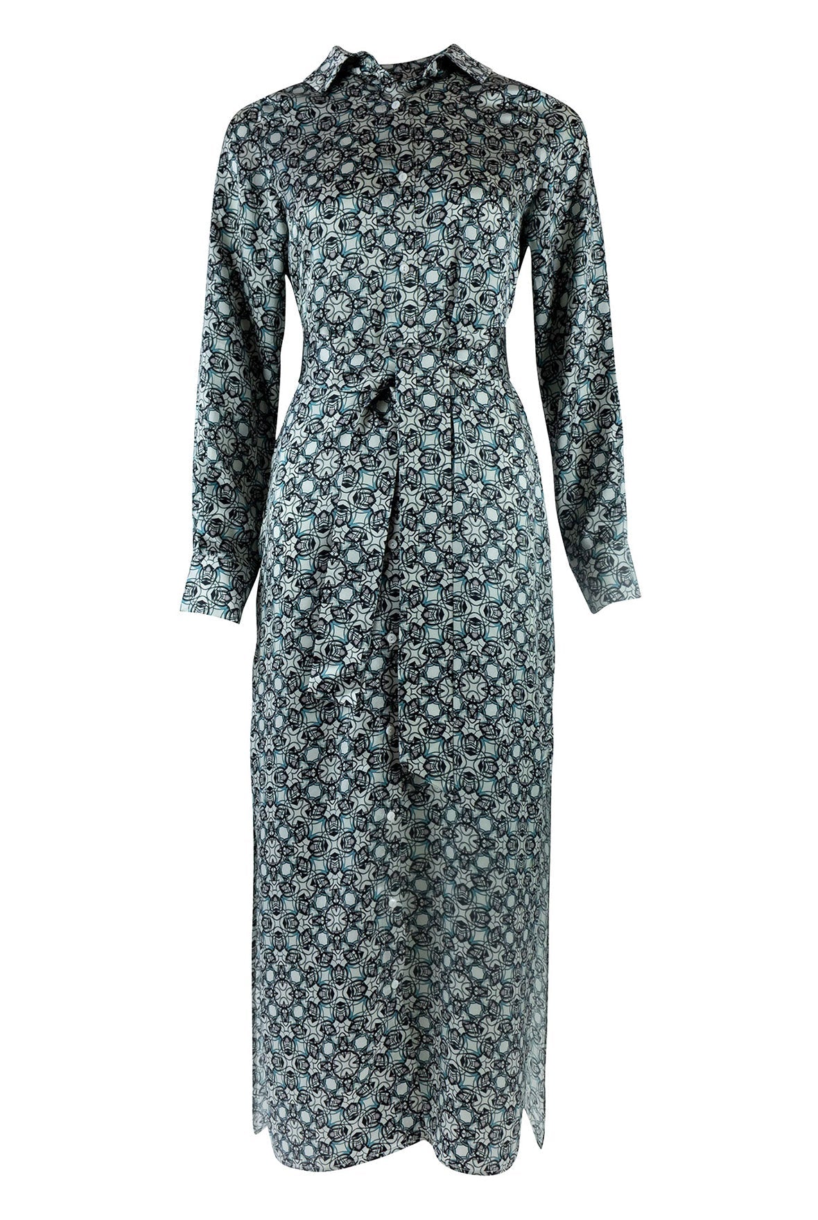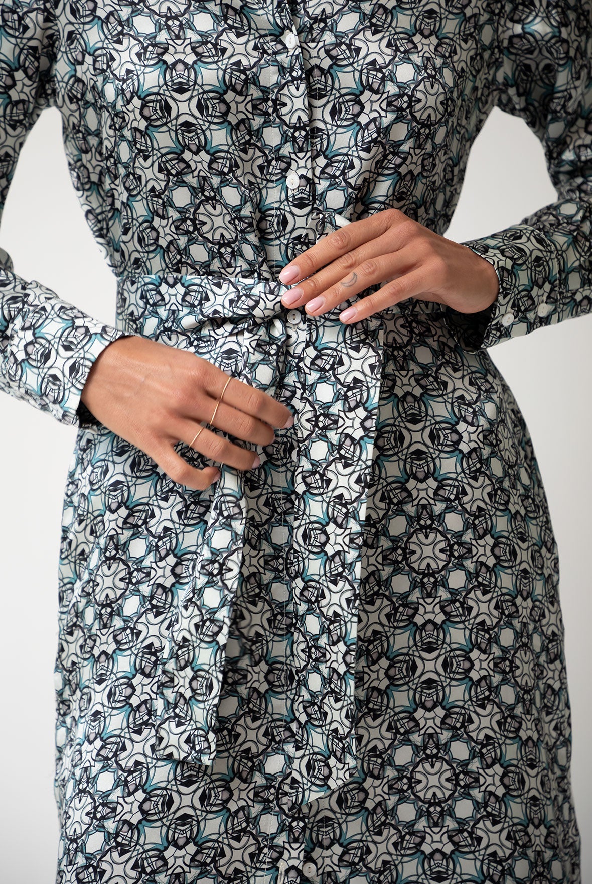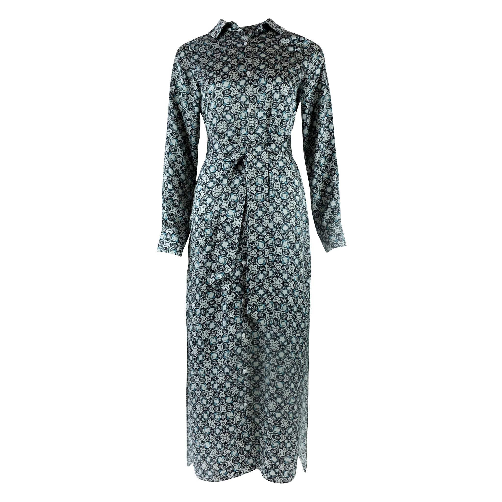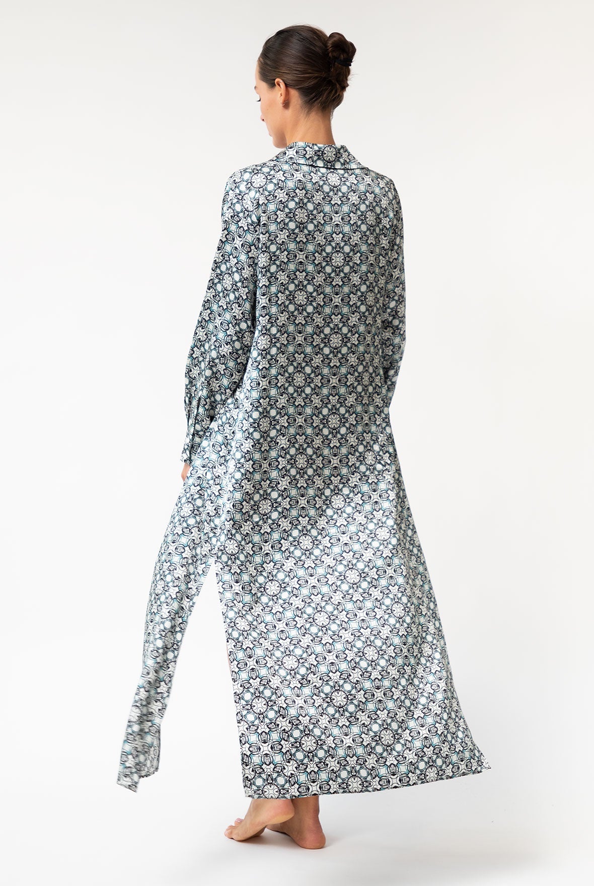 The Neo Geo Silk Long Shirt Dress is made from 100% washable Mulberry Silk, ensuring a consistent and striking design, while the button-down front adds a touch of classic elegance. Designed for a slim fit, if you prefer a looser fit, consider sizing up.