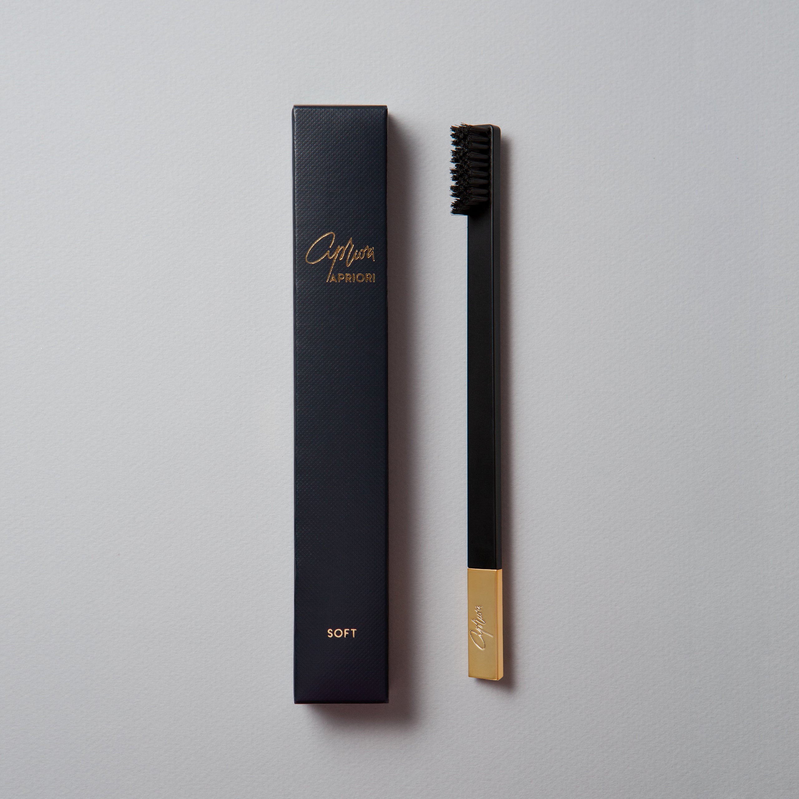 The Apriori® toothbrush, featuring its asymmetrical head shape and densely packed soft bristles made from innovative plant-based fibres, excels at its task. With it, oral hygiene becomes both effective and safe for enamel and gums, turning the routine of tooth brushing into a source of positive emotions.