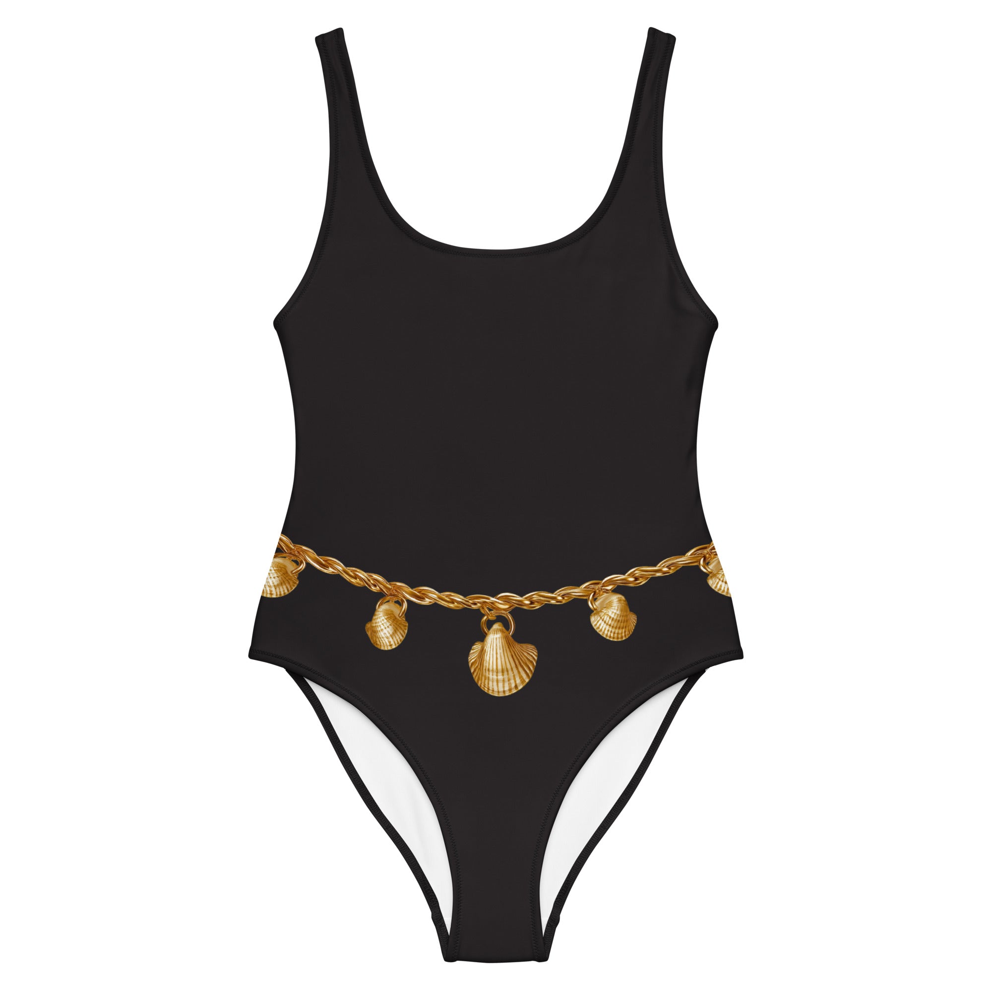 Minimal from a distance — magnetic up close. This Black One-Piece Swimsuit is a study in contrasts: sleek and understated yet adorned with a shimmering gold shell chain print that wraps the waist like jewelry made for the sun.
