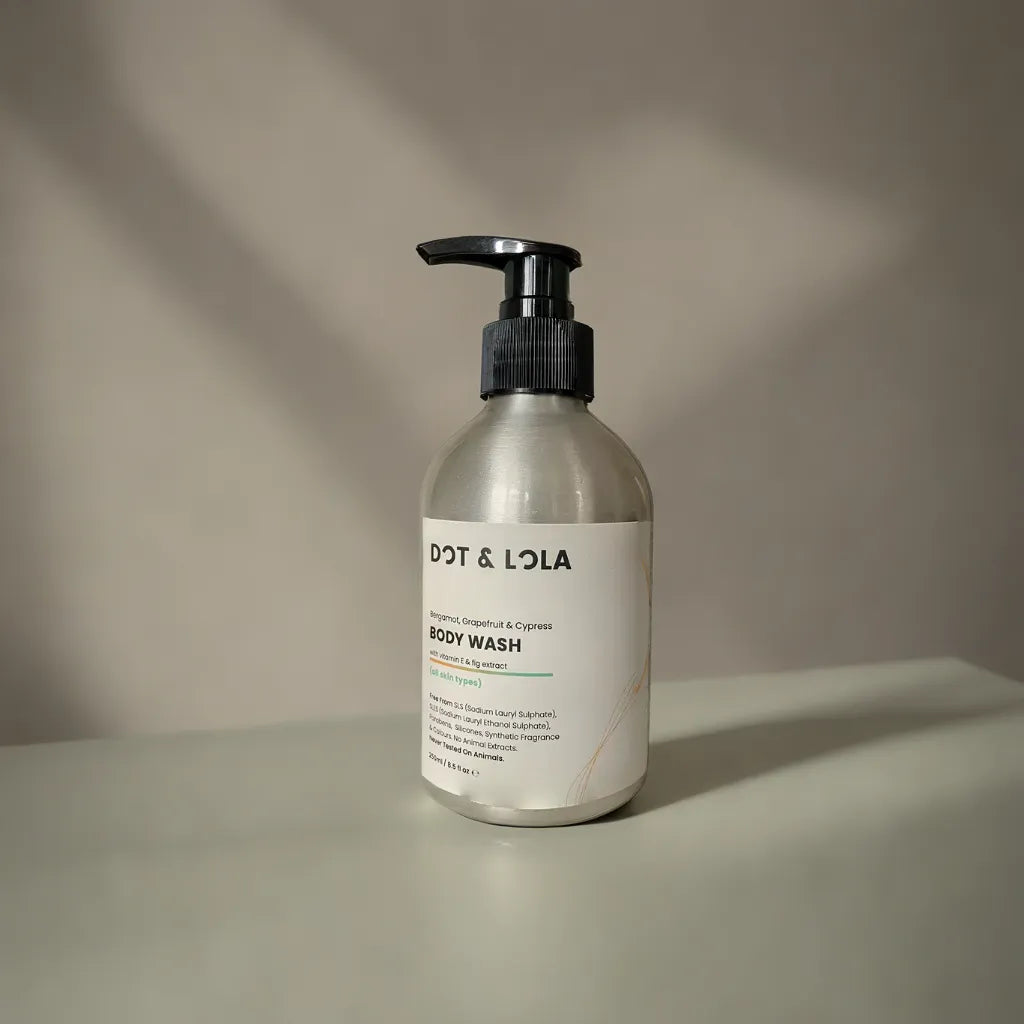 Wet body. Apply a small amount of body wash to a puff or mitt, lather under warm water and cleanse. Alternatively pour under a hot tap for a luxurious bathing experience. Towel dry in preparation for Dot & Lola body lotion.