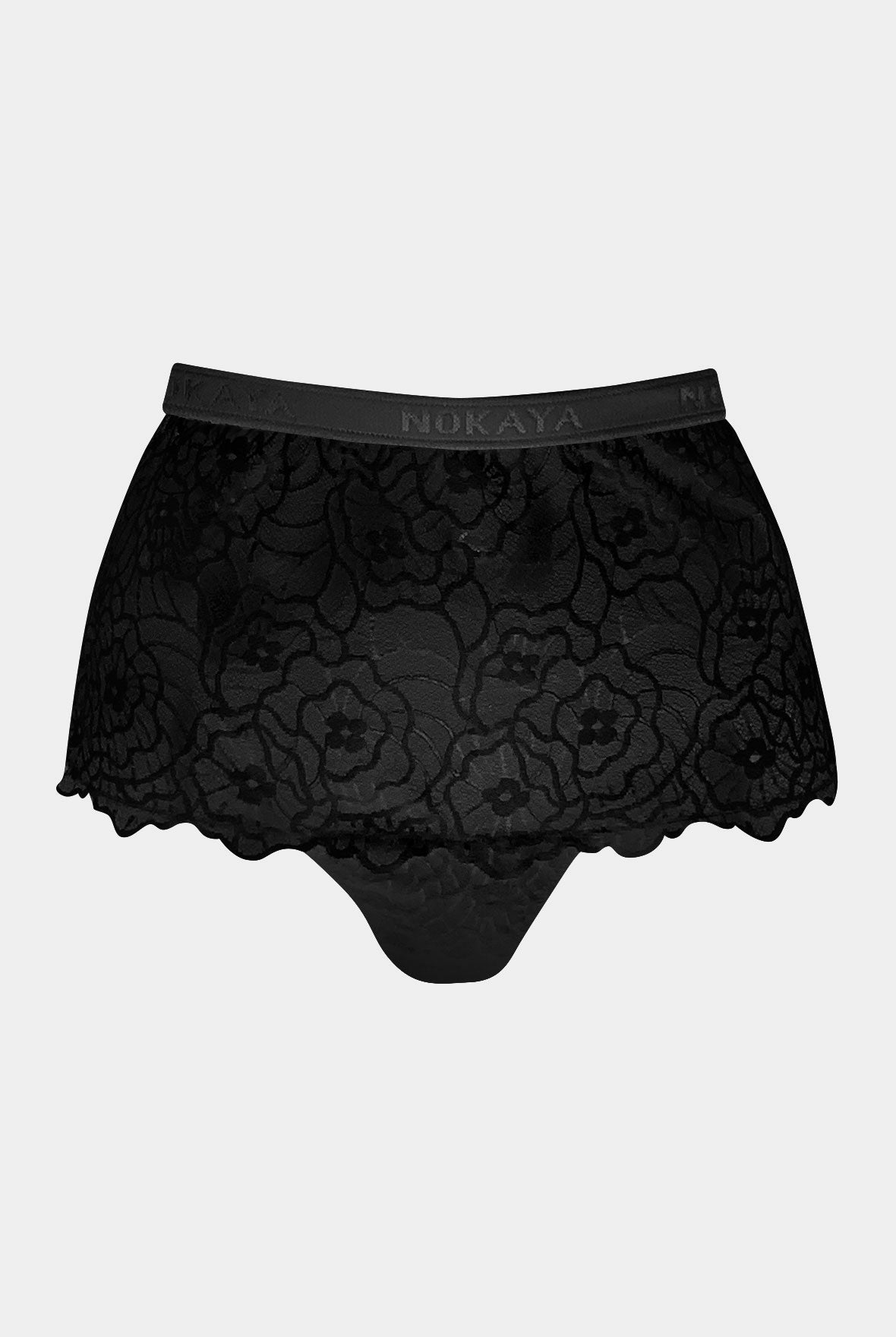 High-waist briefs are designed to hug your body with lace and accentuate your waist with a logotype elastic band. The contemporary take on floral pattern lace with a scalloped edge draws a new generation of women. Stretch and smooth soft lace with viscose in its composition increase the desire to wear these briefs for a stylish sleep set or as a cool look for daily wearing.