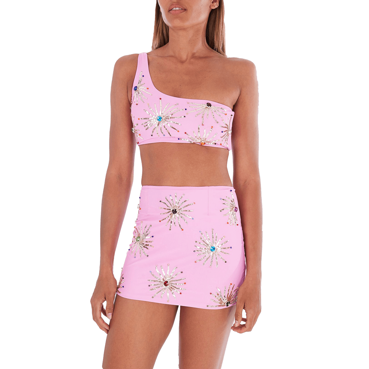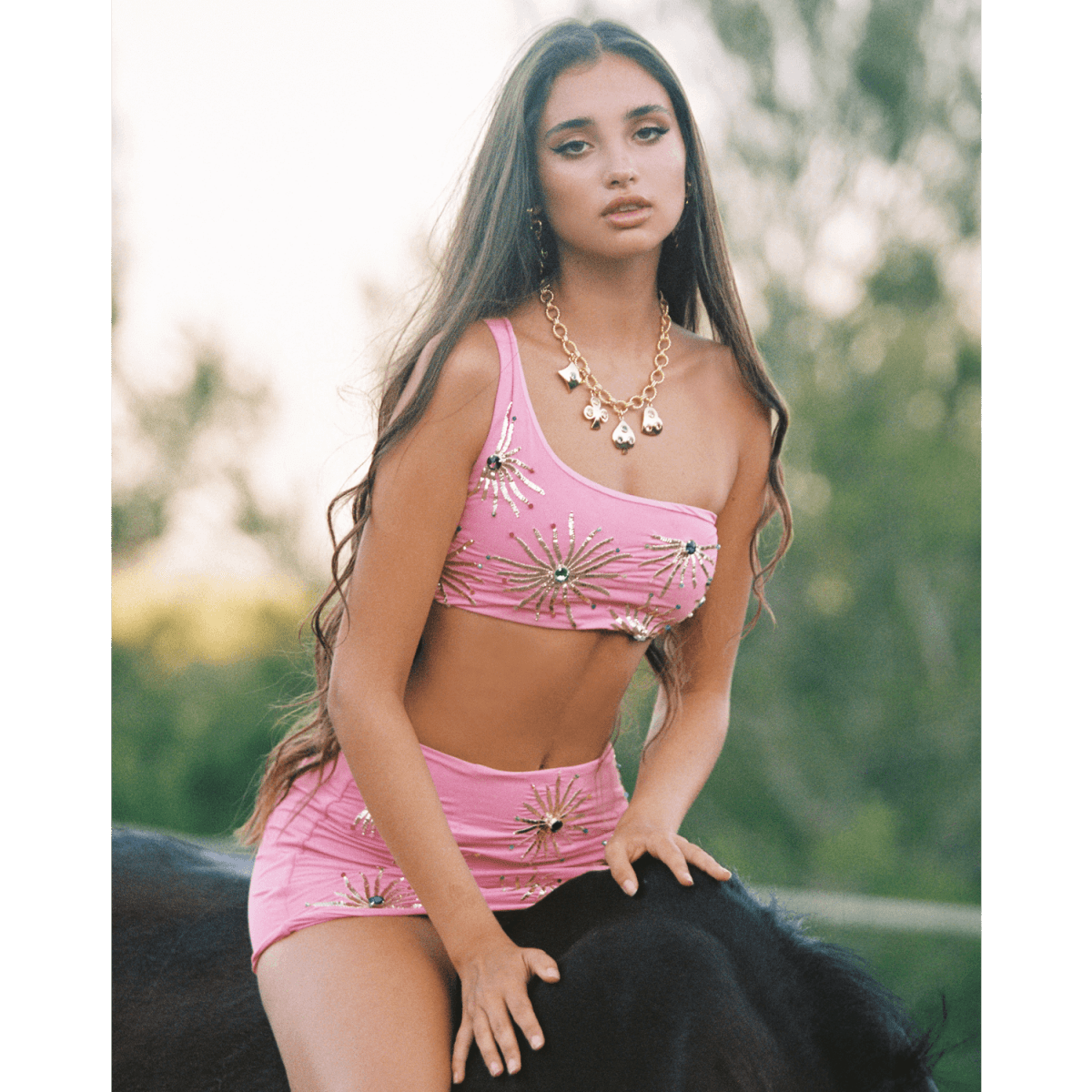 Add effortless glamour with the Callie Co-Ord Pink Top. Made from eco-friendly lycra with delicate crystal embroidery, this crop top is a must-have for resort wear, festival fashion, and party-ready looks. Pair it with skirts, shorts, or the matching co-ord for a chic, sustainable outfit that’s perfect for vacation nights and beach clubs.