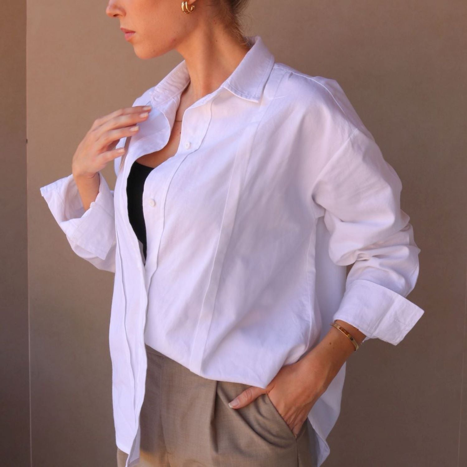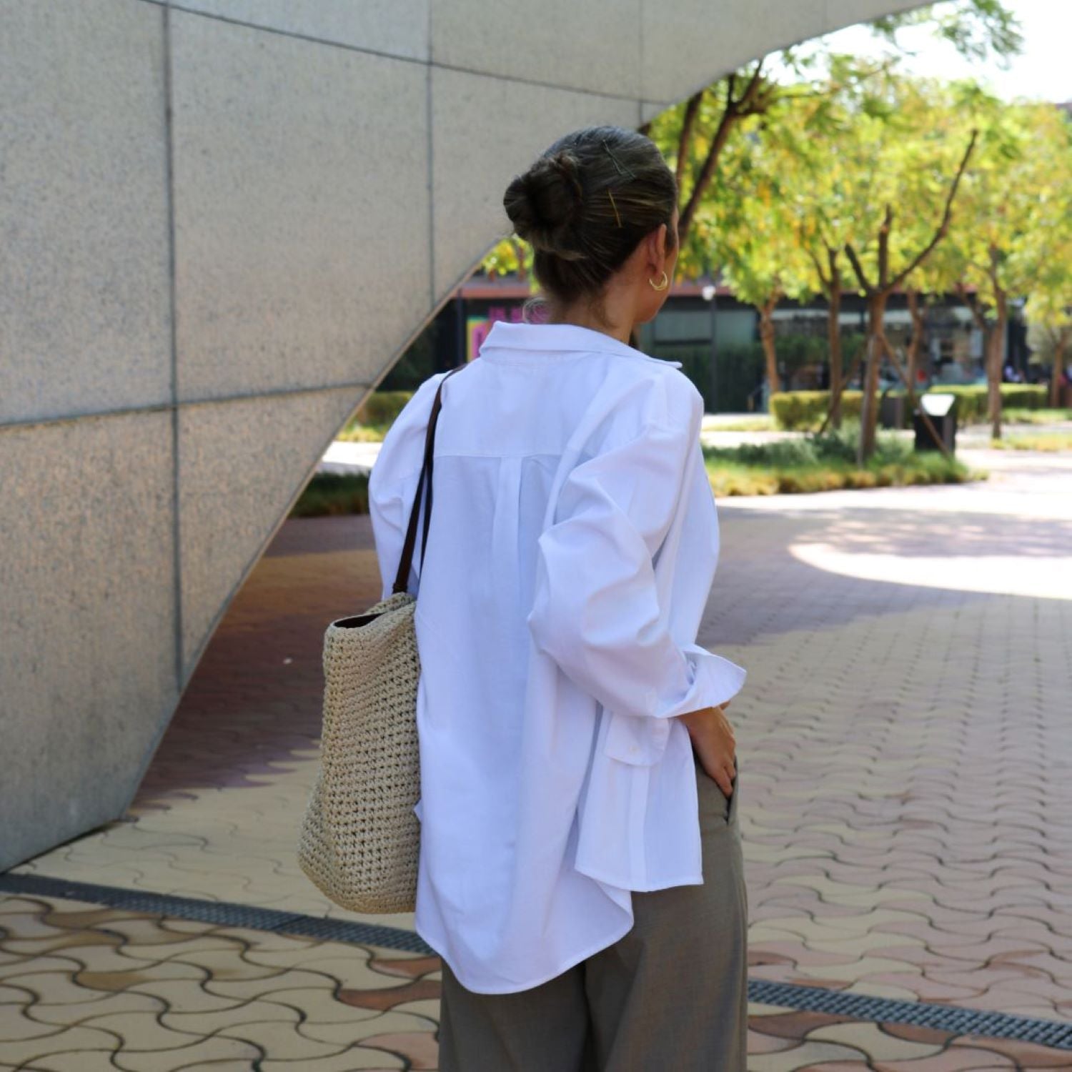 La camisa Leah está confeccionada con tejido 100% de algodón orgánico. Su corte holgado y hombros caídos hacen de esta prenda el básico perfecto para ser la base de cualquier look tanto de día como de noche. Está terminada con dos tapetas en la parte frontal y un pliegue en la espalda que aportan forma a la camisa.