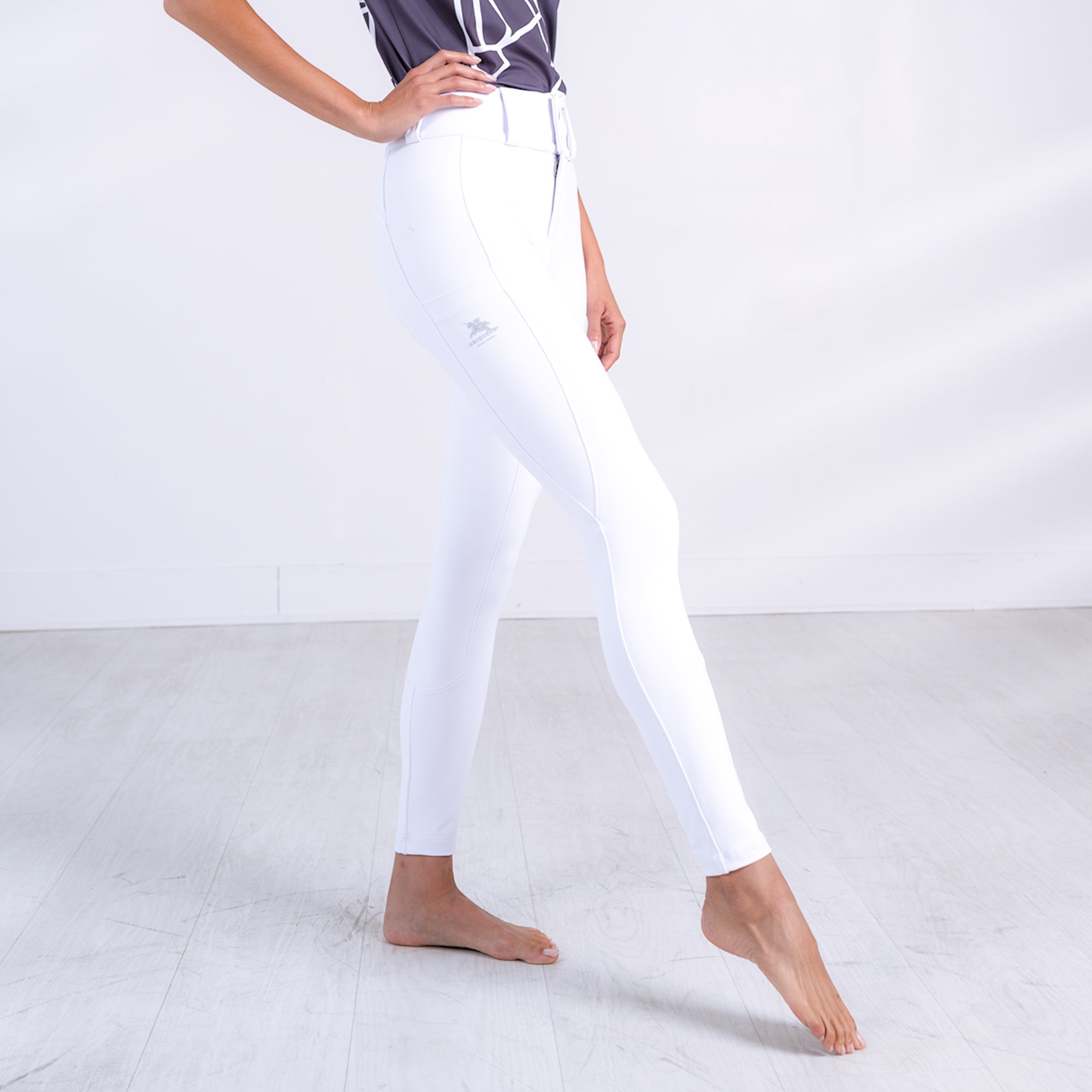 Discover performance perfection in our "Catherine Haddad Collection" white competition breeches. Crafted for equestrian athletes, these breeches offer superior comfort with 360º stretch fabric, firming properties, and 100% opacity. Experience the ideal blend of support, second-skin feel, and shape retention. Elevate your ride with timeless excellence!