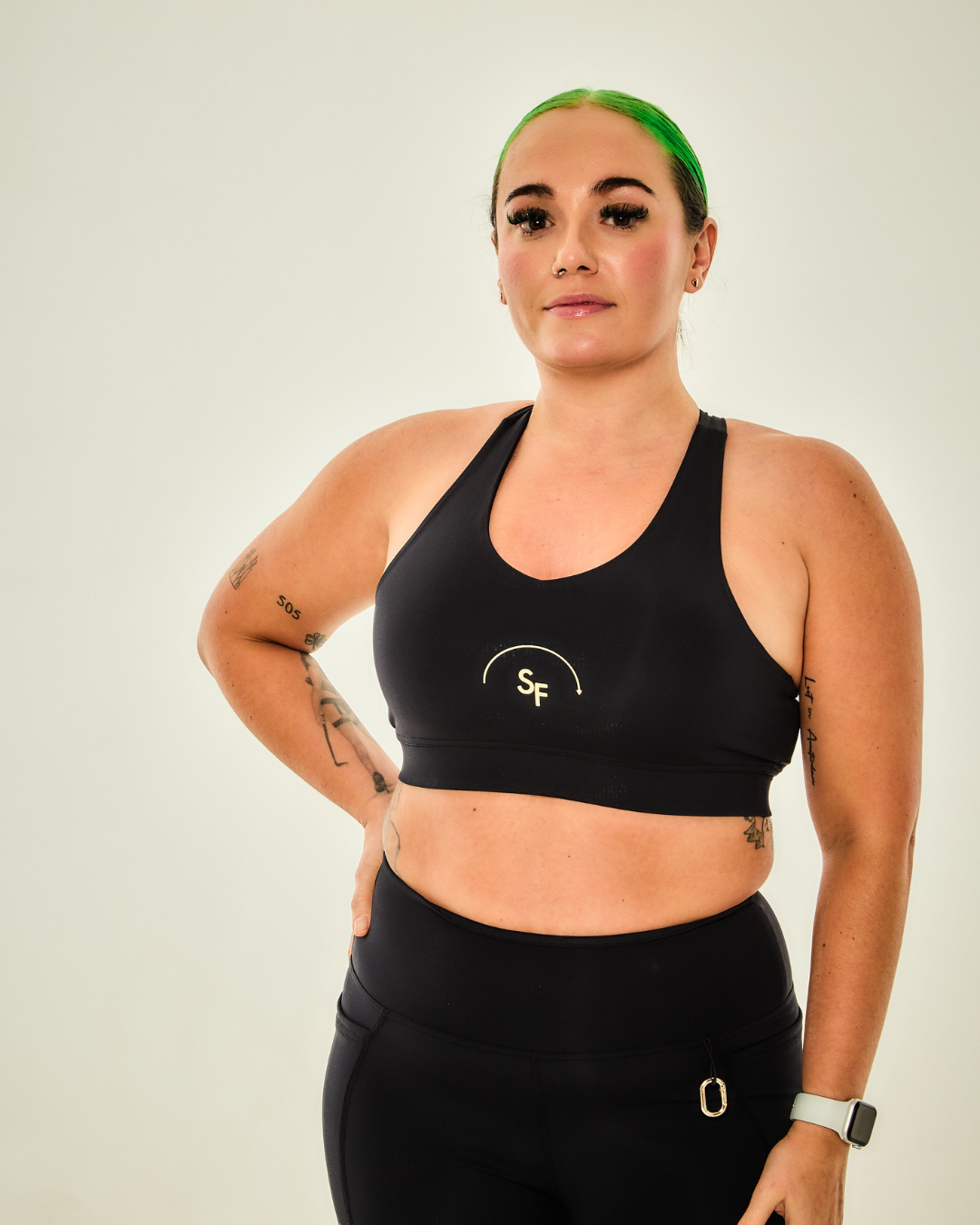 Sustainable, ‘V’ neckline, racerback and extremely comfortable and supportive. This also has high UV protection.