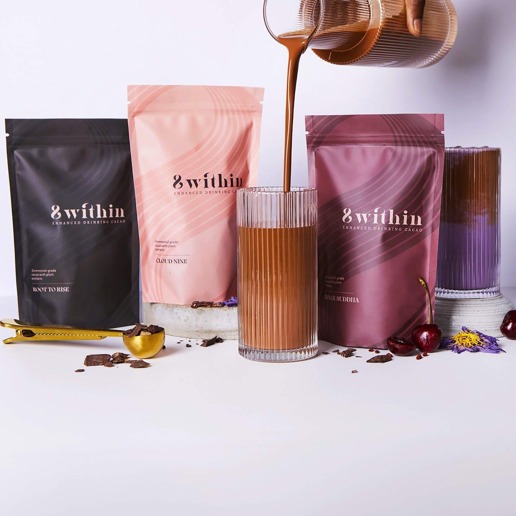 This enhanced ceremonial cacao kit includes 3 x 140g mood-boosting cacao elixirs: Cloud Nine, Inner Buddha and Root to Rise..