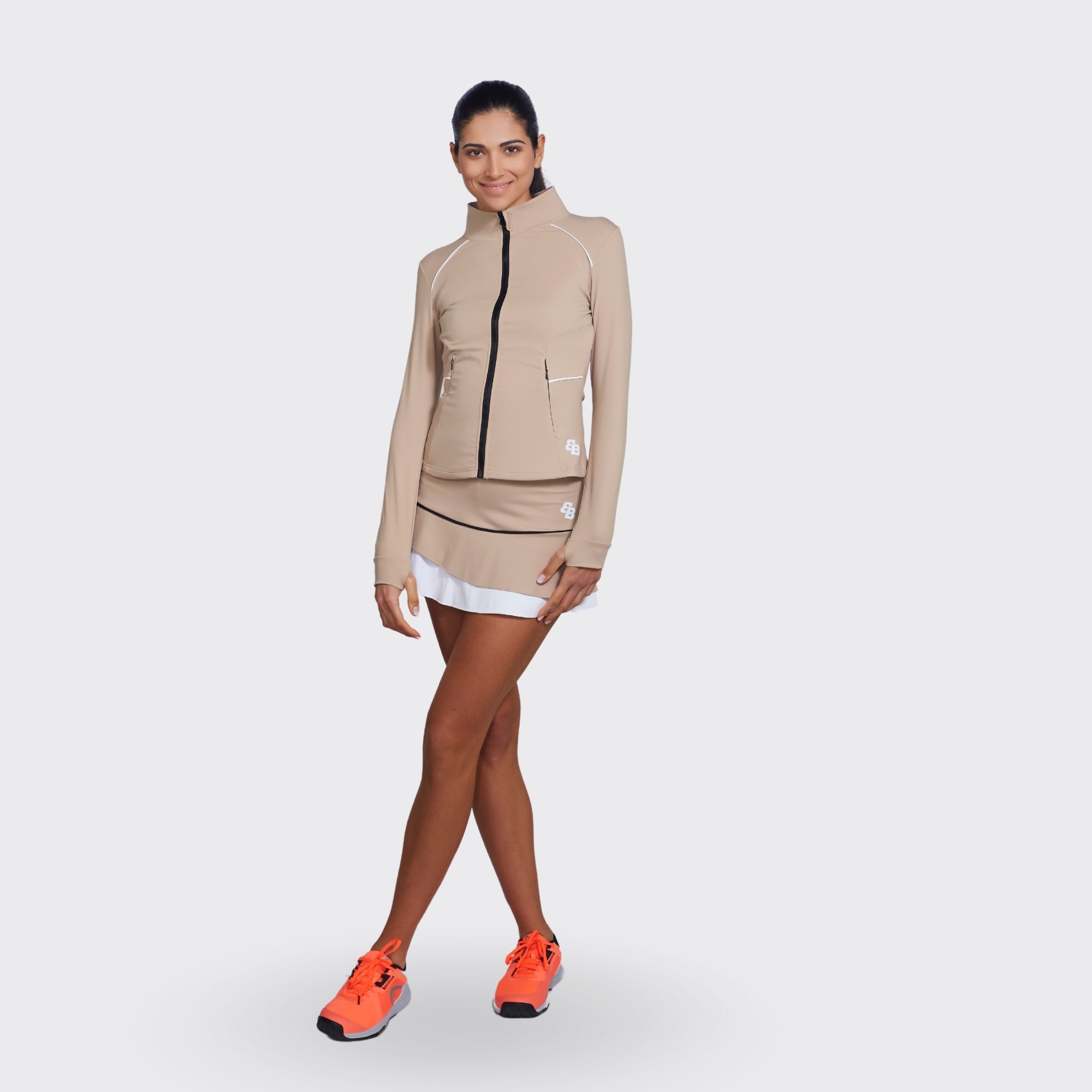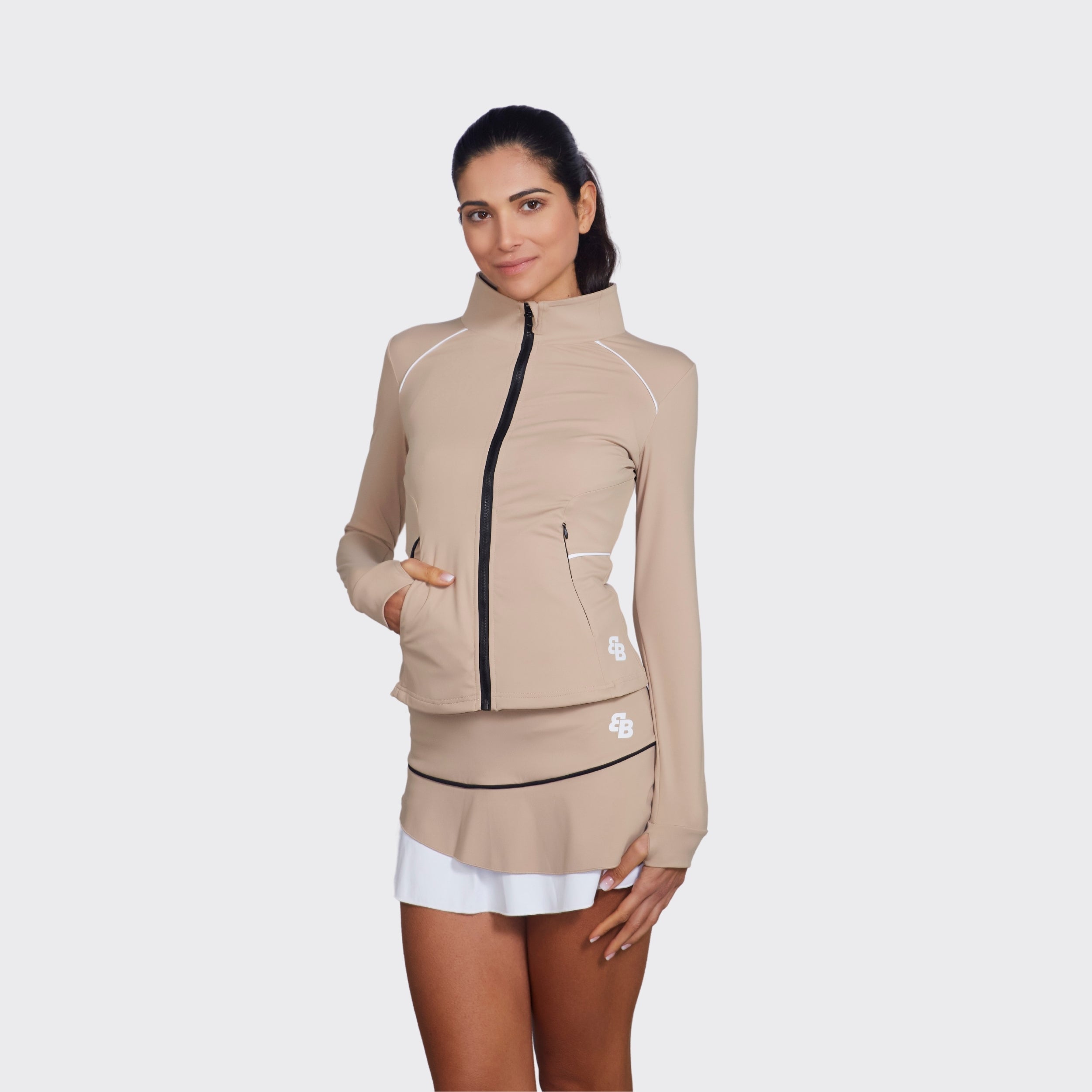 The beige Hina jacket is a versatile and functional garment, ideal for outdoor activities or a casual look. It's made with high-quality, breathable materials, allowing for good ventilation and comfort during exercise. The beige color gives it a neutral and elegant touch, allowing it to be easily combined with different outfits and styles. It's perfect for both sports and more relaxed everyday wear.