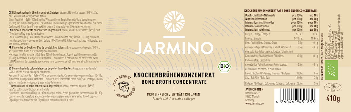 Where do the ingredients come from? We use only organic chicken bones for our bone broth concentrate. Bottled in our manufactory in Bavaria, we source the bones from several farmers who practice sustainable agriculture. Is the concentrate lead-free? Yes, regular laboratory tests prove that there is no lead in it. This is common for organic products. Is the bone broth concentrate free of histamine? Yes, the product is regularly tested, and no histamine could be detected. I case of any further questions, just send us an e-mail support@jarmino.co.uk. |
