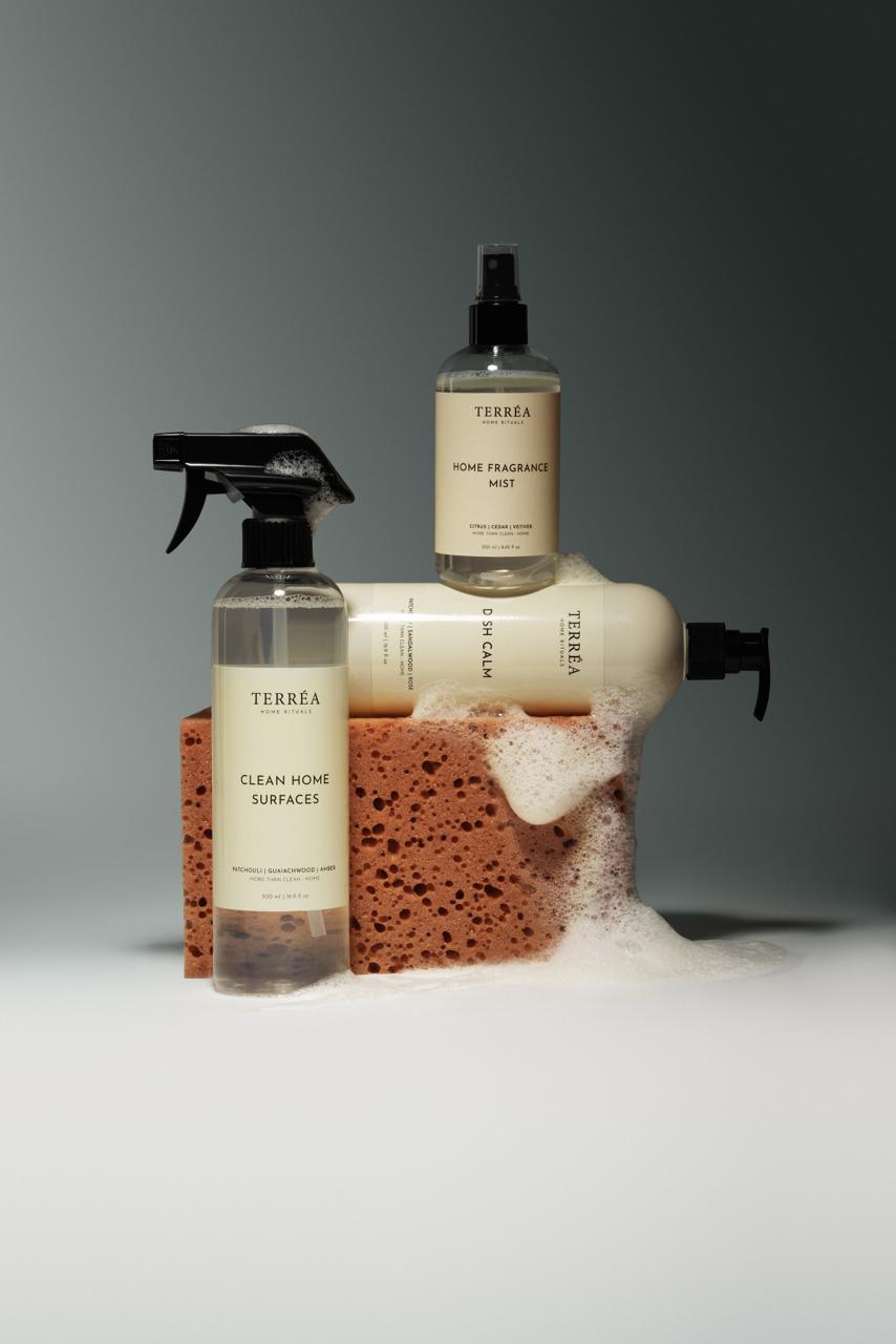 Clean Home Surfaces restores a quiet sheen, Dish Calm keeps glassware crystal and hands comfortable, and Home Fragrance Mist Citrus / Cedar / Vetiver resets the air once the cooking is done.