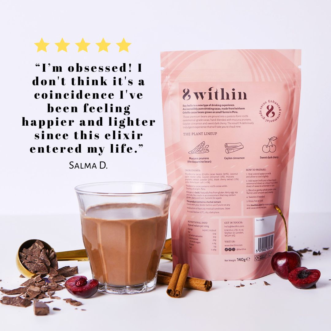 Unlike any other cacao you may have tried, our Cloud Nine Elixir tastes like a heavenly creamy mix of juicy cherries, sweet cinnamon and luxuriously rich melt-in-your-mouth dark chocolate.