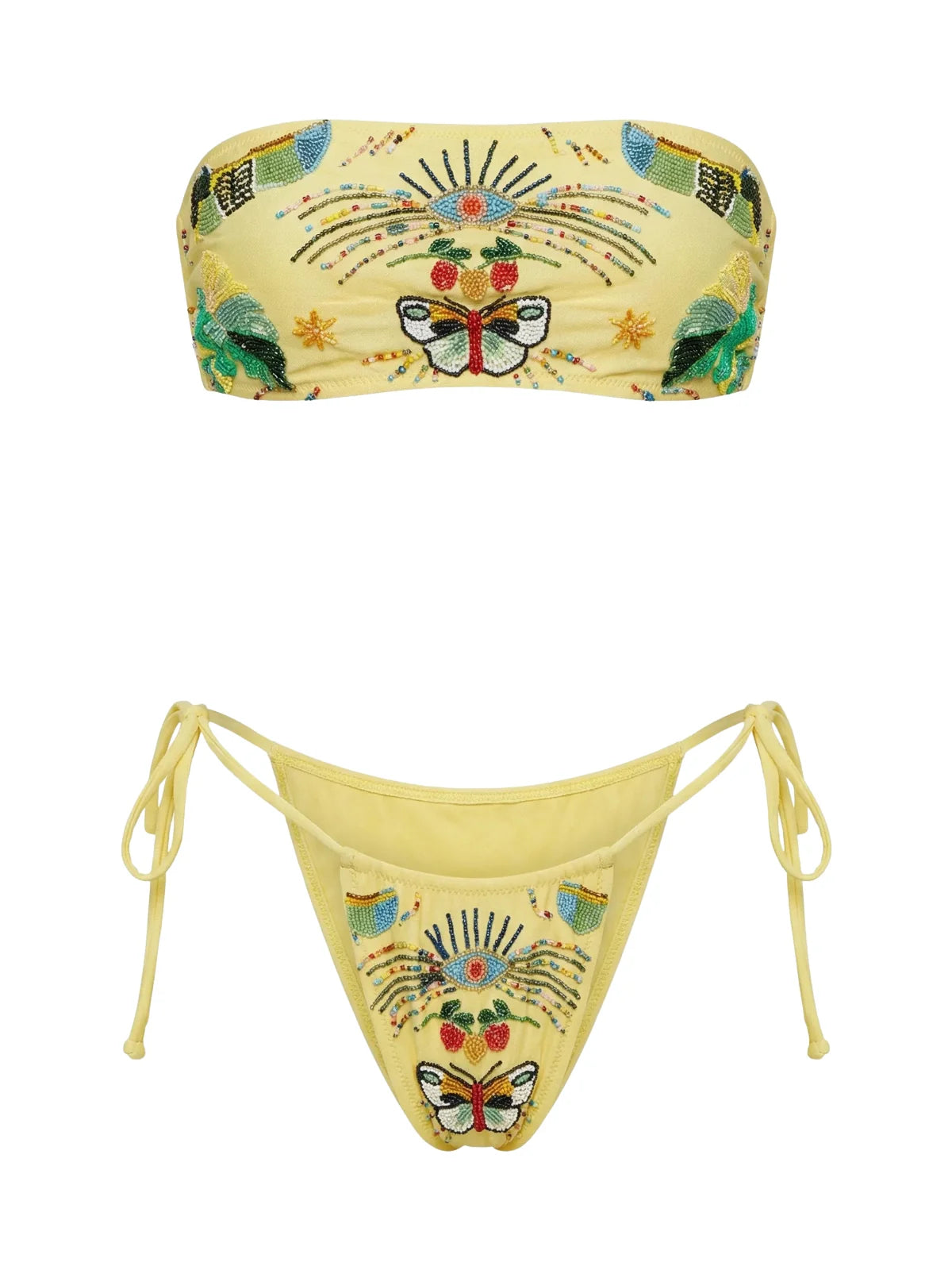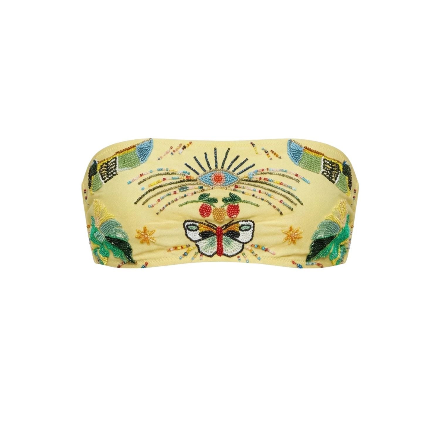 Make a bold statement by the beach or poolside with this beaded bandeau bikini top. Crafted in a soft yellow base, this strapless design is beautifully adorned with intricate hand-beaded motifs, featuring symbolic elements such as an eye, butterfly, and botanical details. Each bead is carefully placed to create a vibrant, artisanal look that feels both playful and luxurious.