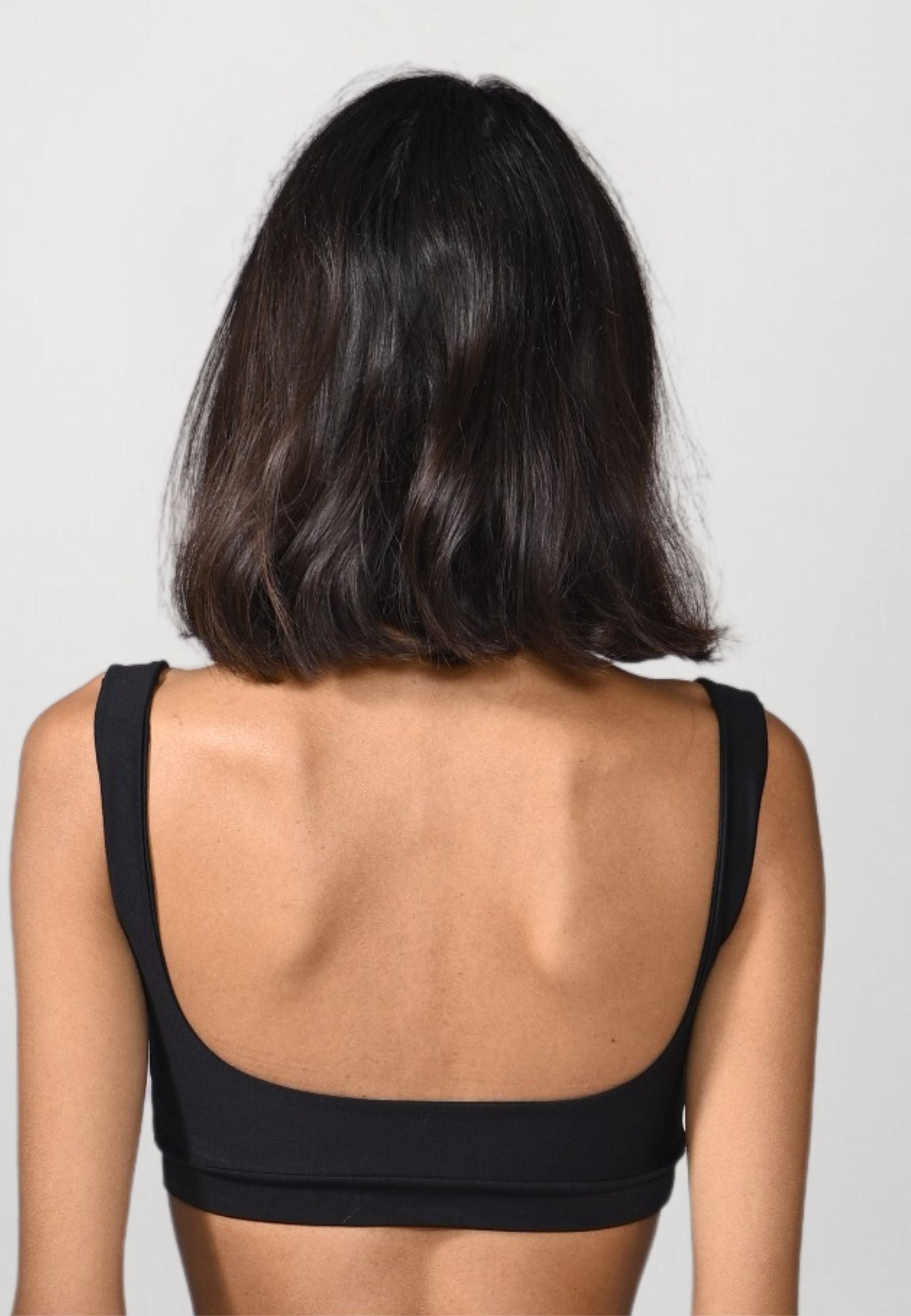 The brassiere top gives a modern and sporty look. Brassière Wide shoulder straps Rounded neckline Removable cups