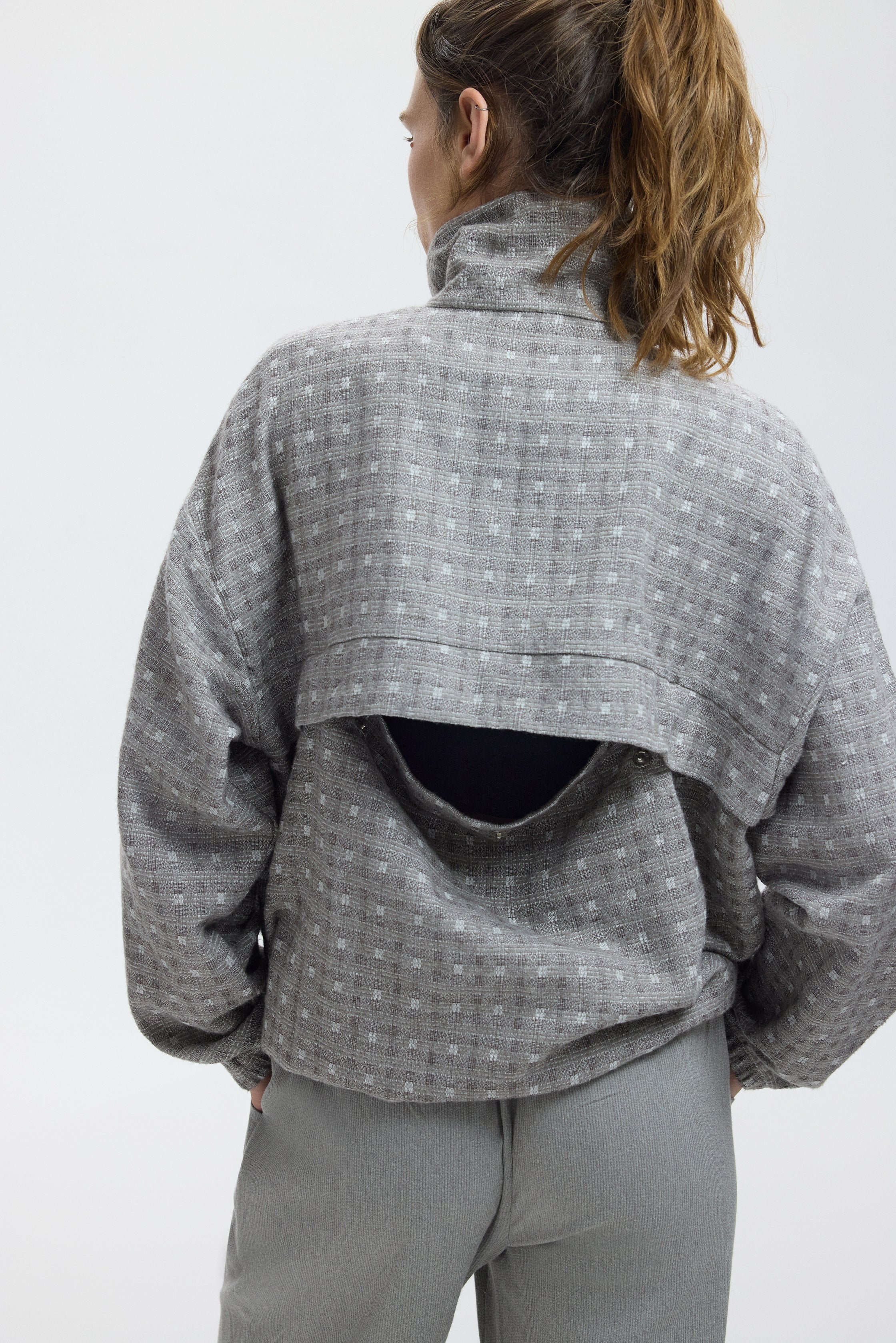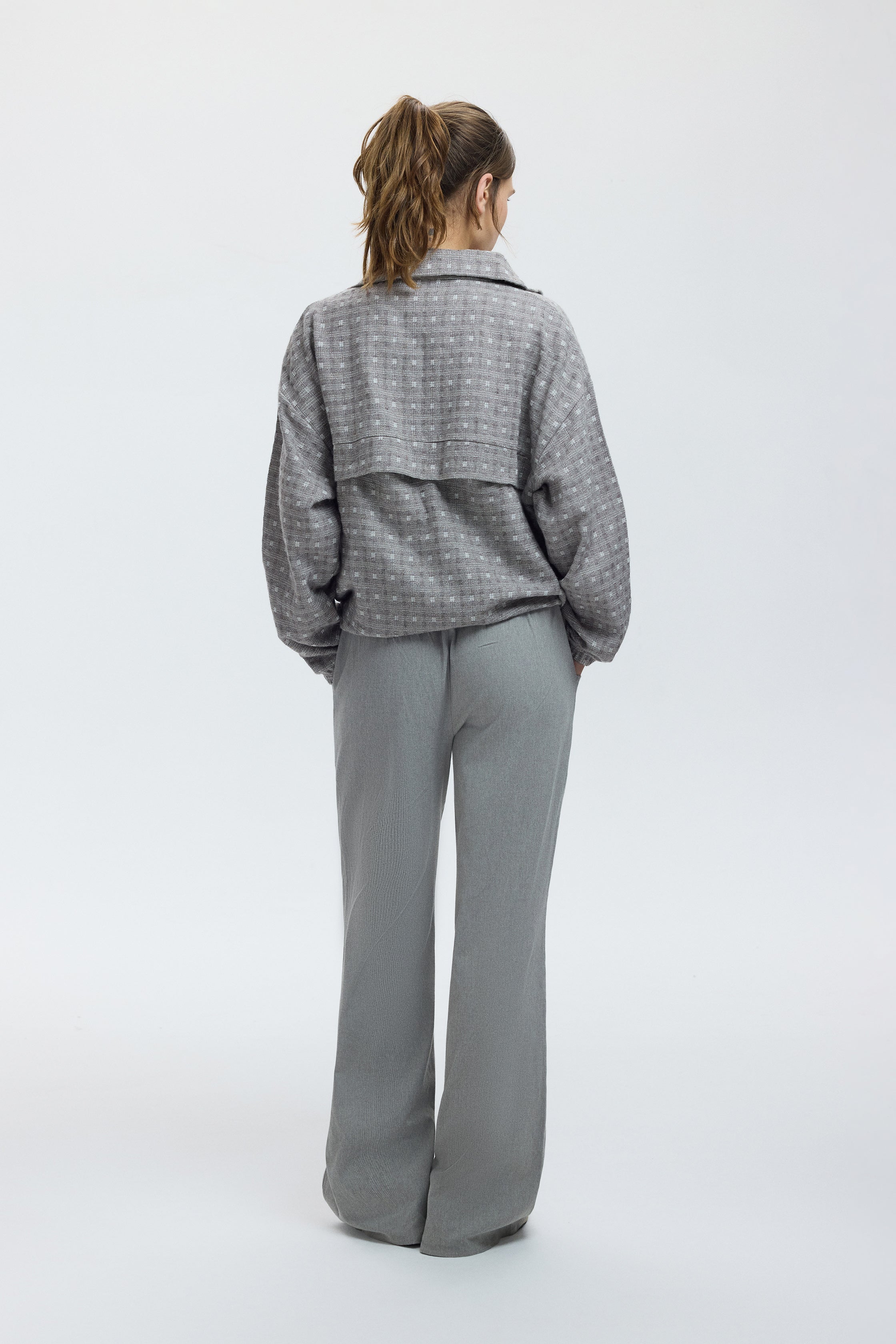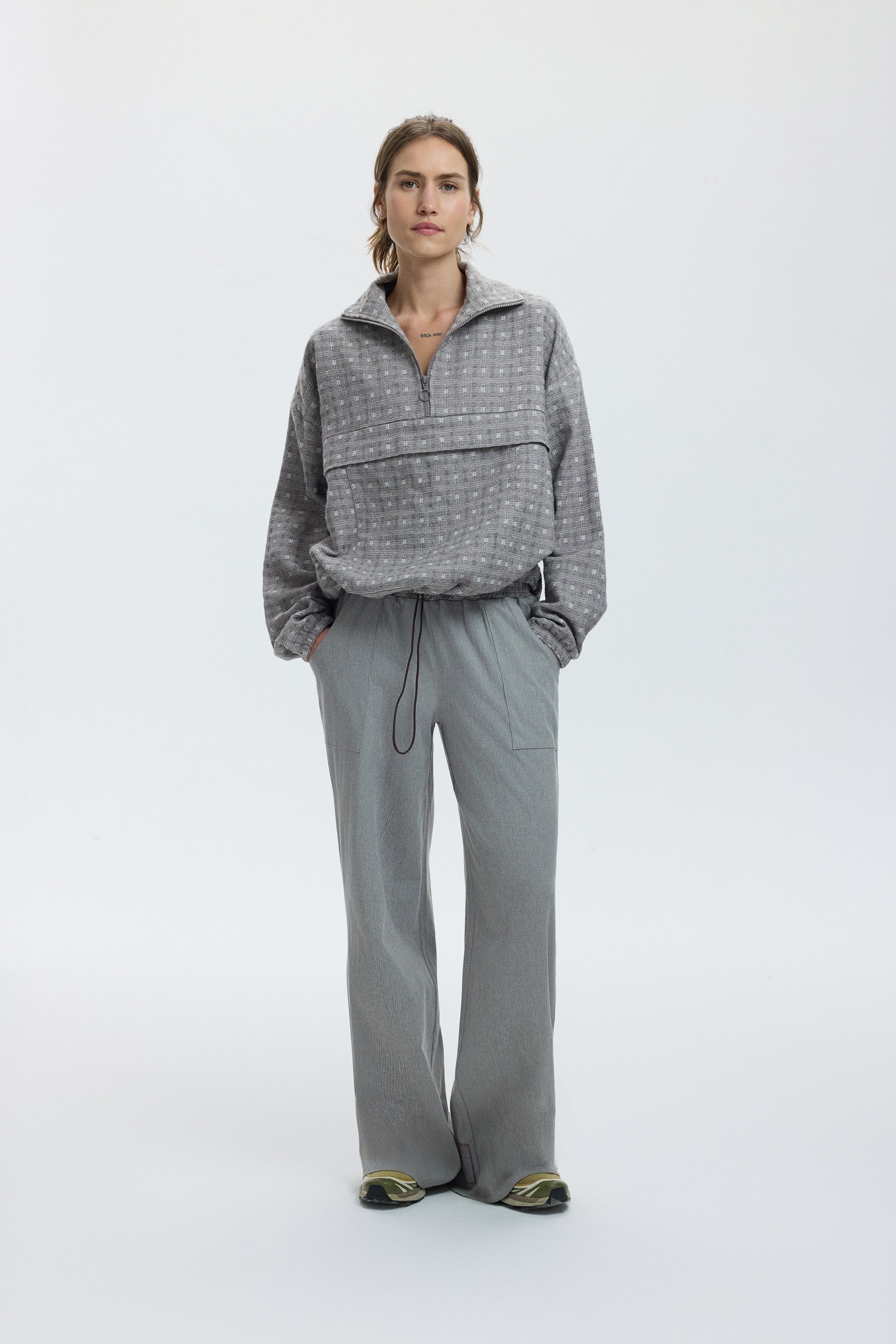 Soft to the touch and comfortable, with a modern cut that feels liberating. The waist can be cinched to create a defined shape or left loose for a relaxed silhouette. In this piece, shades of grey meet an “ash grid” texture, bringing fresh energy to minimalist looks.