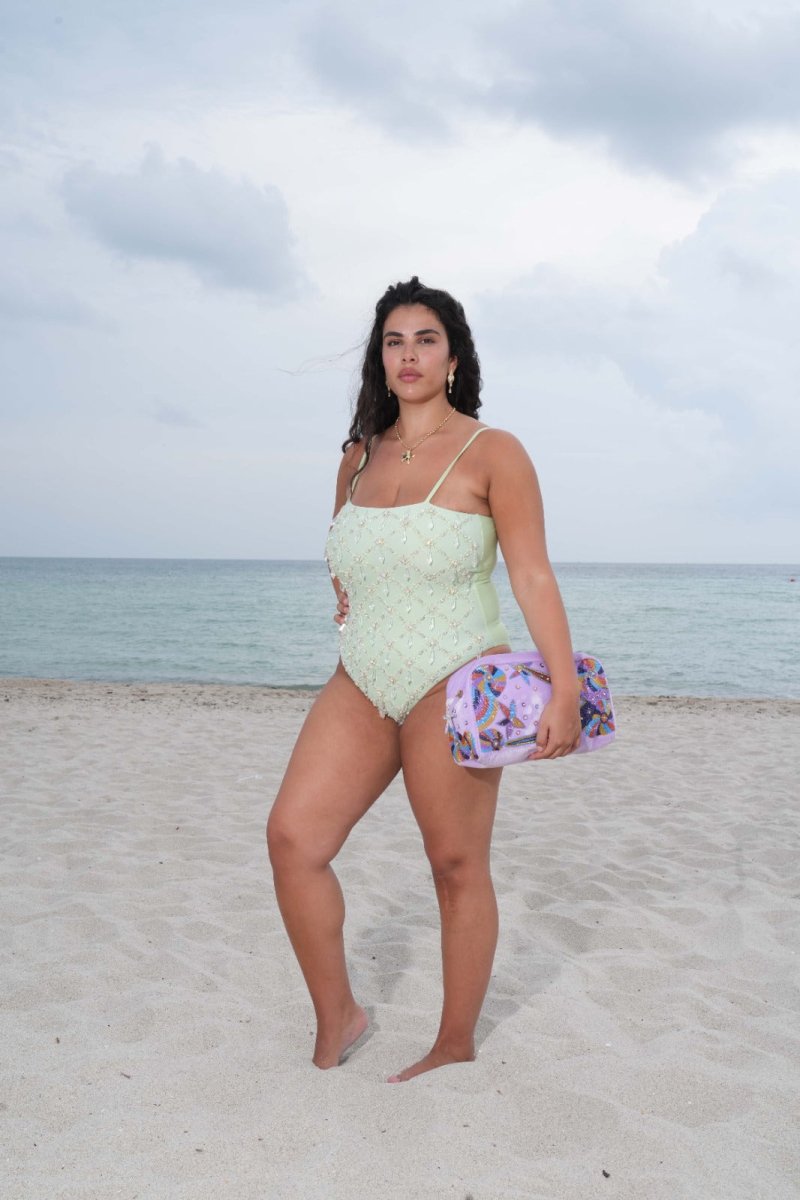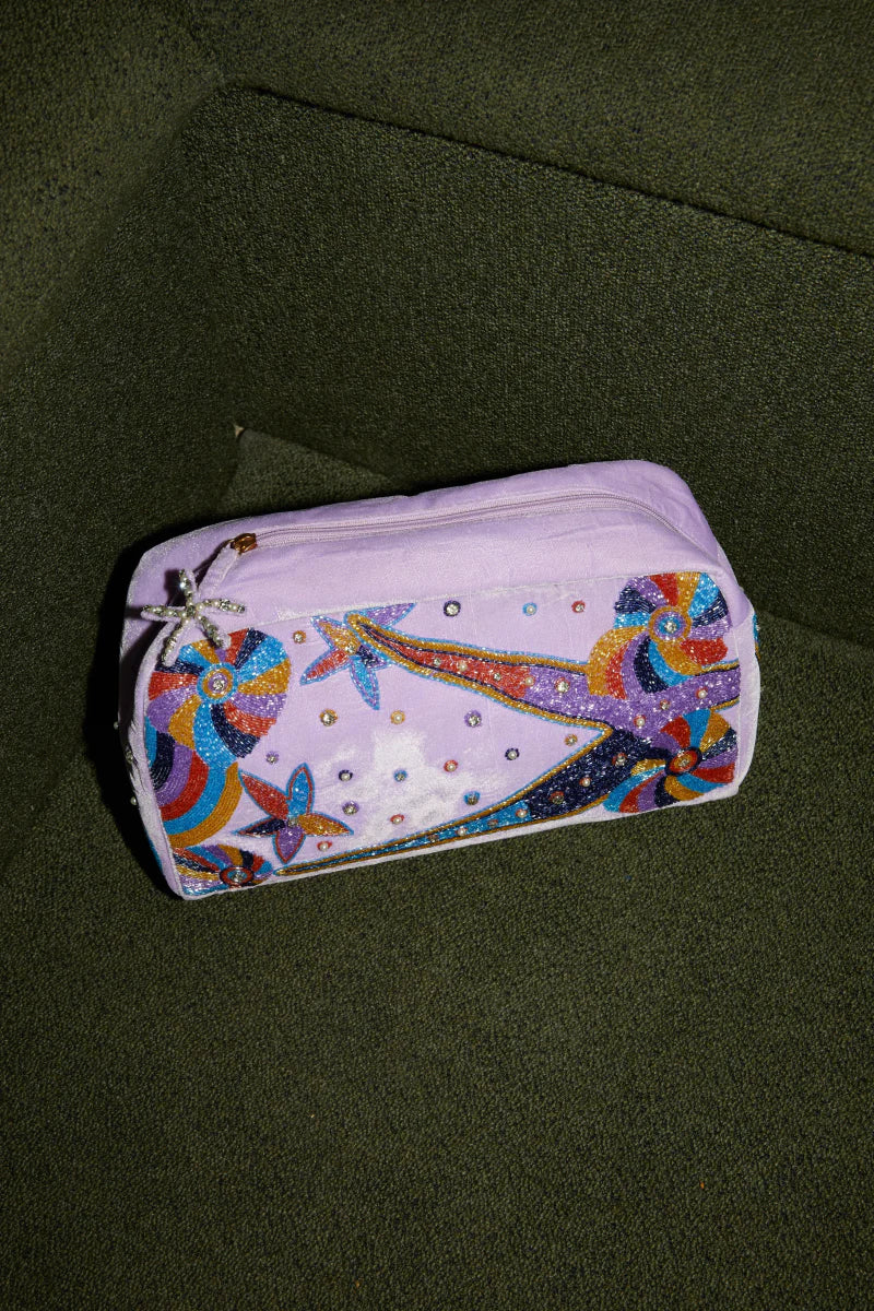 Beauty on the go, with a splash of shimmer. This elegant hand-beaded makeup bag is crafted in plush pastel lilac velvet, inspired by our iconic Crescent Shell Dress. Designed as a luxury cosmetic pouch for women on the move, it features dazzling star motifs and glittering beadwork for a touch of glamorous resort-inspired style. Perfect as a travel toiletry bag, bridesmaid gift, or everyday beauty essentials organizer for holidays, beach trips, or weekend getaways.