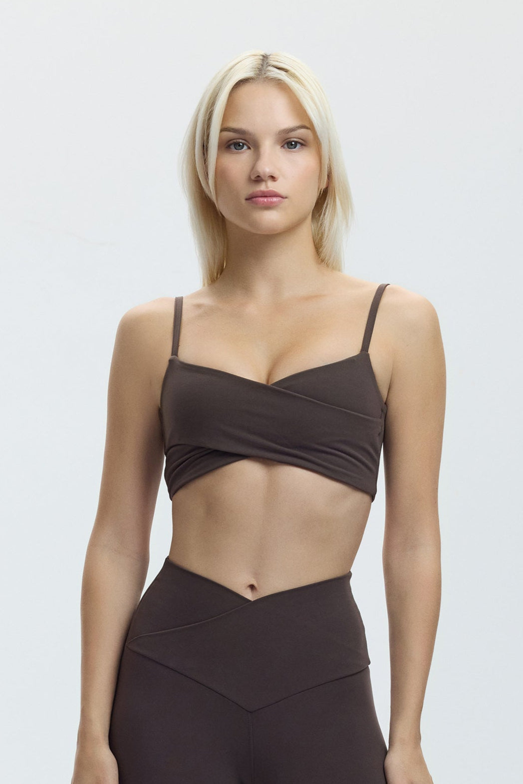 This sports bralette stands out with its overlapping panels in an envelope style at the front, offering both uniqueness and functionality. The thin straps create a light appearance, while the medium-length design comfortably hugs the body. The straps are hook-adjustable and can be worn crossback if desired. Additionally, you can adjust the strap length to suit your body.