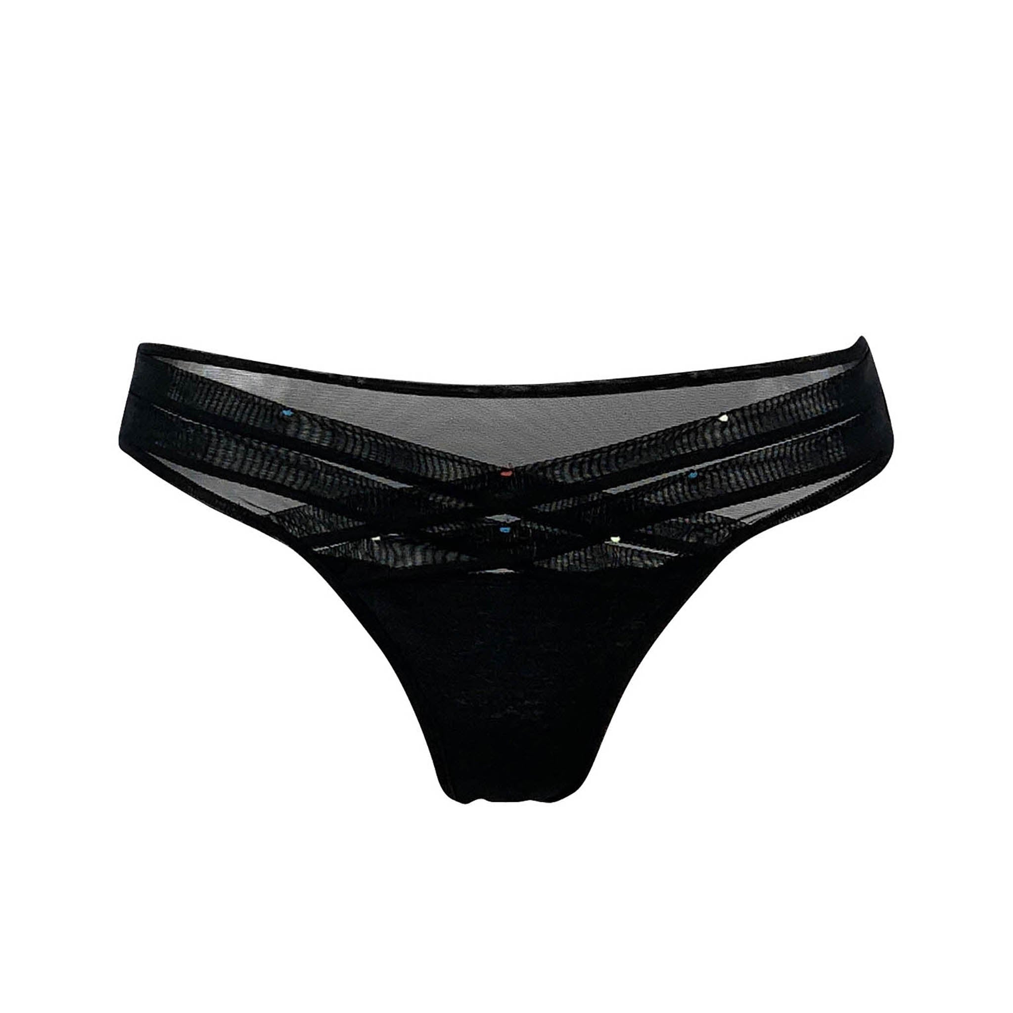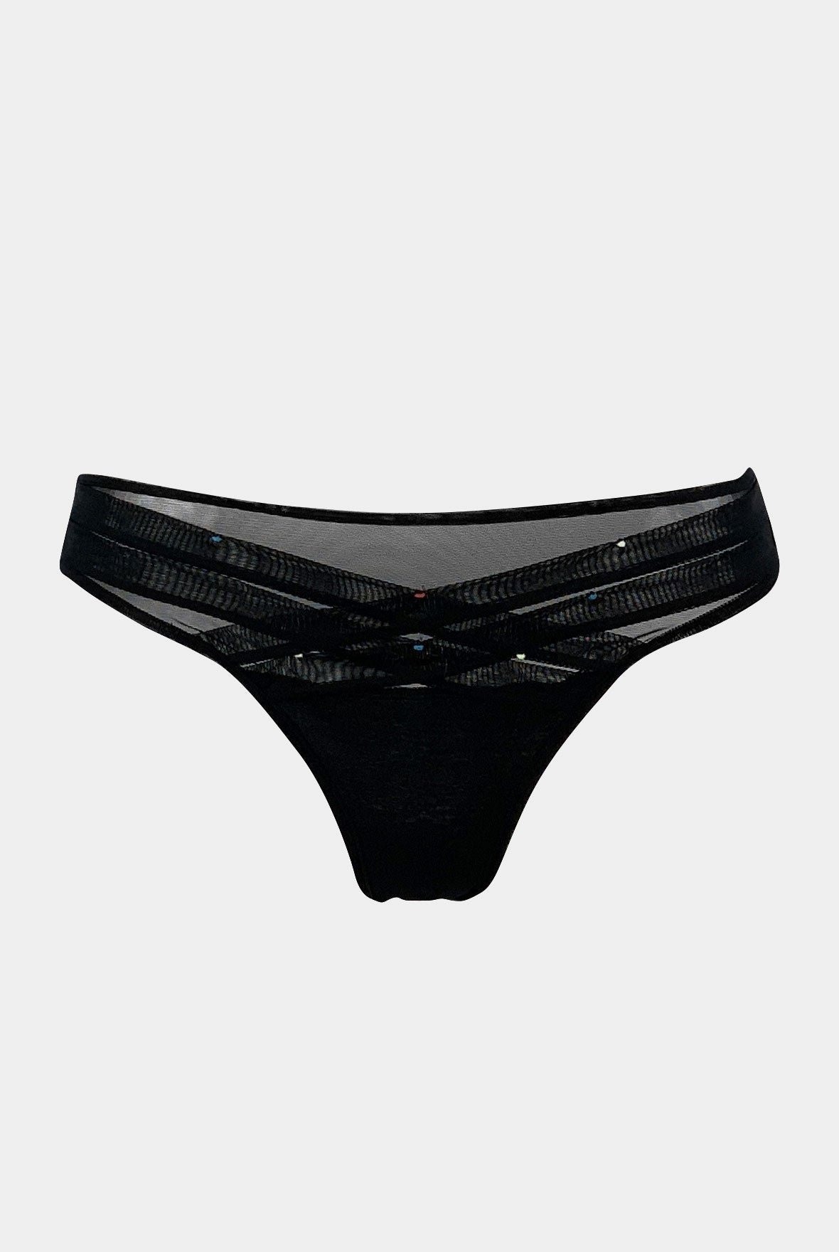 The Crossing Lines bikini is designed from soft Italian tulle. Being almost insensible on the body, this light as a feather item is a top pick for everyday wearing. A creative capsule with bright embroidered strokes and intersecting graphic ribbons gives the nod to the Japanese art of Shibari.
