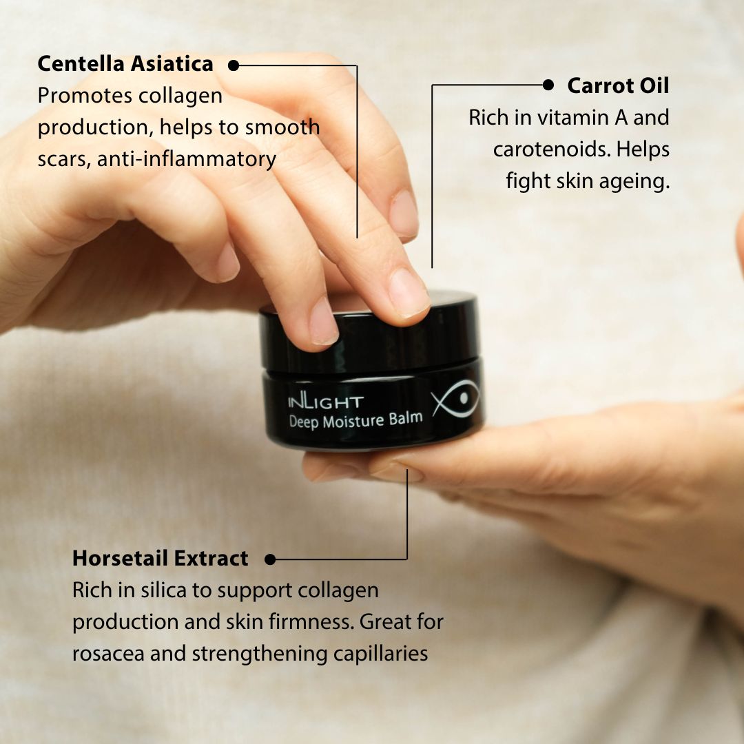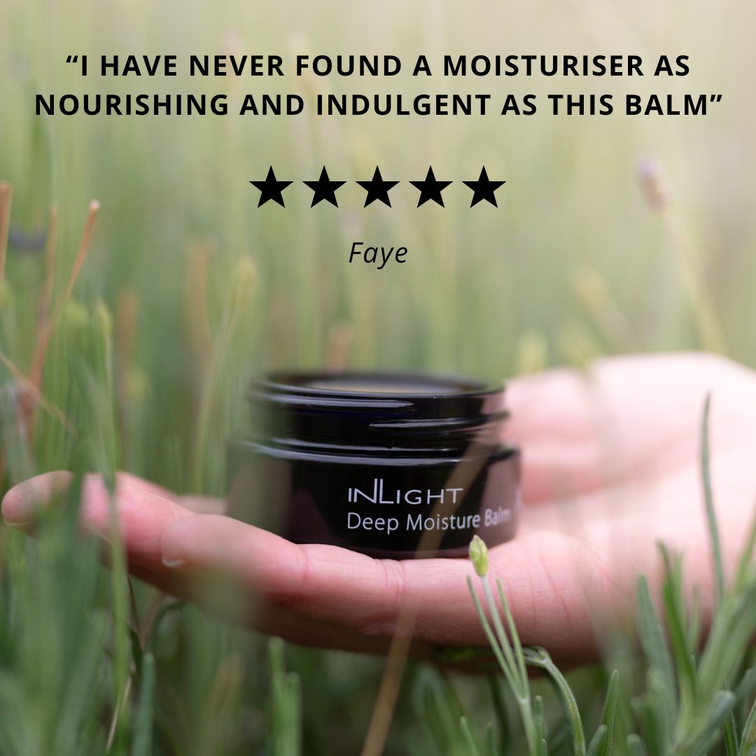 Inlight Deep Moisture Balm has been formulated to intensively repair the skin. Macadamia oil offers invaluable antioxidants in the form of Vitamins A & E and essential fatty acids. Evening primrose, rosehip and carrot oils bathe the skin in moisture and calendula, plantain and gotu kola promote elasticity and tone. The result – skin looks youthful, supple and instantly feels as soft as the caress of a velvet scarf.