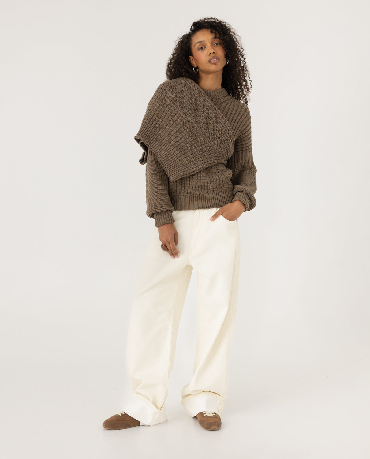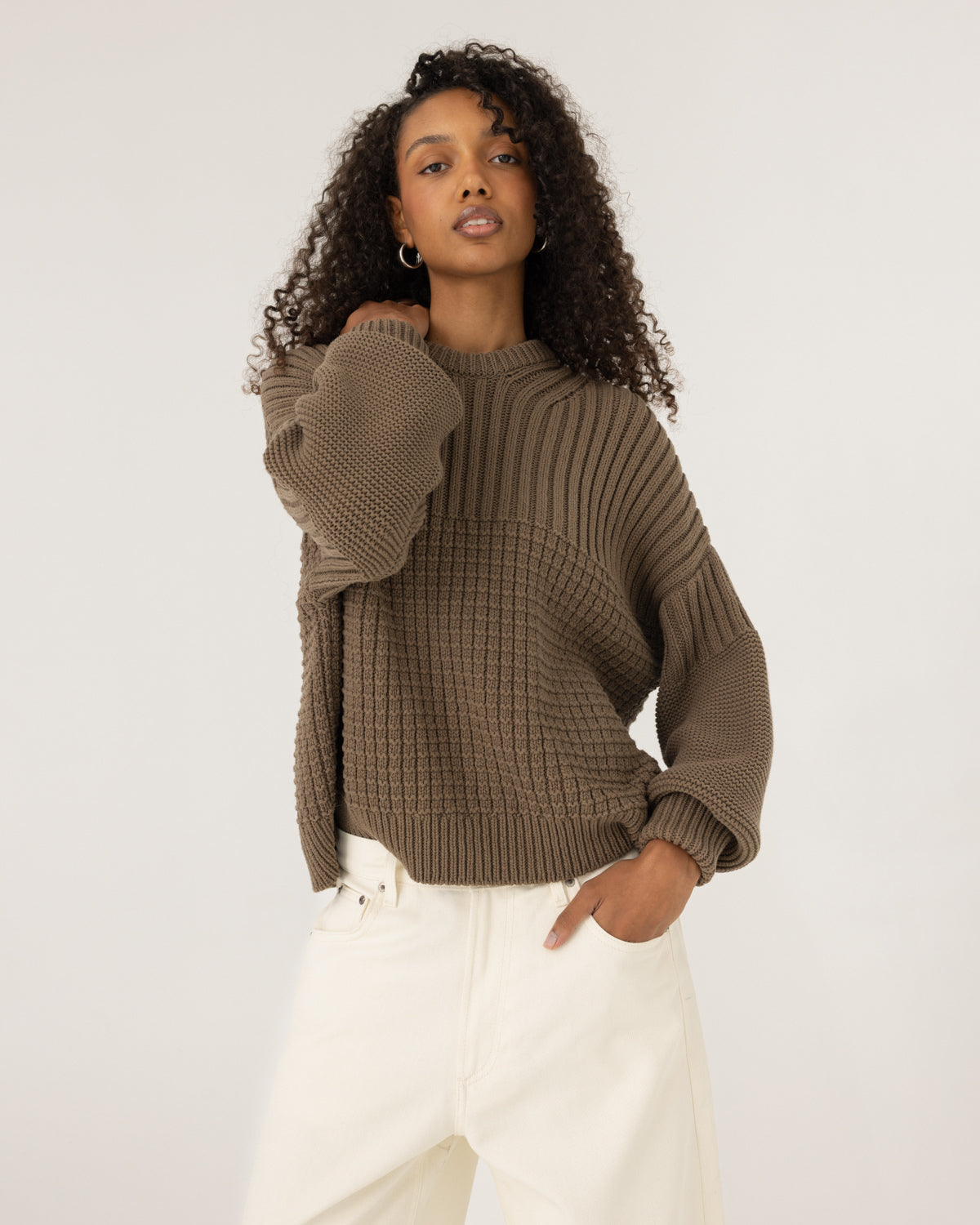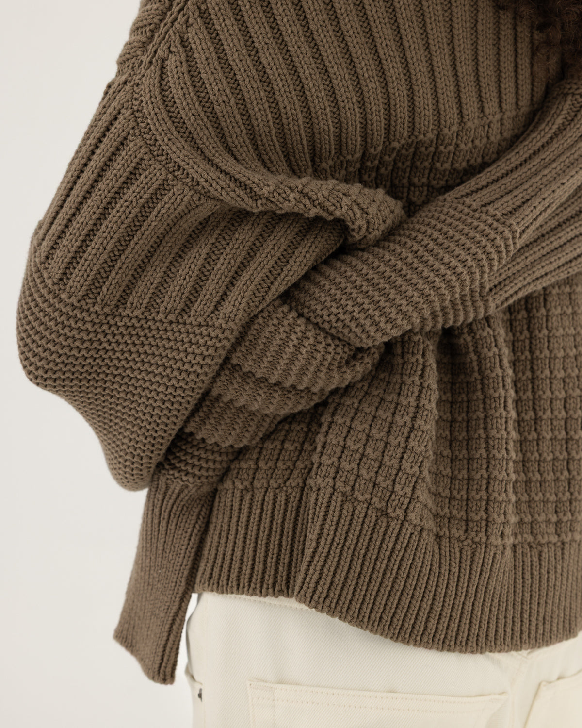 "Delčia" means "half-moon" in Lithuanian, and her half-and-half stitching was inspired by our Baltic pagan roots and the changing cycles of the moon. In pagan culture, people are big believers in the moon's energy and staying in touch with it. The Delčia organic cotton sweater embodies that perfect balance between the two extremes of the young moon and the full moon. Additionally, the sweater is designed with an oversized width that stays consistent across all sizes, providing comfort and a relaxed silhouette for every wearer.